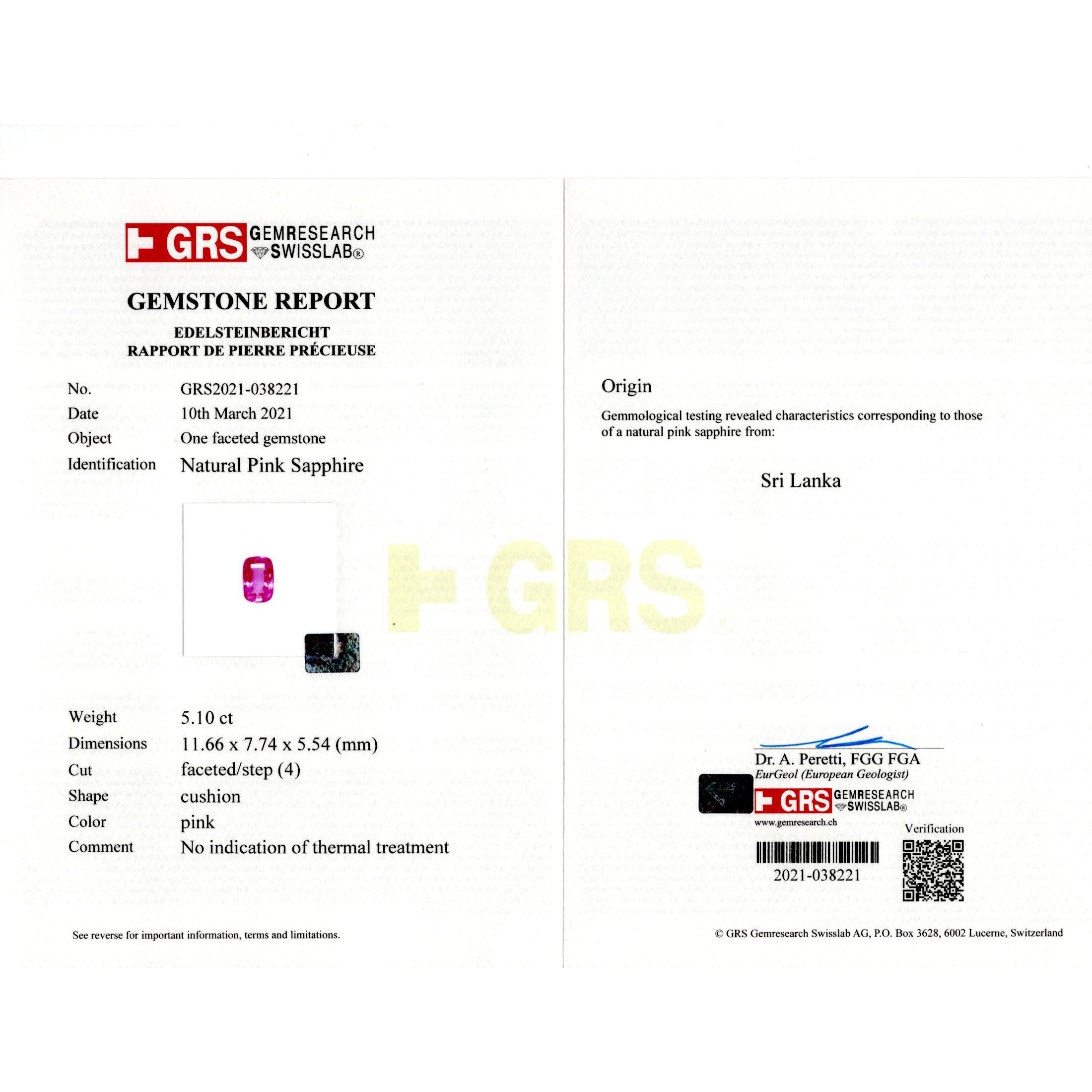 - Accompanied by GRS report stating the sapphire is natural, cushion cut, Ceylon origin, pink color, no heat, weighing 5.10 carats
