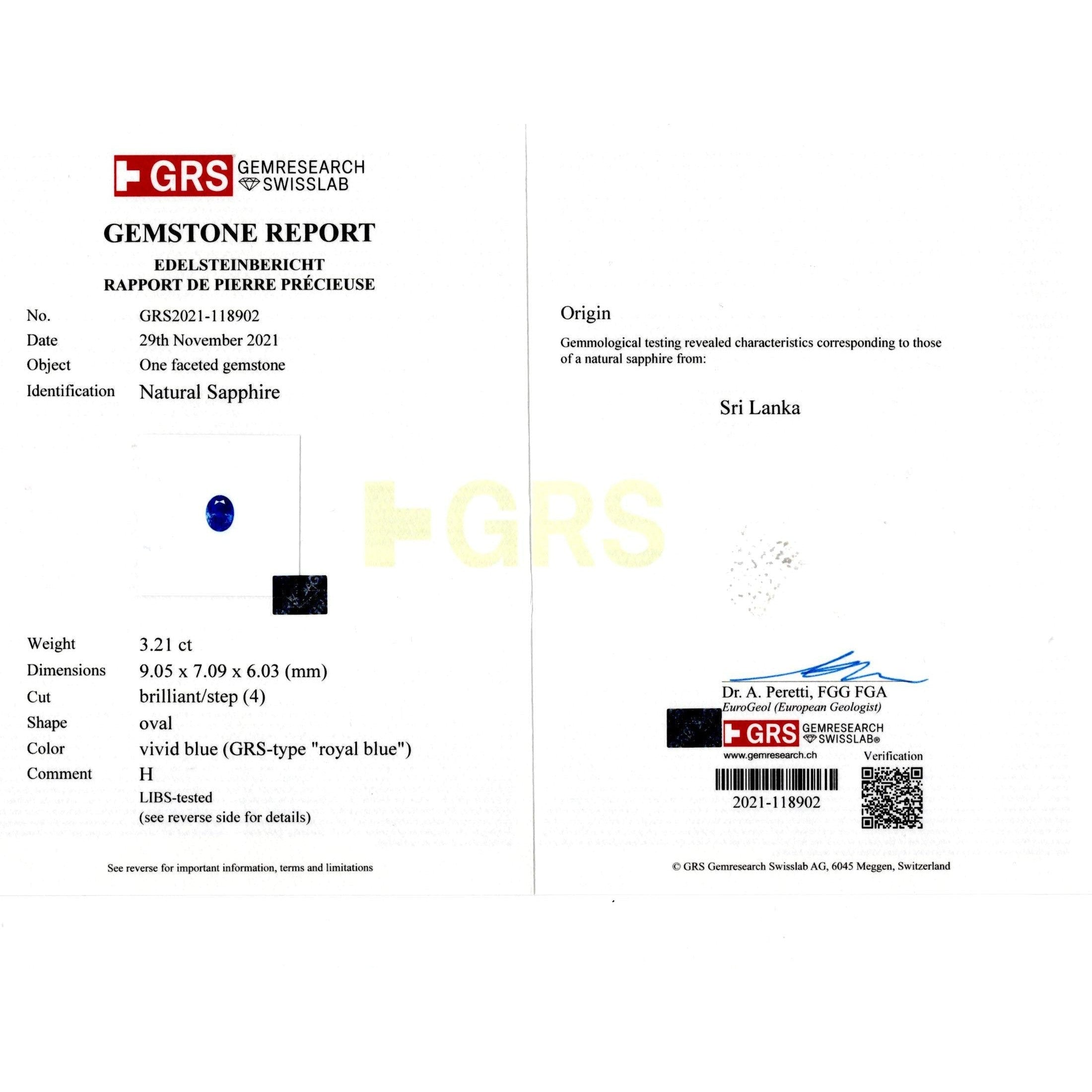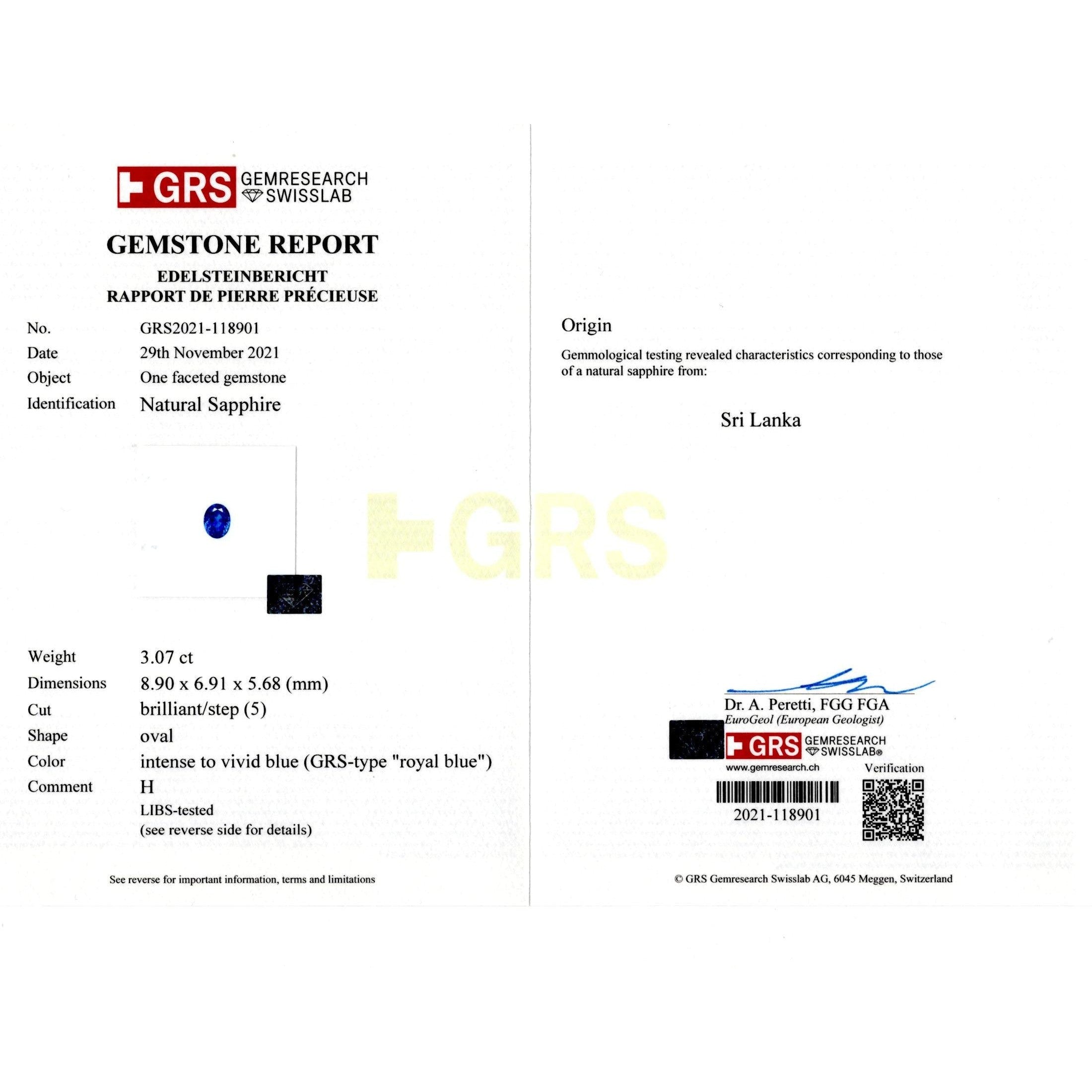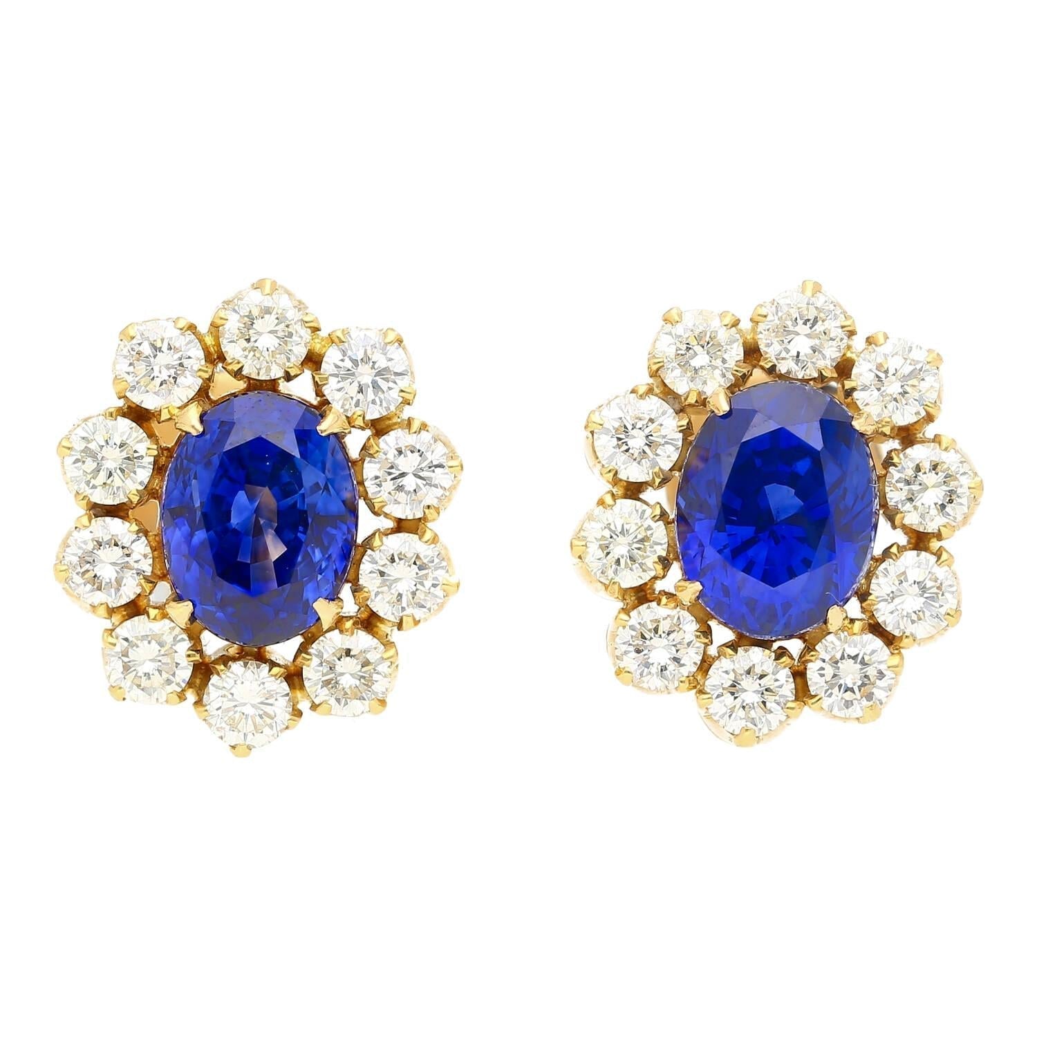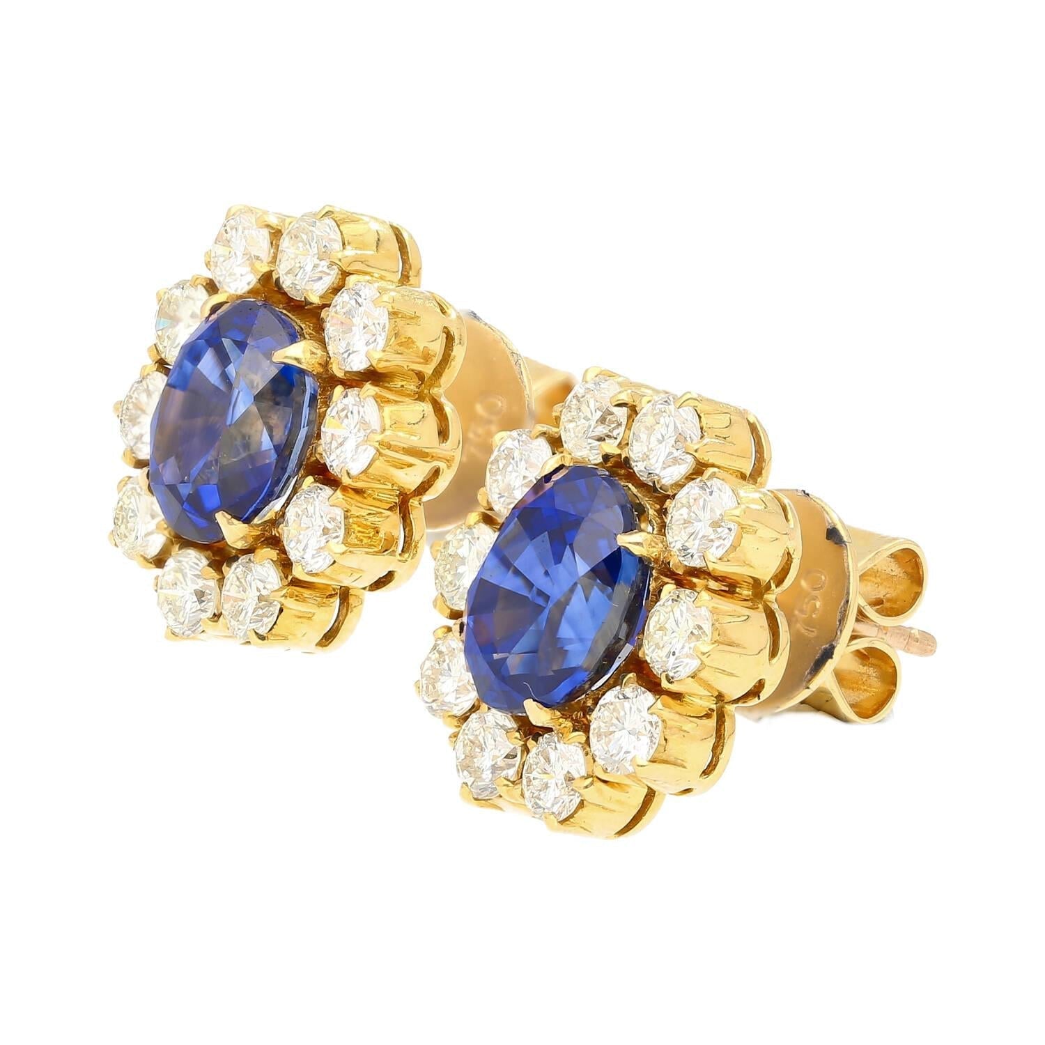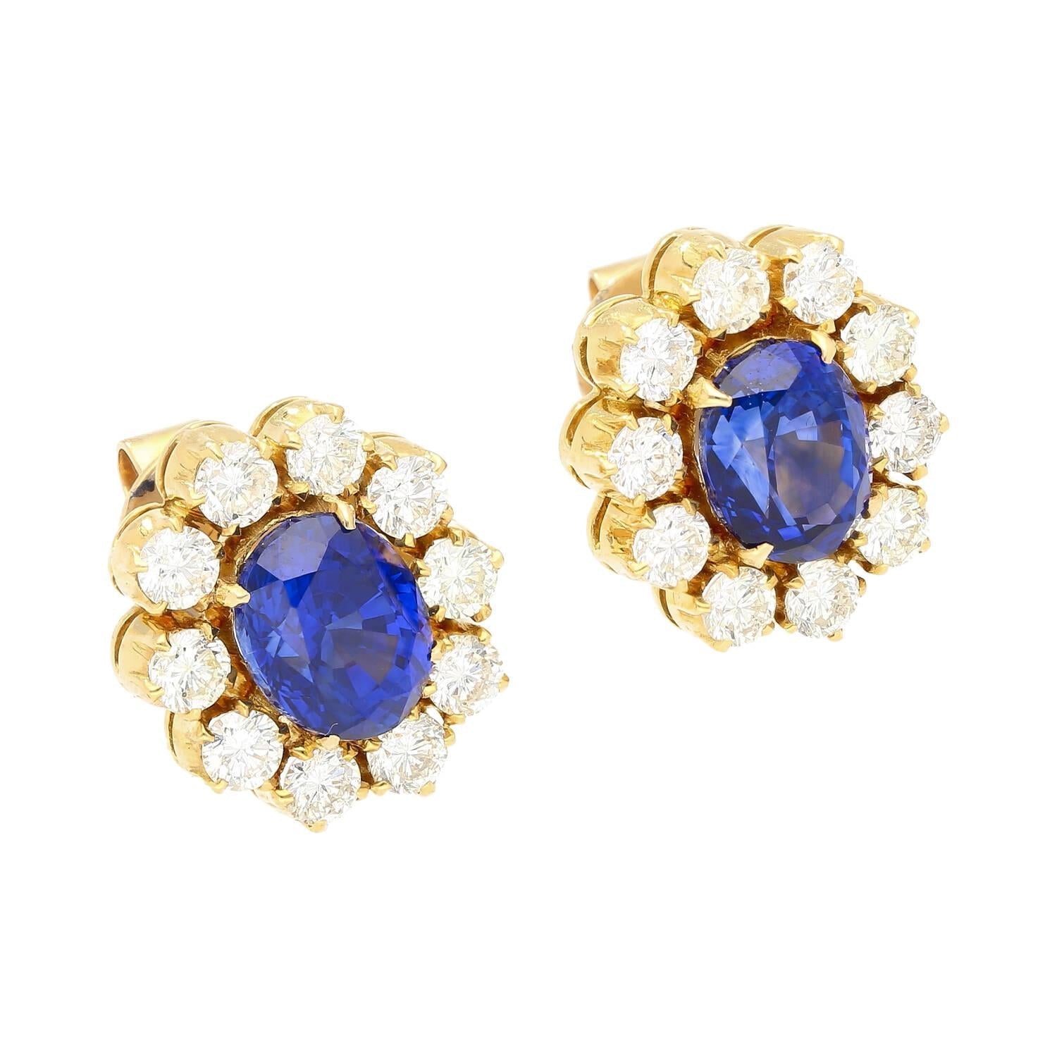 6.28 Carat Total Oval-Cut GRS Certified Royal Blue Ceylon Sapphire with Round-Cut Diamond Halo Stud Earrings in 18k Yellow Gold. Push Back closure, with two GRS certificates.