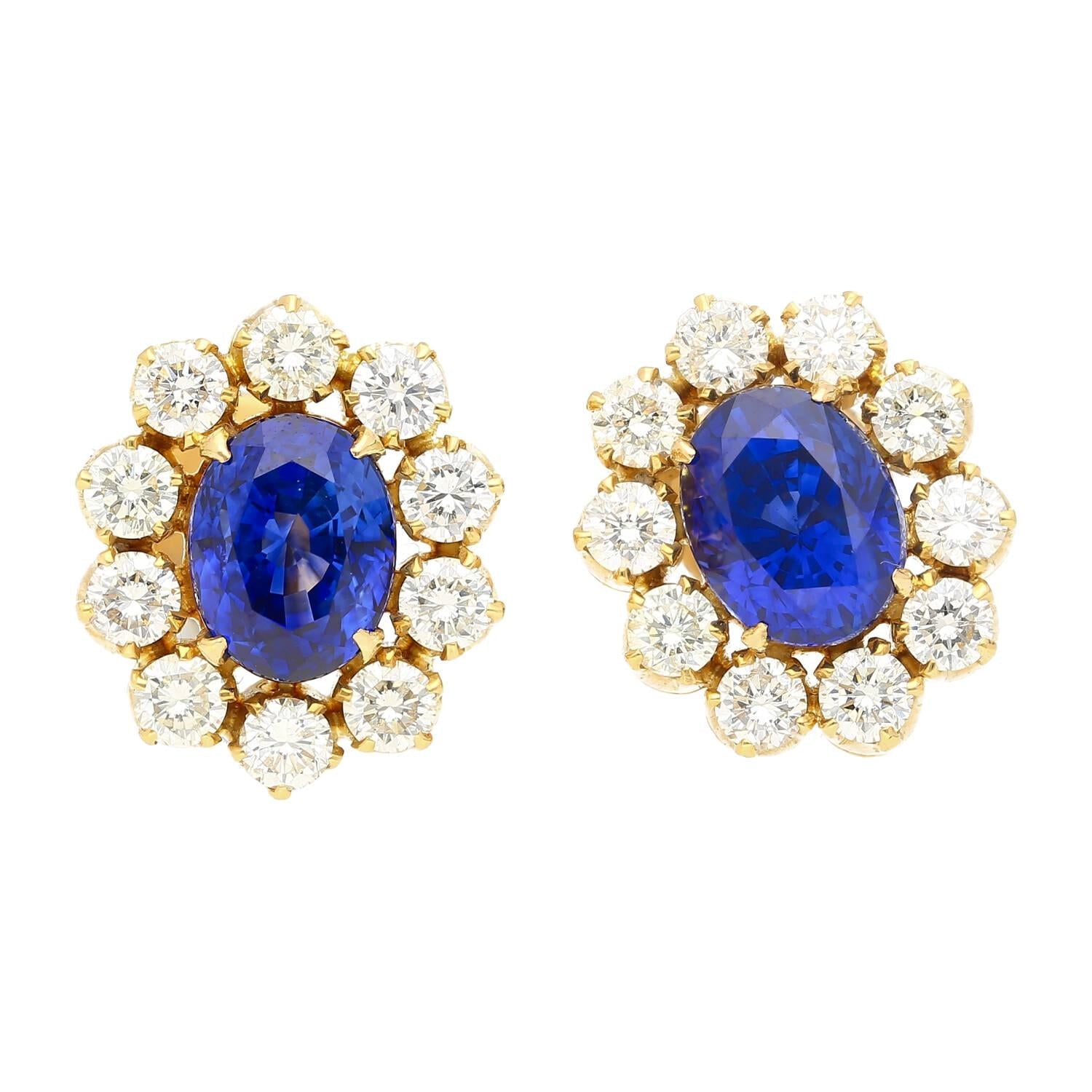 These exquisite earrings feature a stunning matching pair of oval-cut royal blue sapphires from Ceylon, Sri Lanka, beautifully set in 18K yellow gold. The Sapphires are 3.21 carats, and Each earring showcases two vibrant sapphires, complemented by 20 round-cut diamonds totaling 3.07 carats. Weighing 11.06 grams, these earrings combine the rich, deep blue of the sapphires with the sparkling brilliance of the diamonds, making them a striking statement piece that exudes elegance and sophistication. Perfect for adding a touch of luxury to any outfit.