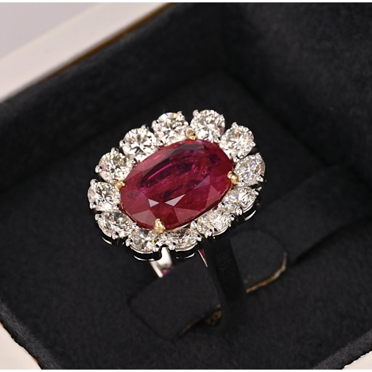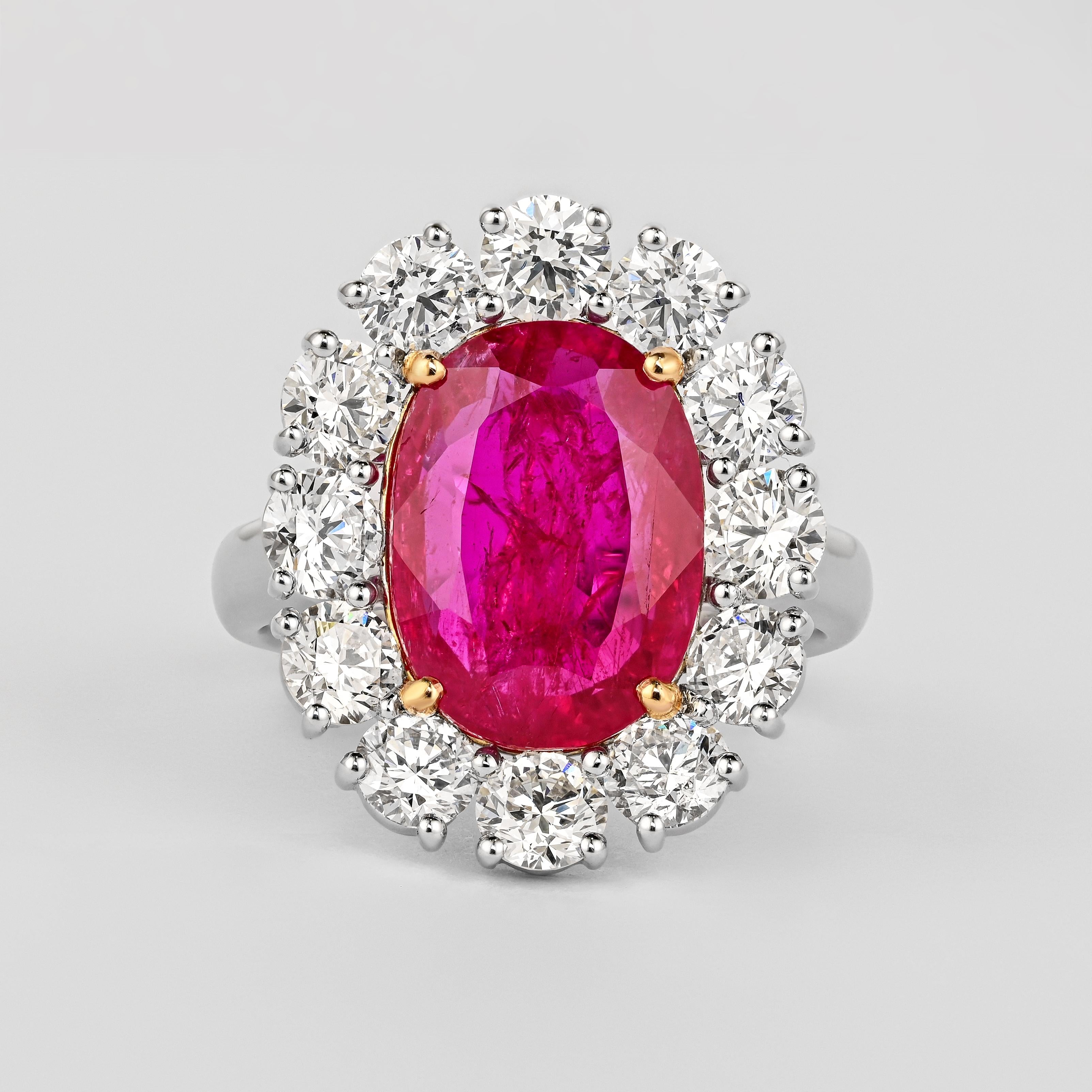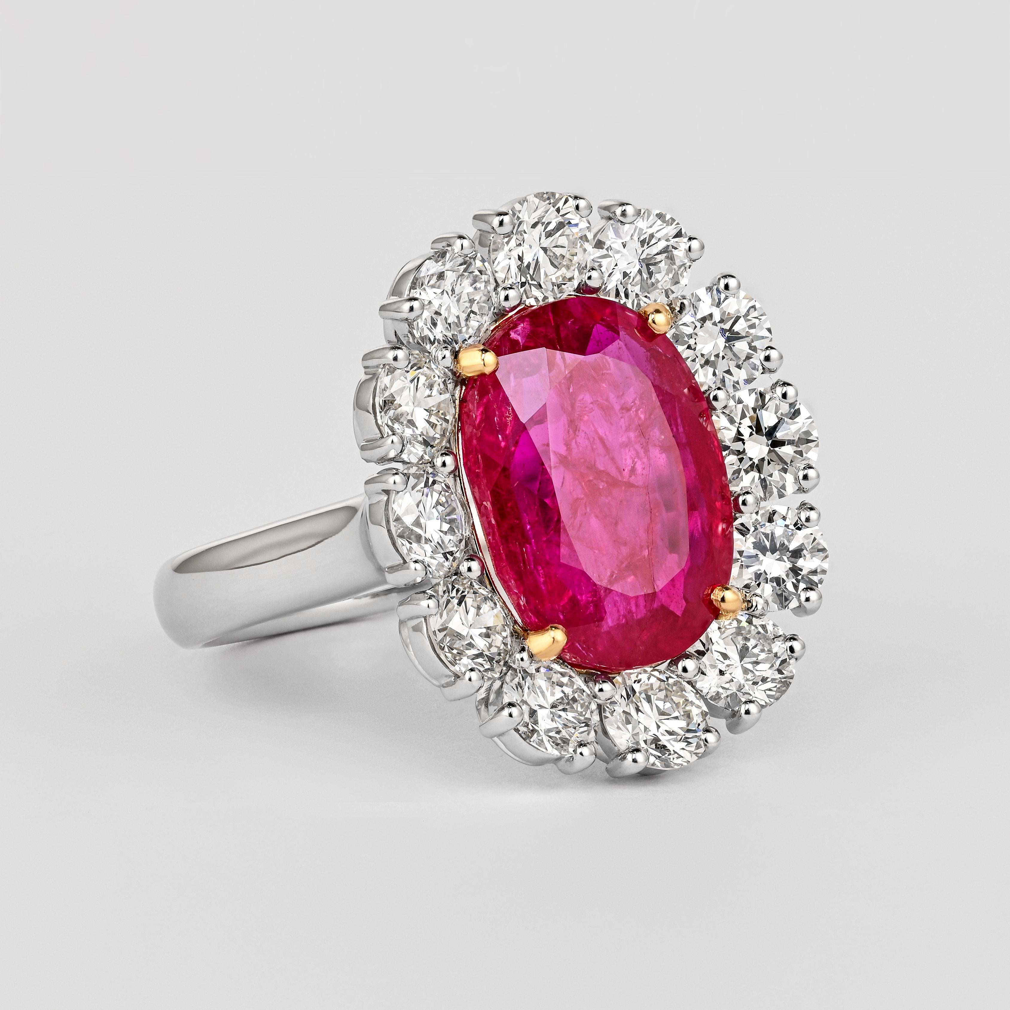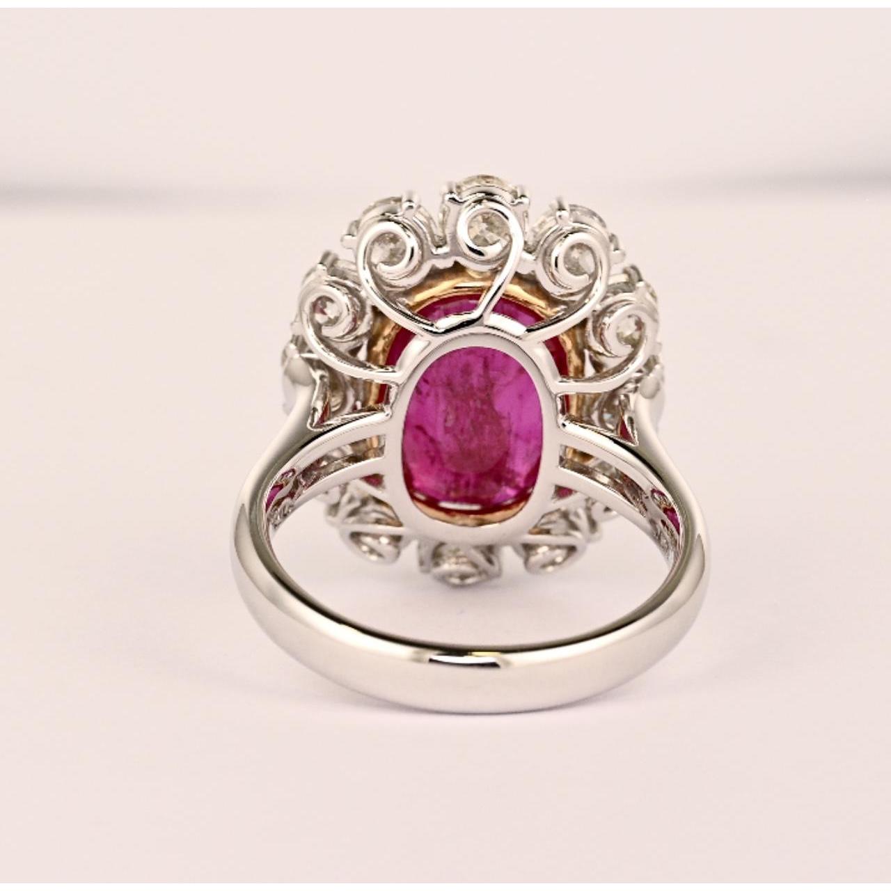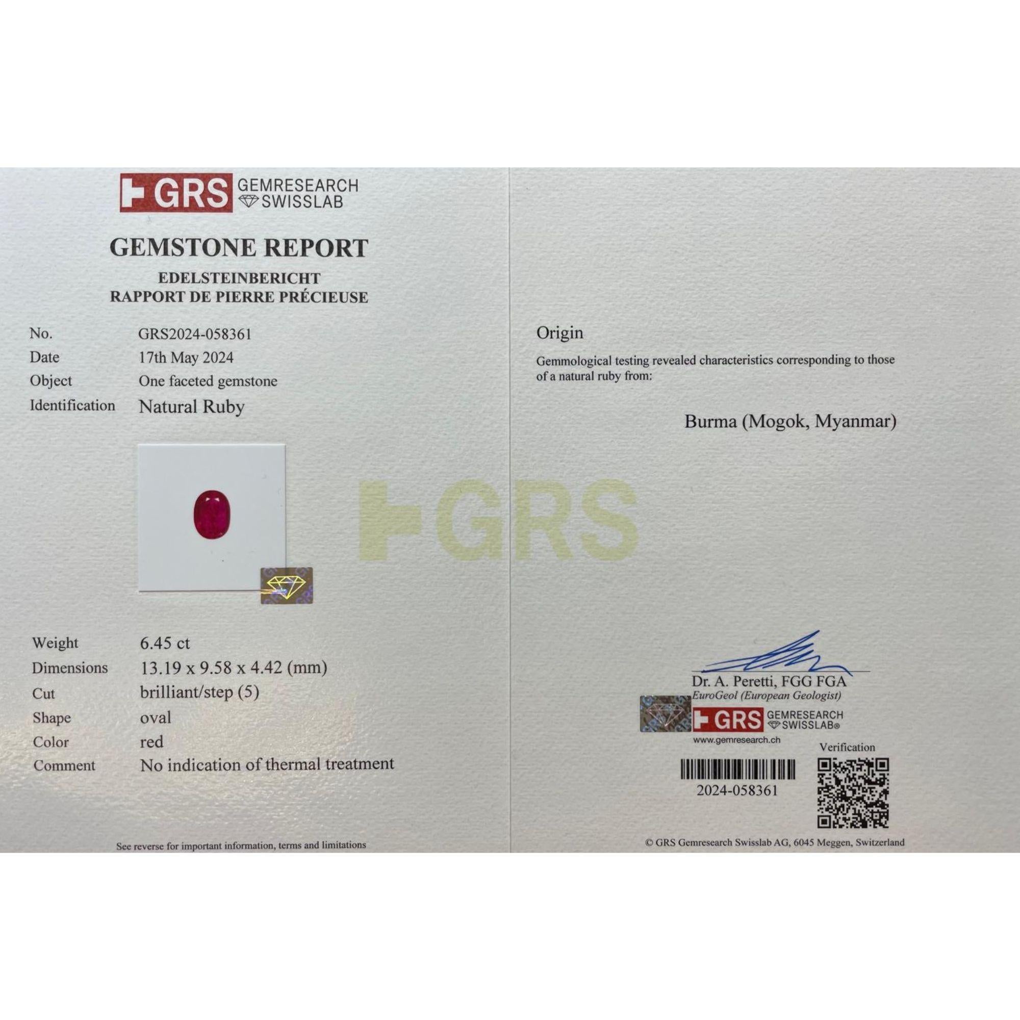 GRS Certified 6.45 carat unheated oval cut Ruby from Burma. Adorned with a diamond halo of 12 round cut white diamonds totaling 2.96 carats (0.25ct each). All set in a luxurious 18K white gold band with a floral basket mounting the center stone and an open back.