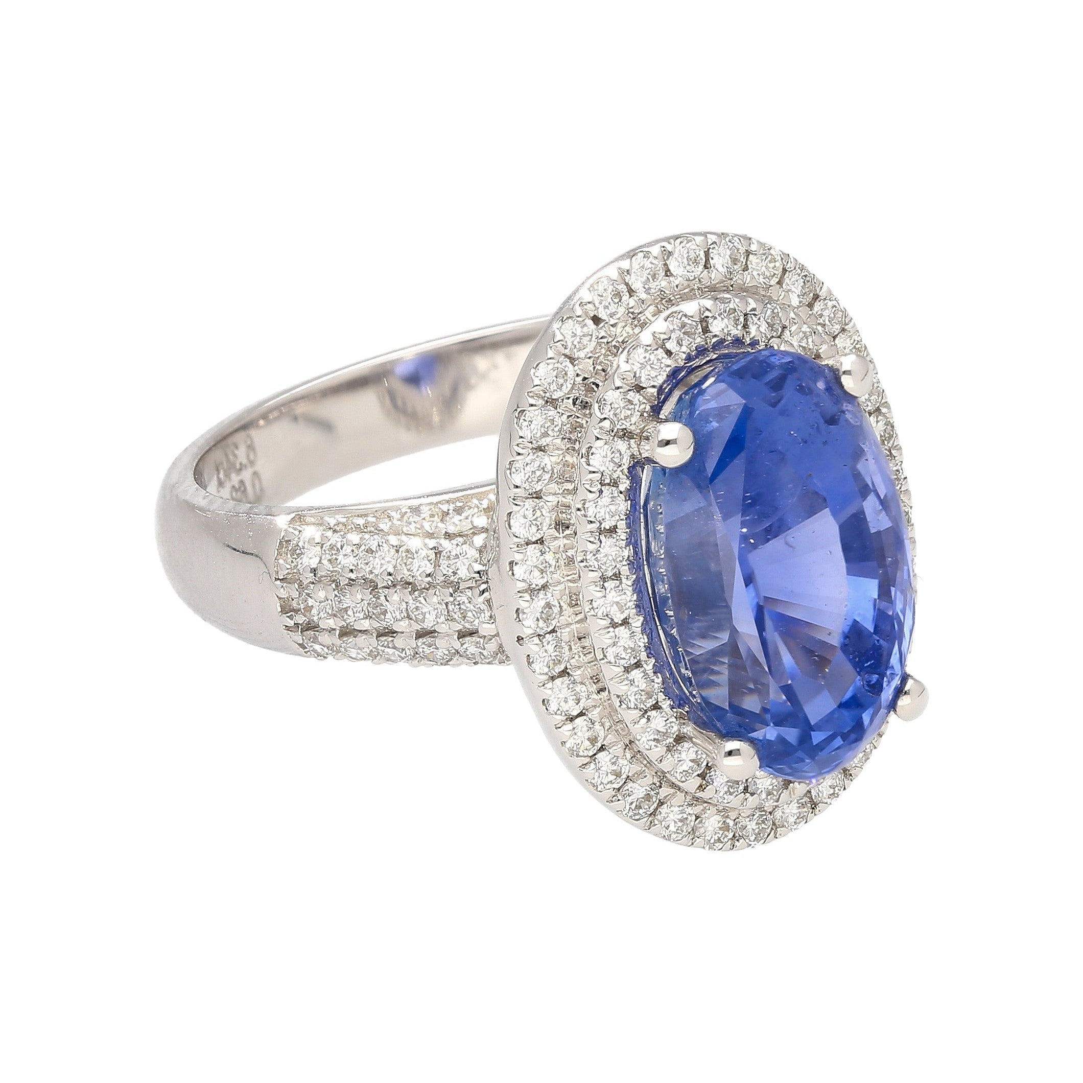 GRS certified 6.34 carat natural blue sapphire set in an 18K white gold diamond halo ring. This is an oval cut sapphire ring with round cut diamond halo accents and an open prong setting.