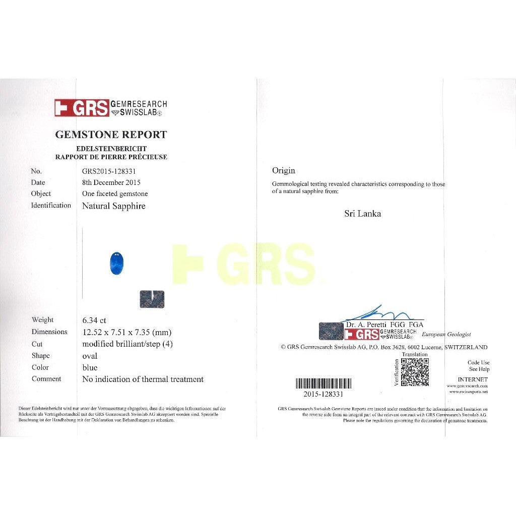- Accompanied by GRS report no. GRS2015-128331 stating the sapphire is natural, Sri Lanka origin, blue color, oval cut, and unheated