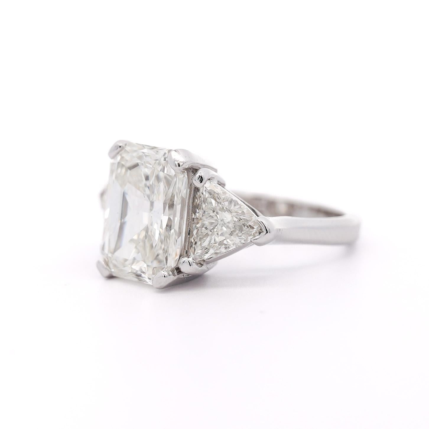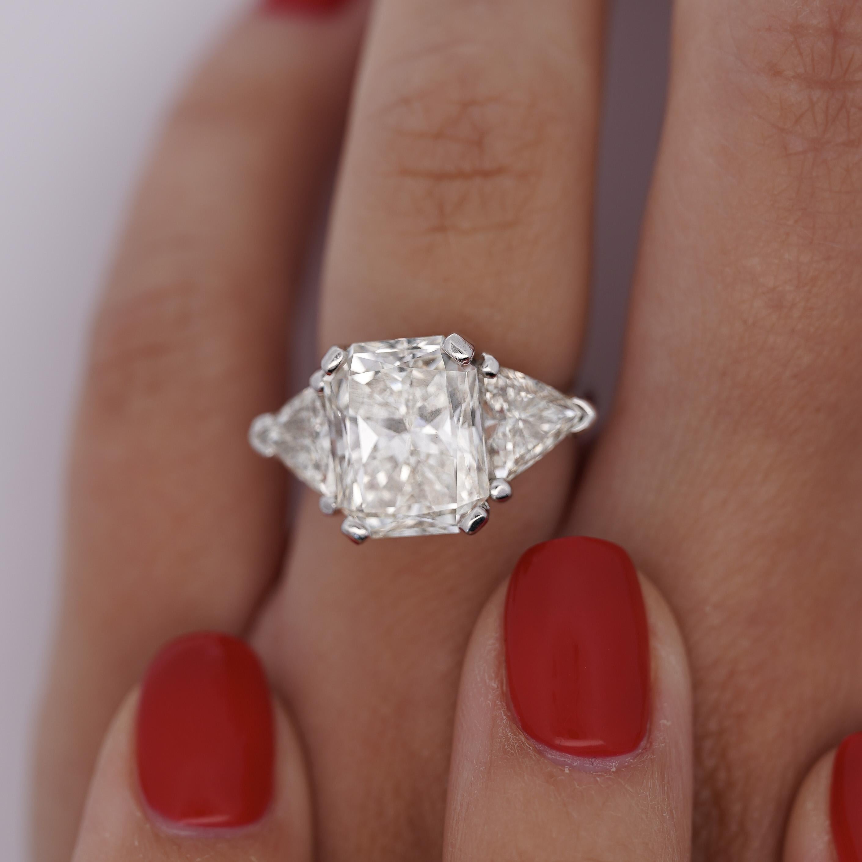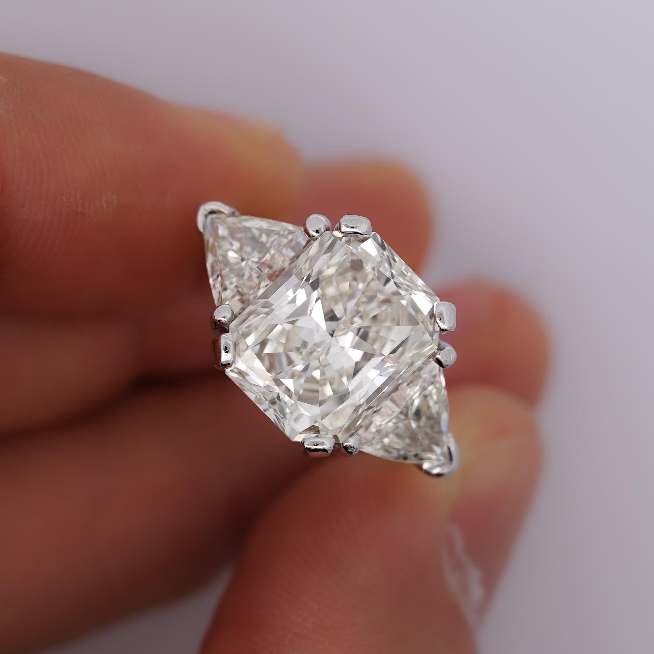 Natural 6.08 Carat Radiant Cut H/VS1 Diamond Three Stone Engagement Ring In Platinum. Set with 2 Trillion Cut Diamond Side Stones. Ring Size 6, adjustable.