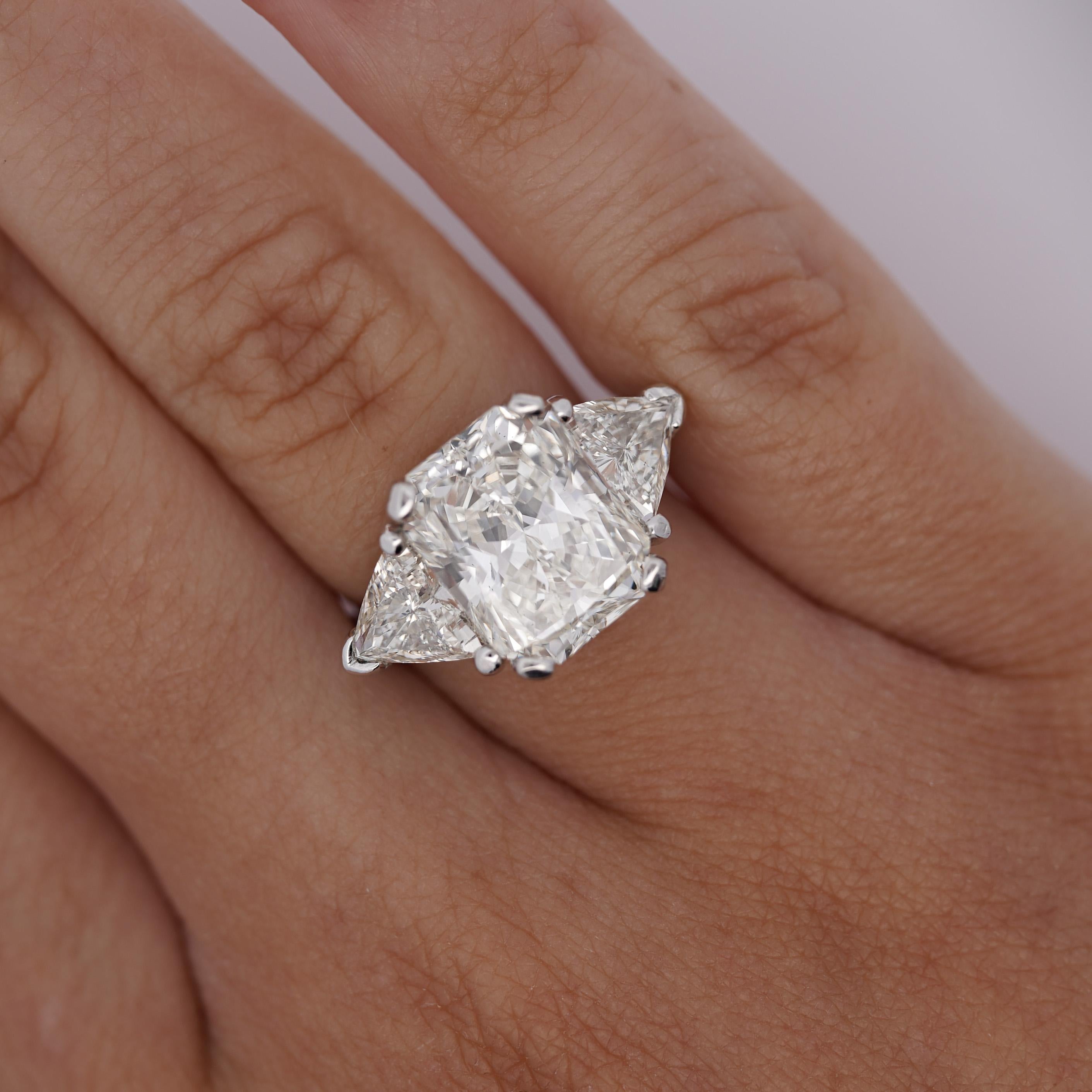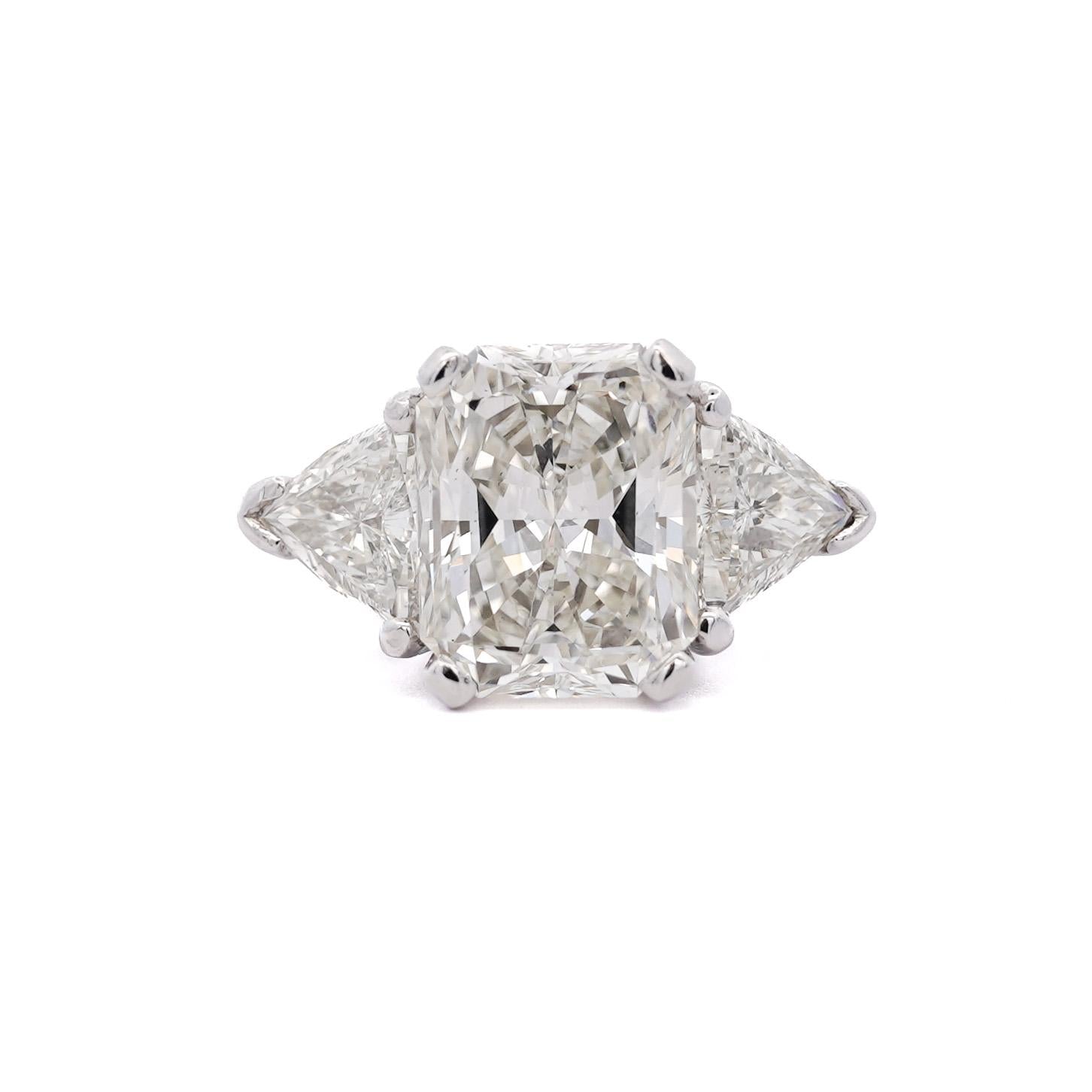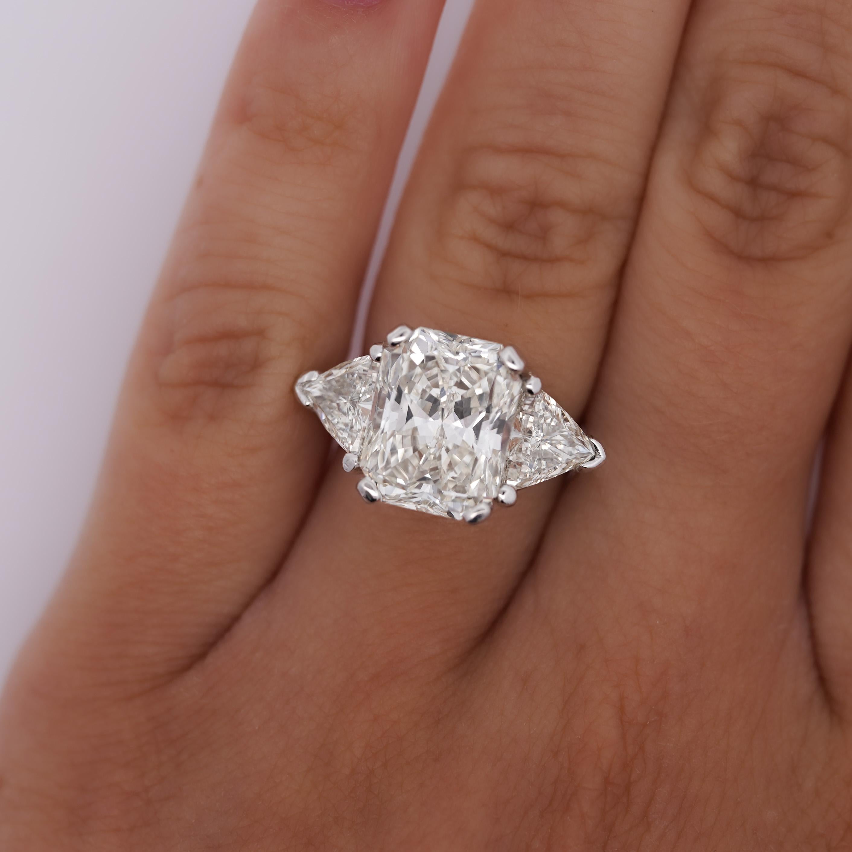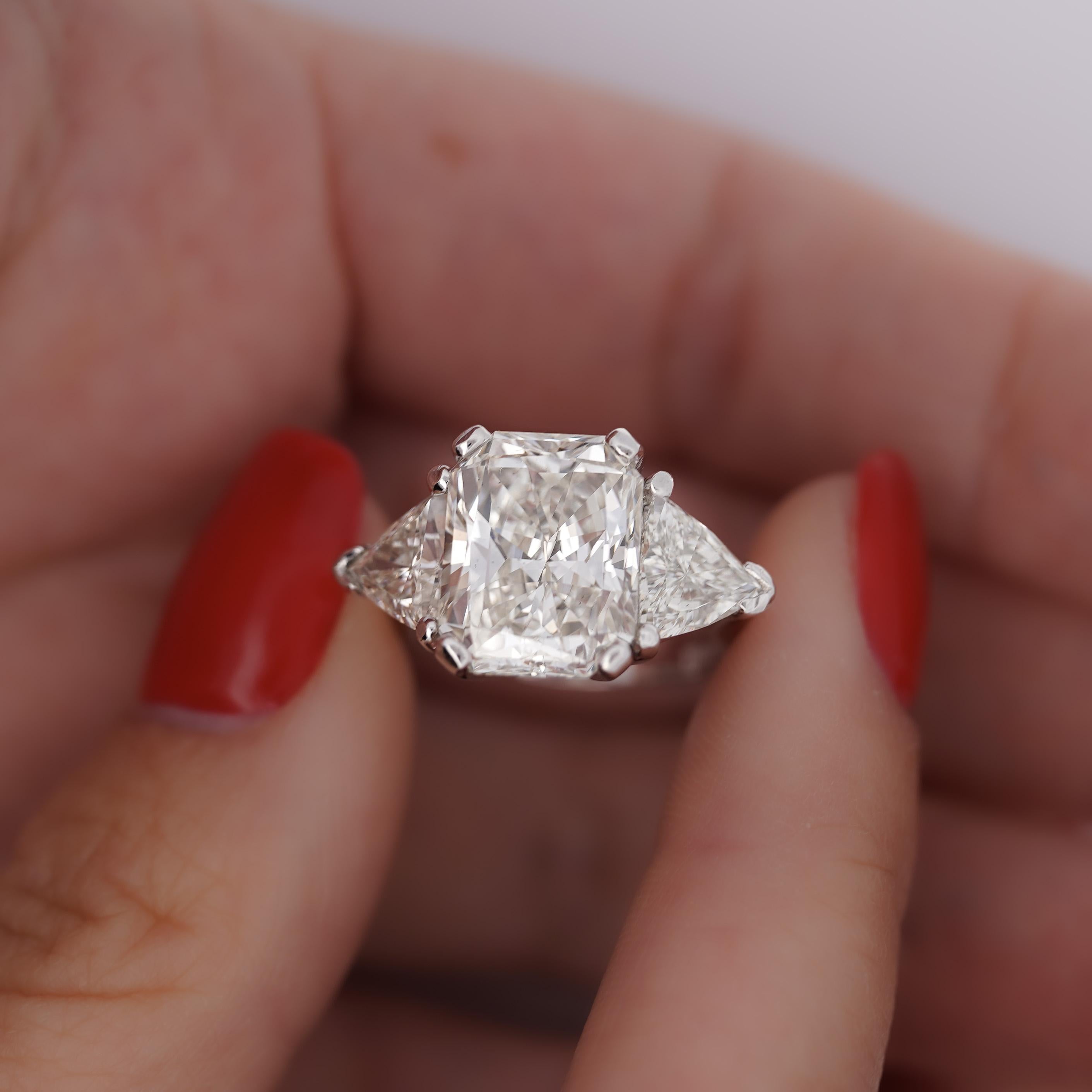 Natural 6.08 Carat Radiant Cut H/VS1 Diamond Three Stone Engagement Ring In Platinum. Set with 2 Trillion Cut Diamond Side Stones. Ring Size 6, adjustable.