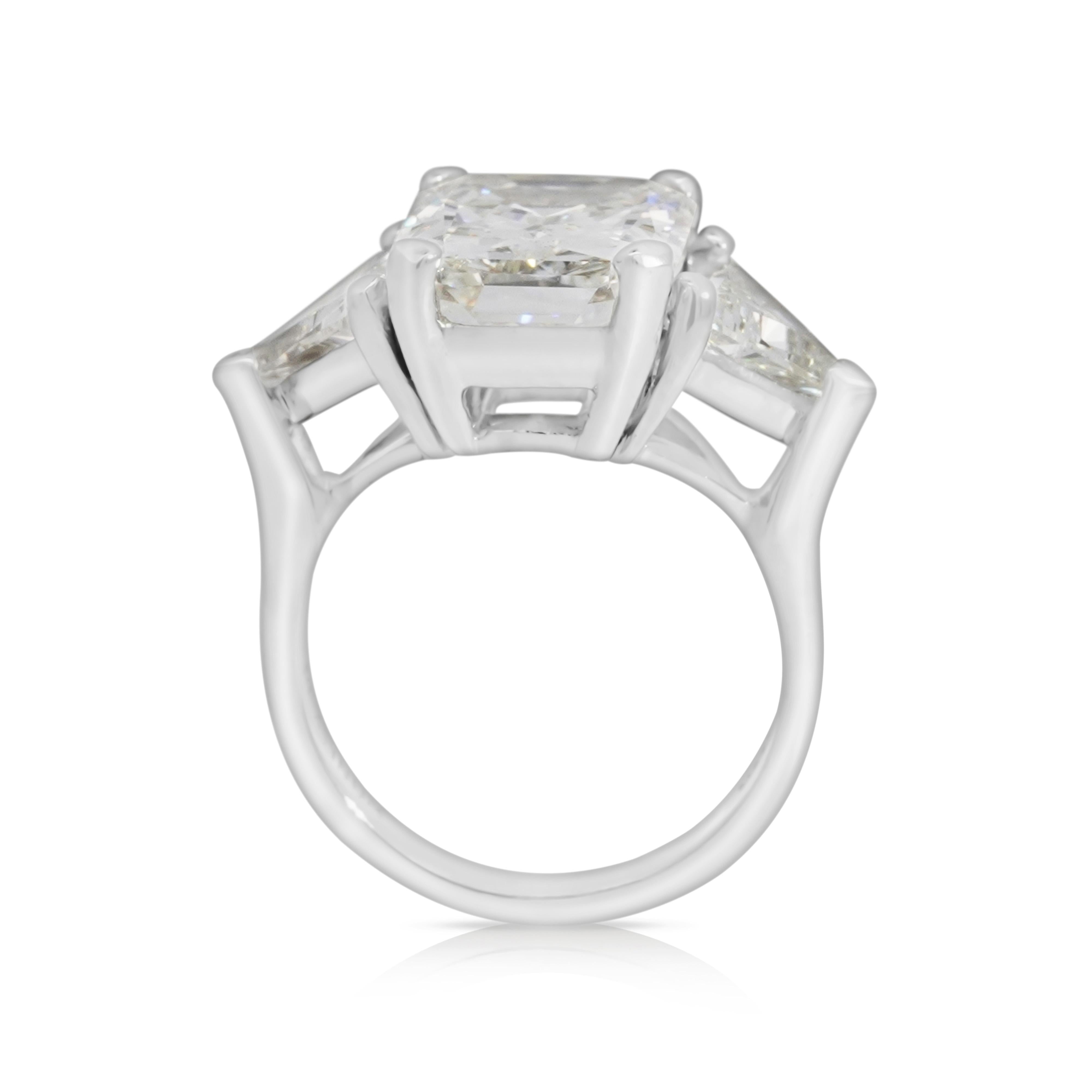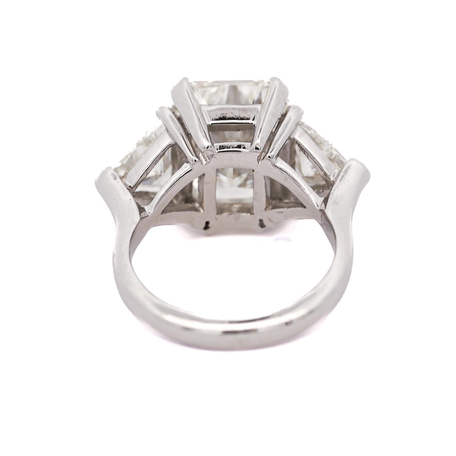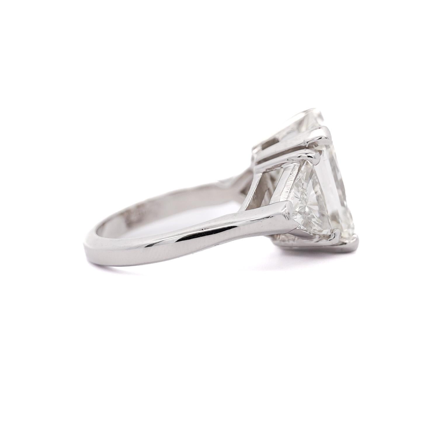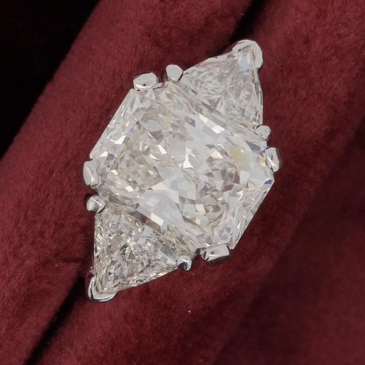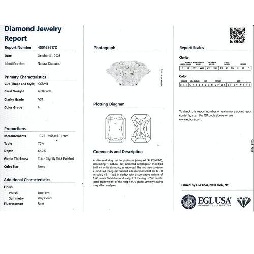 A diamond ring, set in platinum (stamped ‘PLATINUM’), containing 1 natural cut cornered rectangular modified brilliant white diamond, as reported. The ring also contains 2 modified triangular brilliant side diamonds that are G - H in color, VS1 - VS2 in clarity, with a cumulative weight of 1.60 carats. Total diamond weight of the ring is 7.68 carats. Total gram weight of the ring is 9.70 grams.