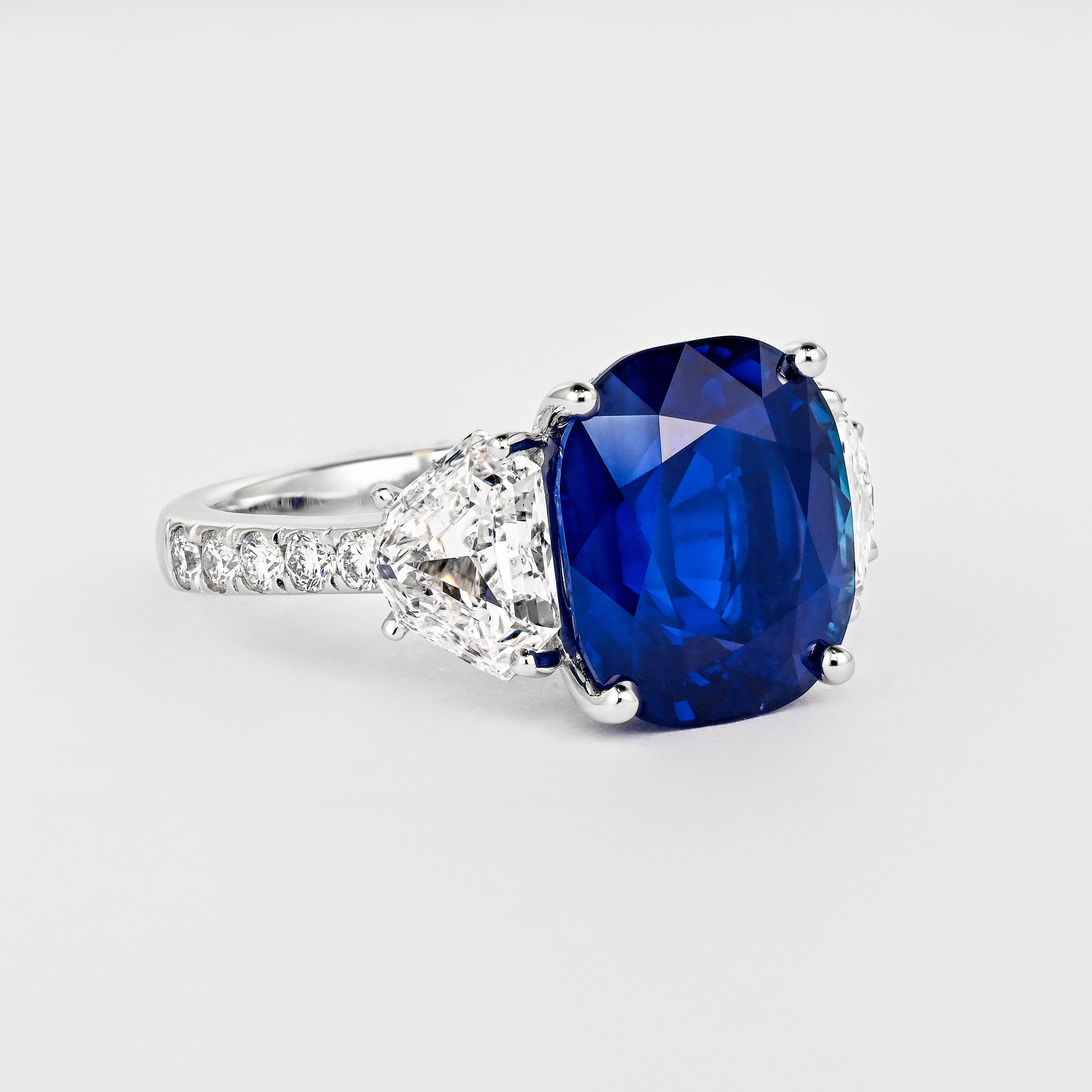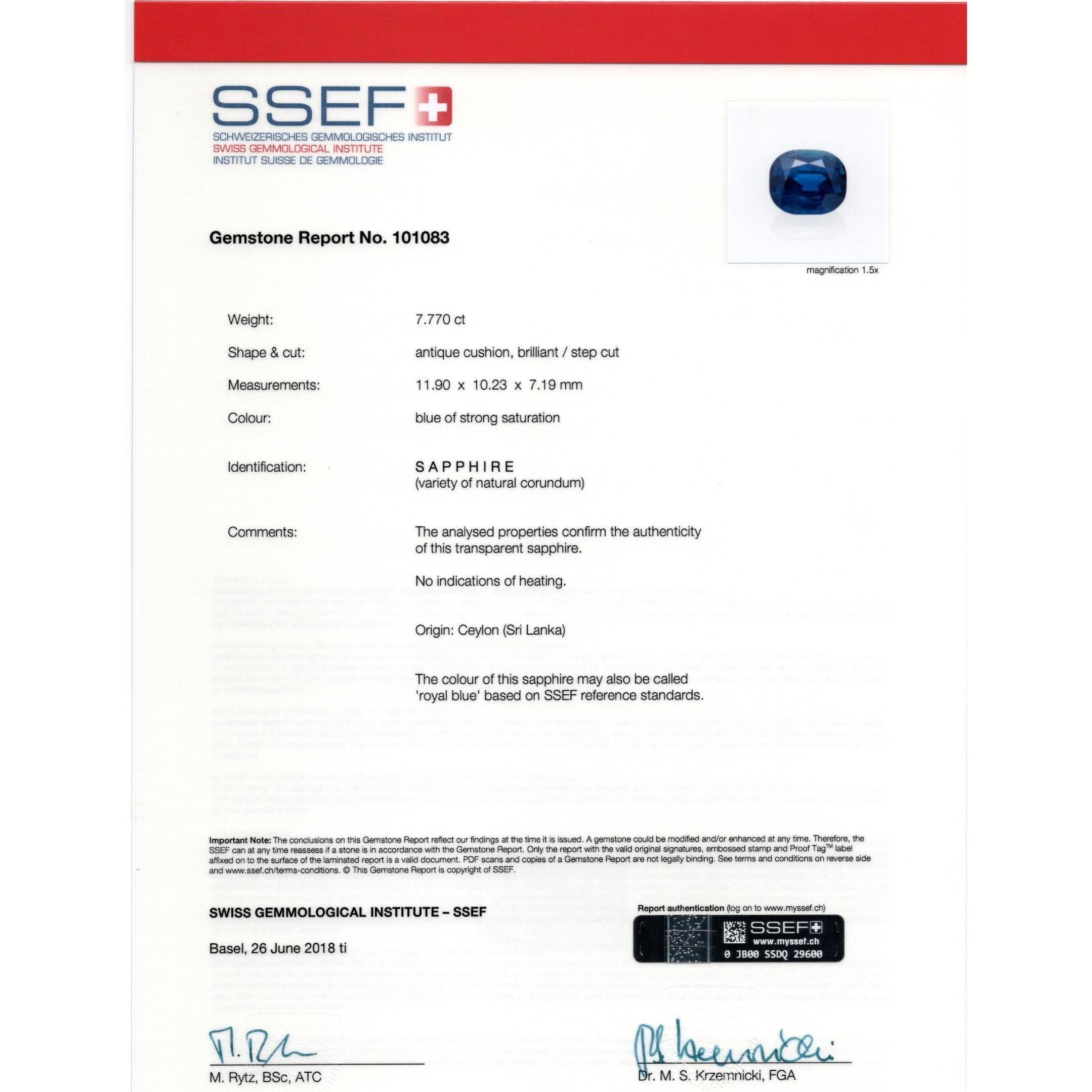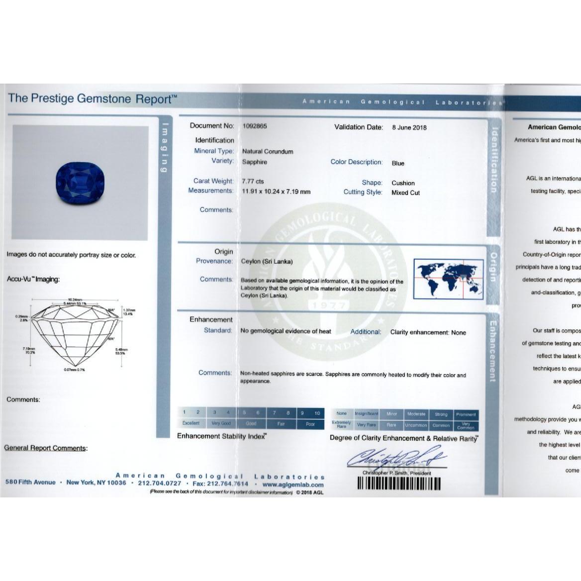 This natural 7.77 carat unheated Ceylon blue sapphire ring is a striking statement of elegance and rarity. It is both AGL Certified and SSEF certified as originating from Ceylon (Sri Lanka) and having no heat or clarity treatment of any kind. Set in 18k white gold with 2 shield cut diamond side stones of over 1 carat each and round cut diamonds on the shank and basket. Mounted in an open back 4 prong setting so the stone's natural color is on full display.