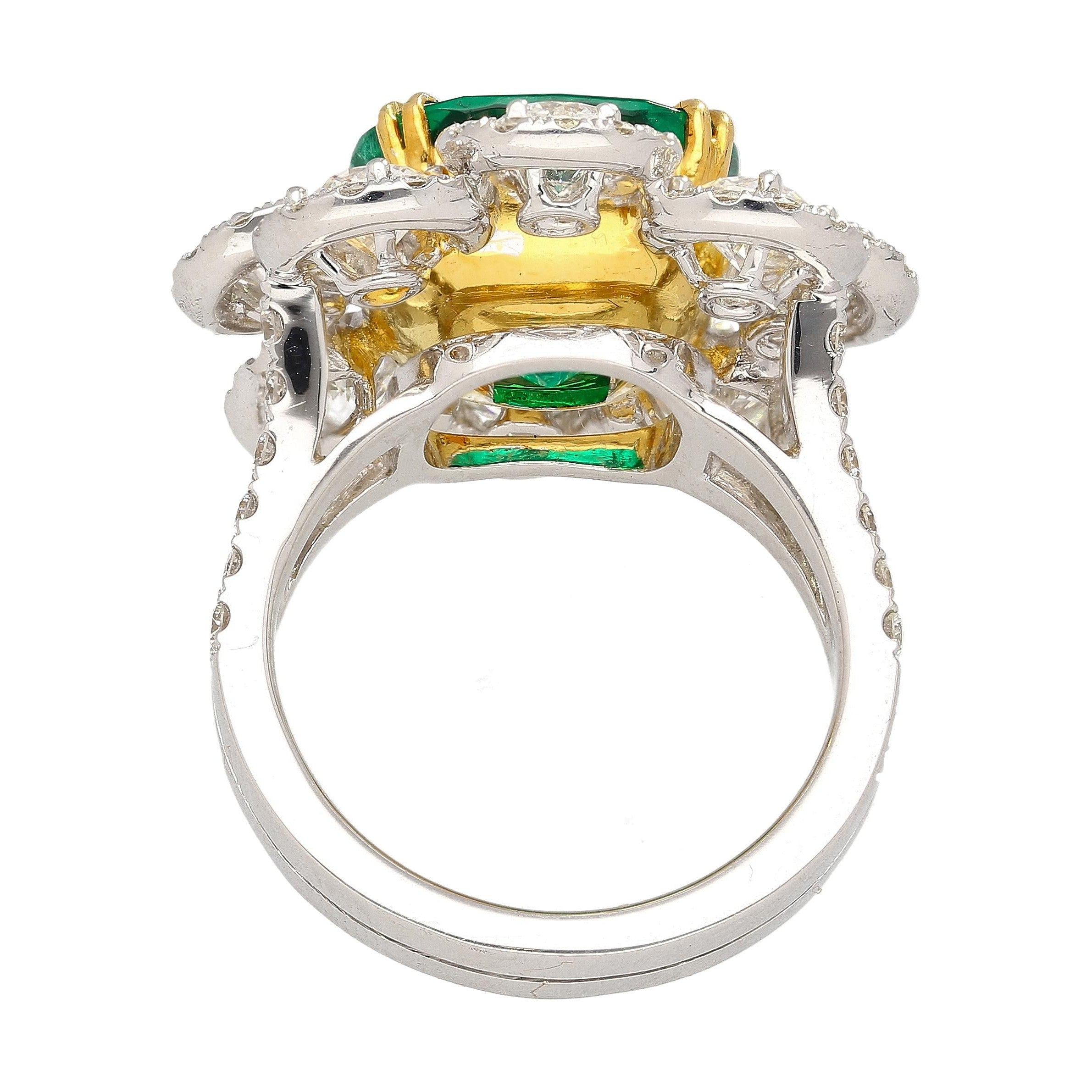 GRS certified 7.60 carat natural Colombian emerald set in an 18K white and yellow gold diamond ring. This is a cushion cut vivid green emerald ring with round brilliant cut diamond halo accents.