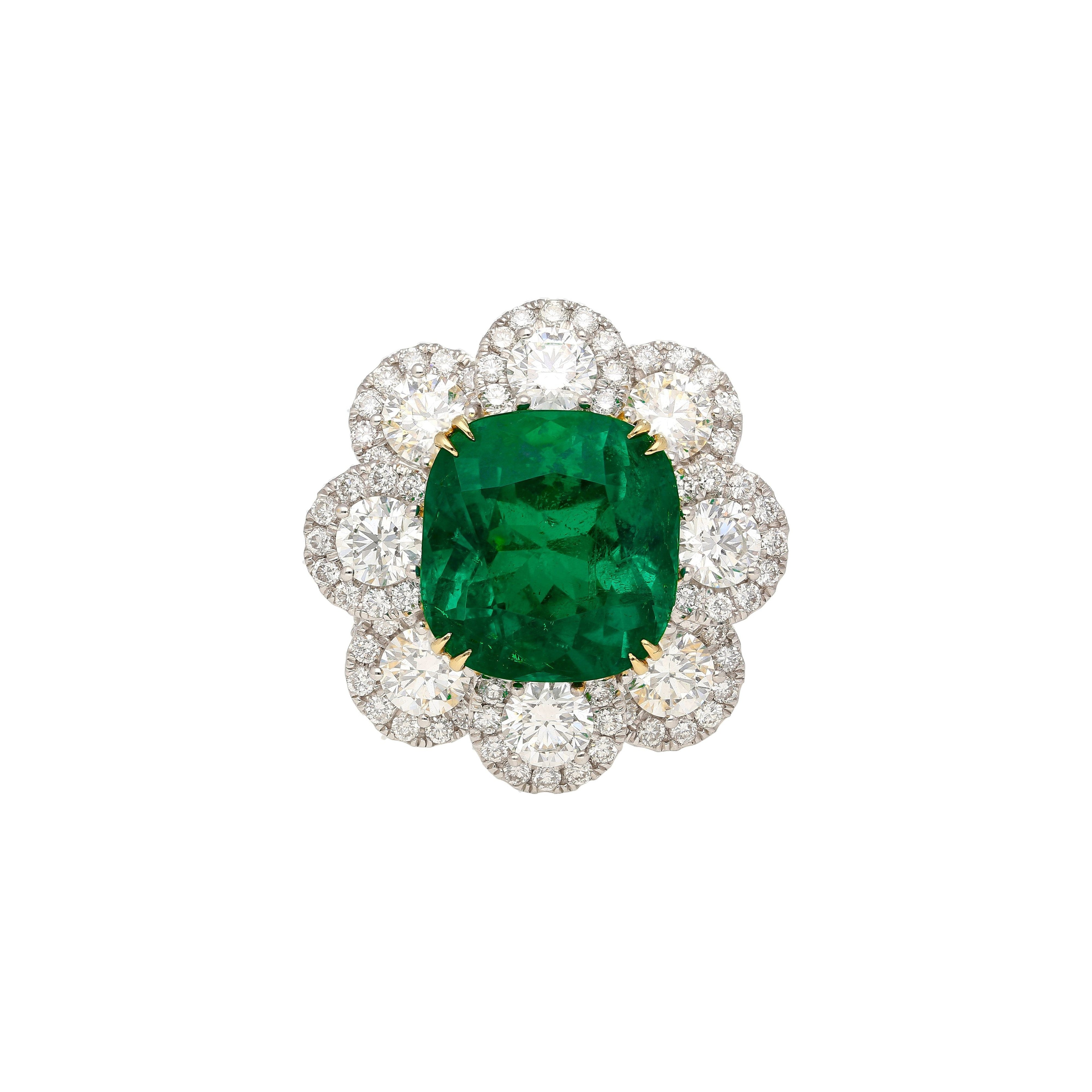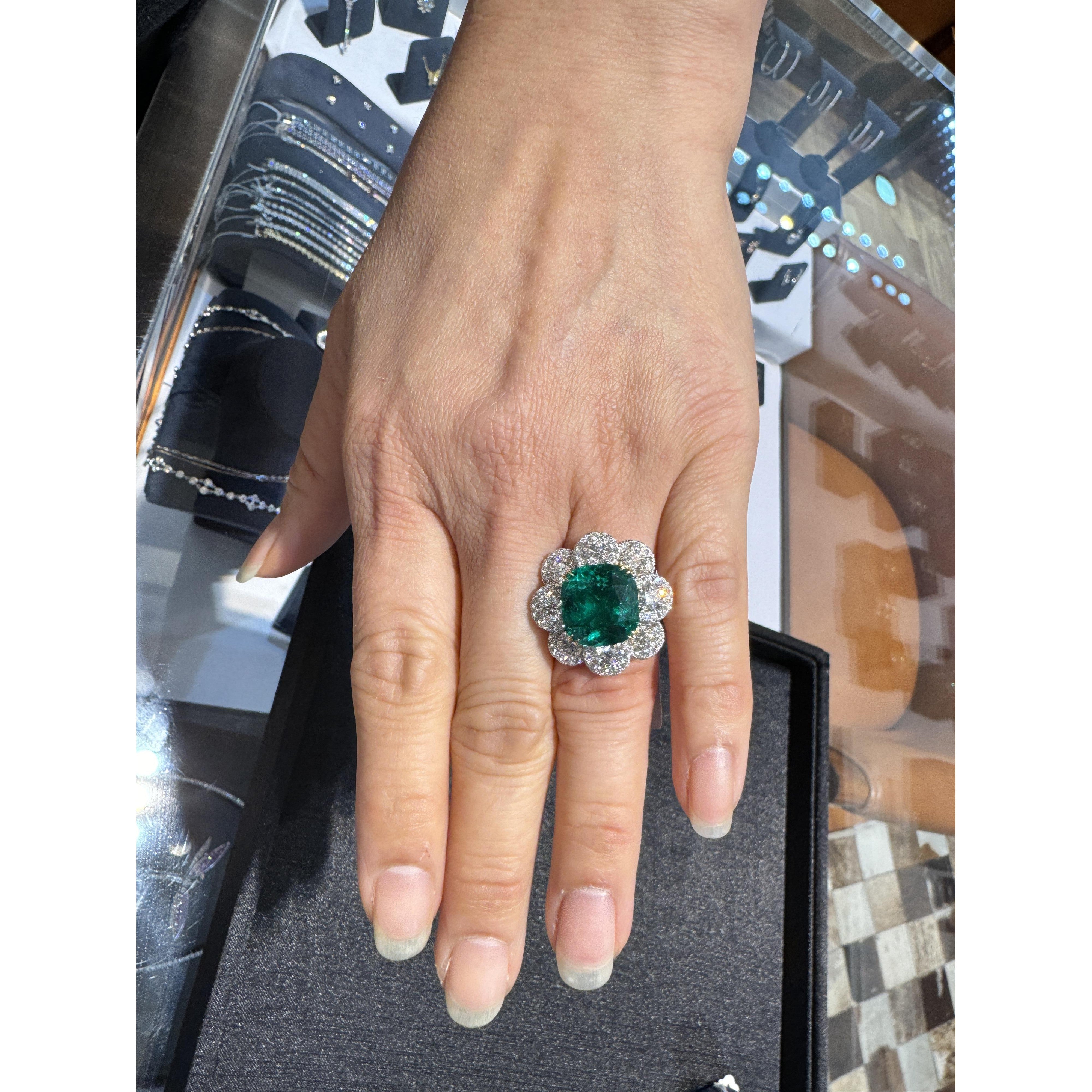 7.60 Carat Cushion Cut Colombian Emerald Round Diamond Ring
