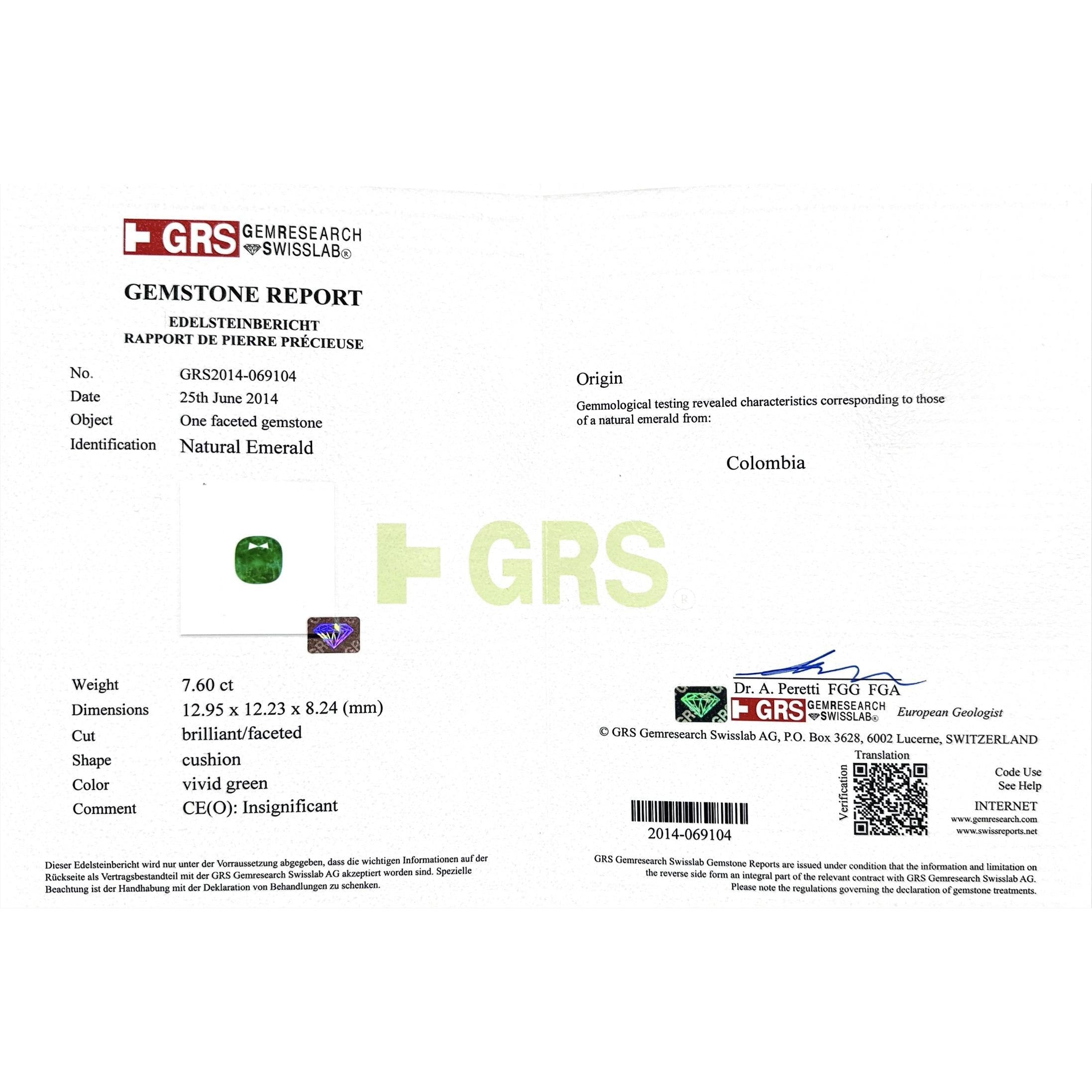 - Accompanied by GRS certification stating the emerald is natural, Colombian origin, cushion cut, vivid green color, weighs 7.60 carats, and shows insignificant oil treatment