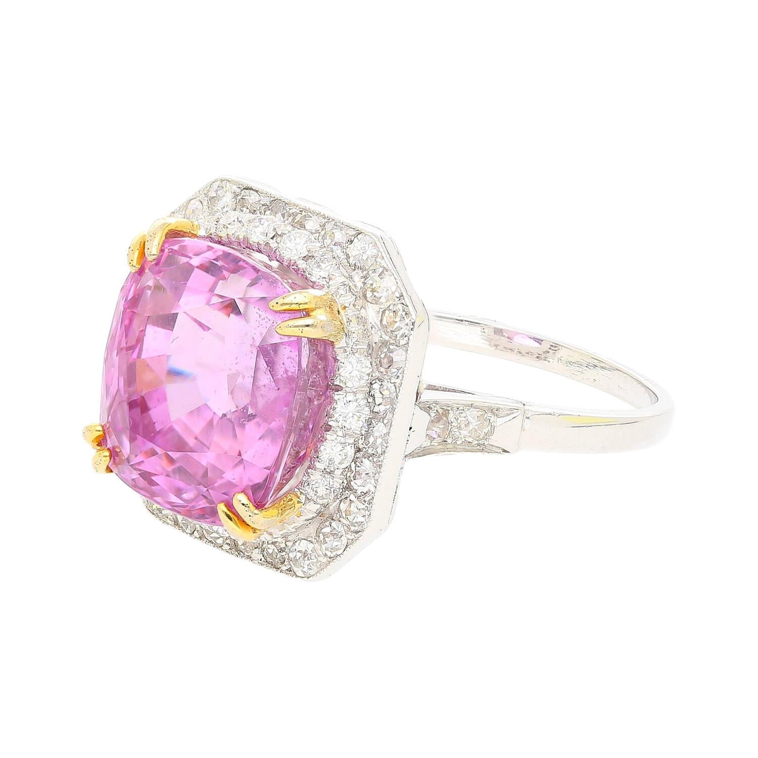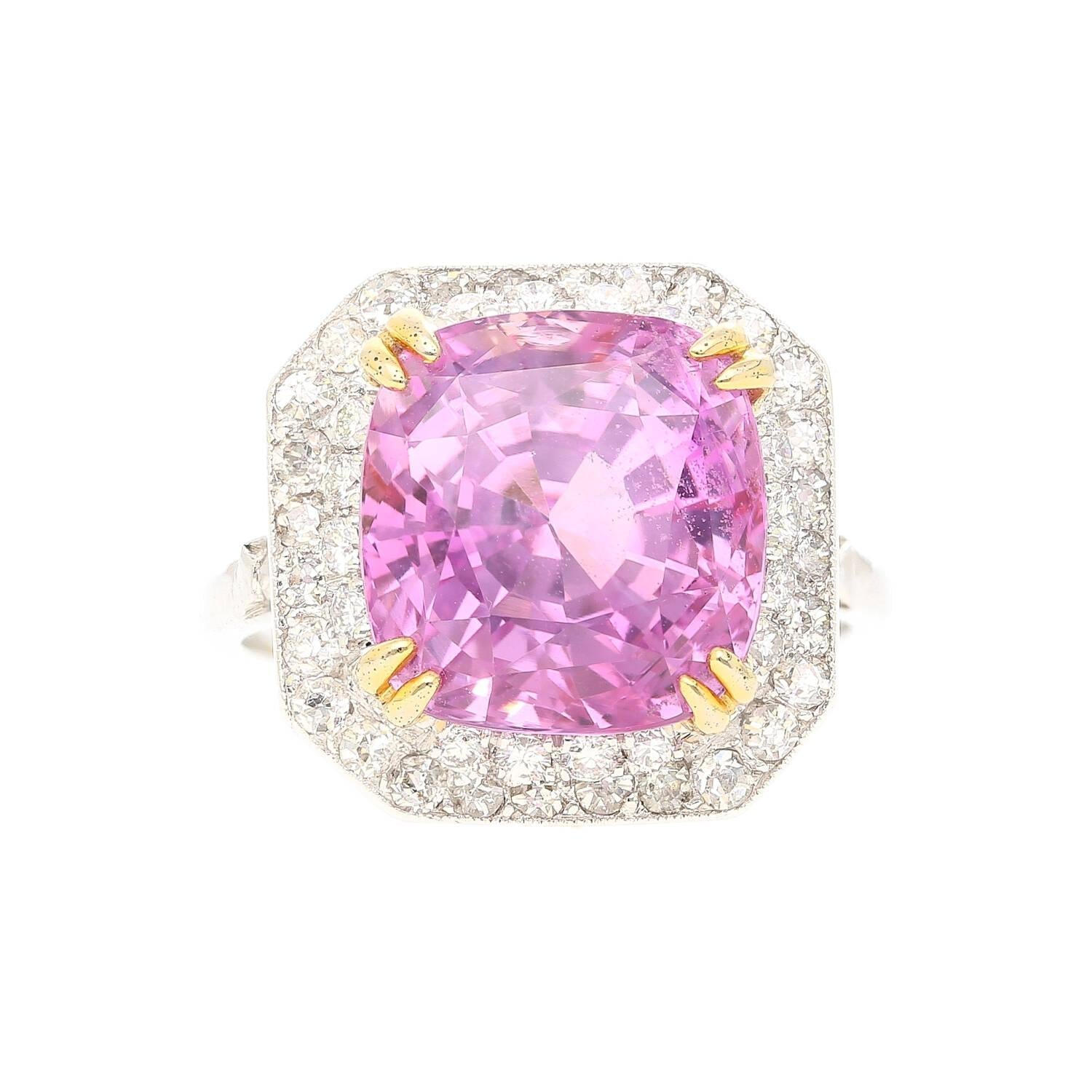 10.88 Carat Cushion Cut Pink Sapphire Round Diamond Halo Ring