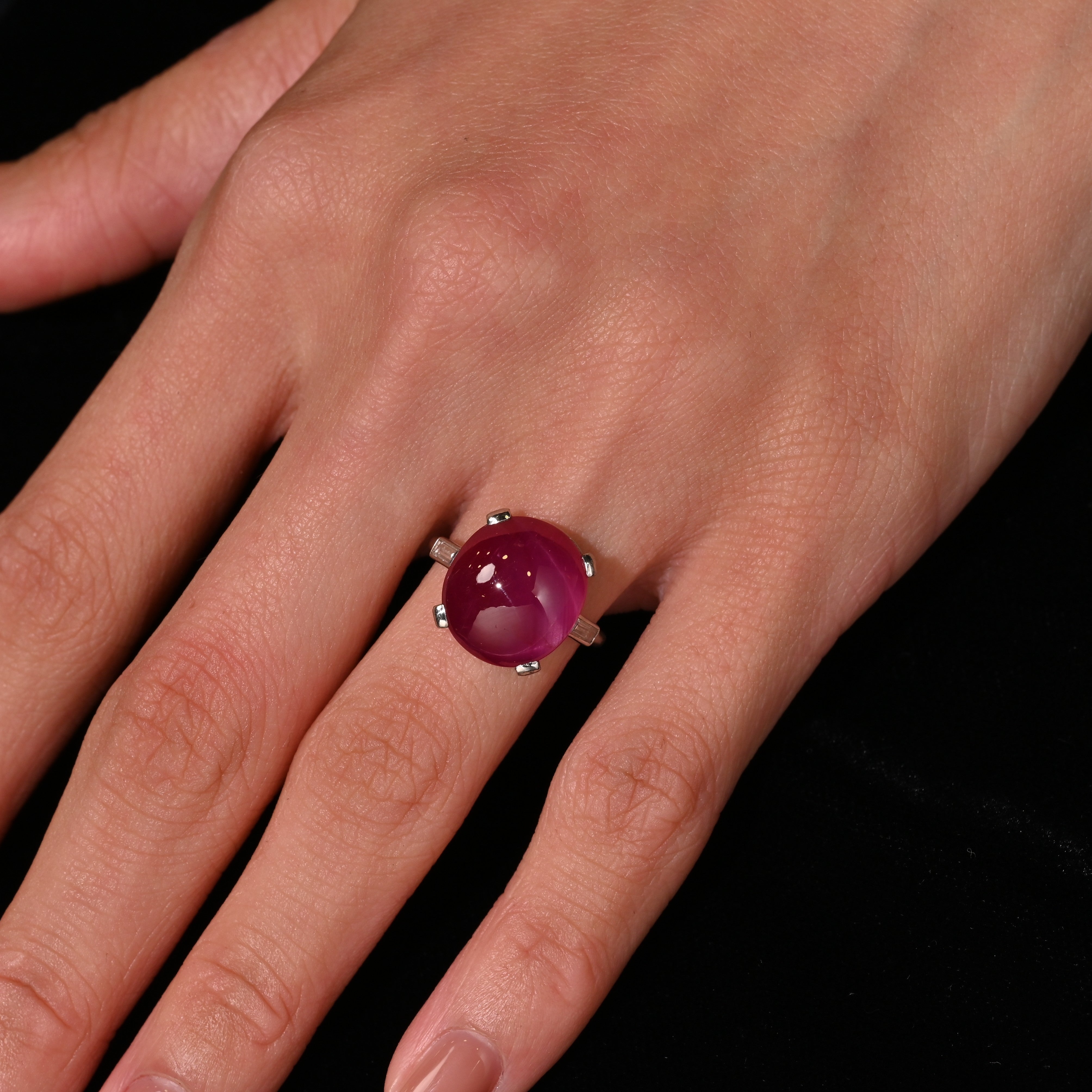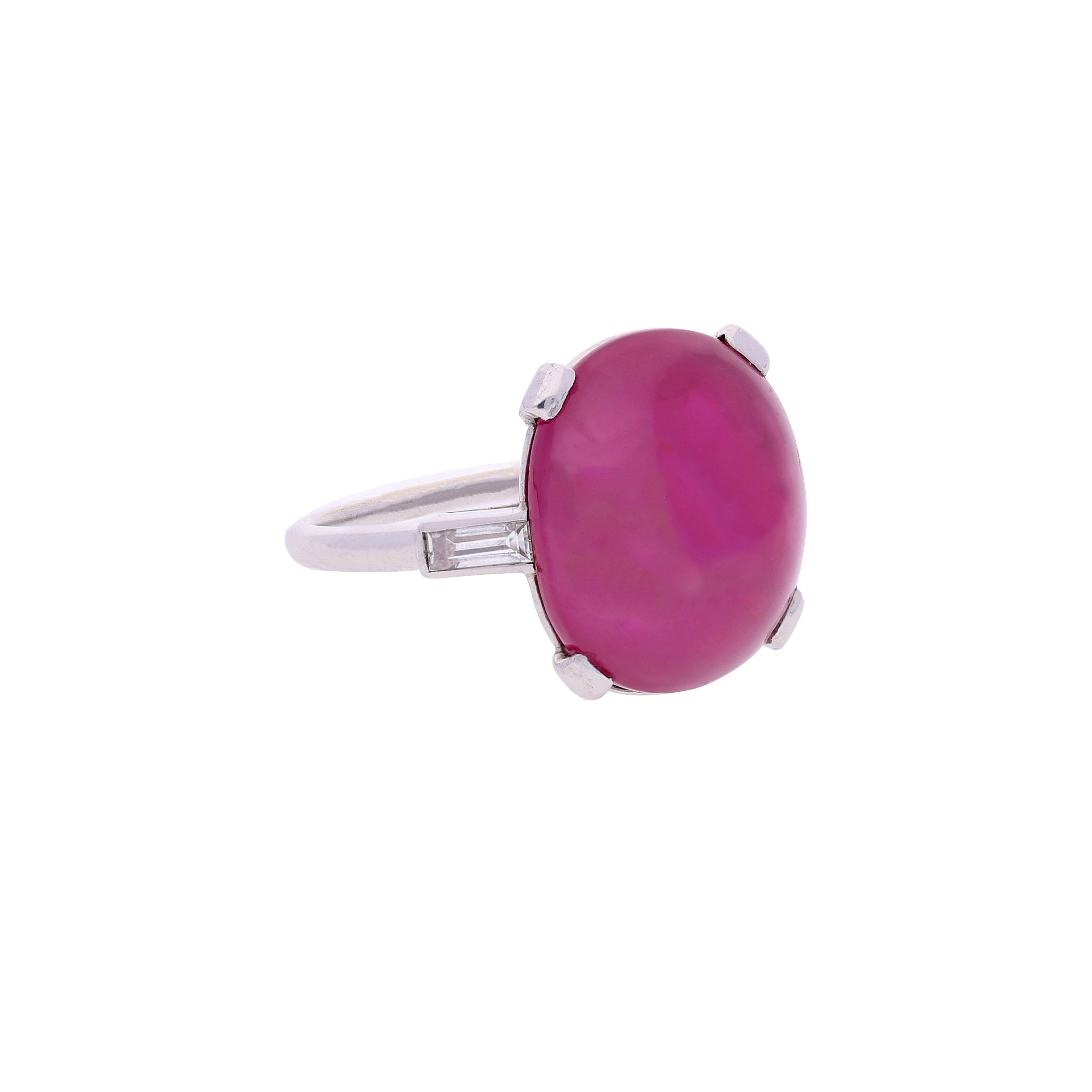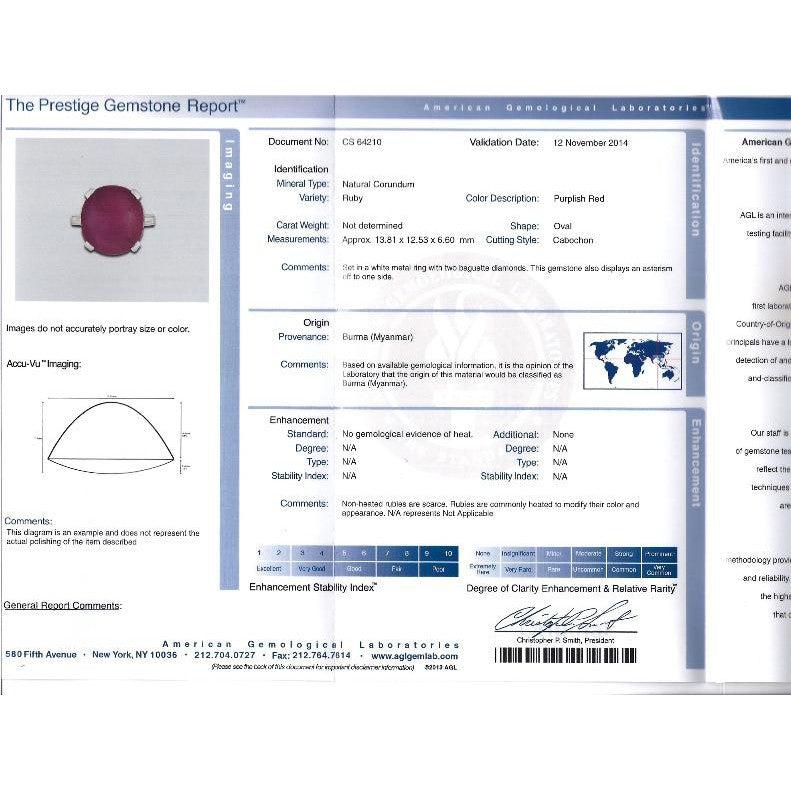 AGL Certified 10.88 Carat Natural Burma Origin Star Ruby in Platinum and Baguette Diamond 3 Stone Ring. A vintage cocktail ring featuring a rare, no heat Star Ruby gemstone from Burma, Myanmar. The ring has a straight shank with baguette cut diamonds on each side of the prong-set, vibrant fuchsia ruby that has a smooth and polished finish. The star asterism is strong, and charmingly located on the left edge of the gem.