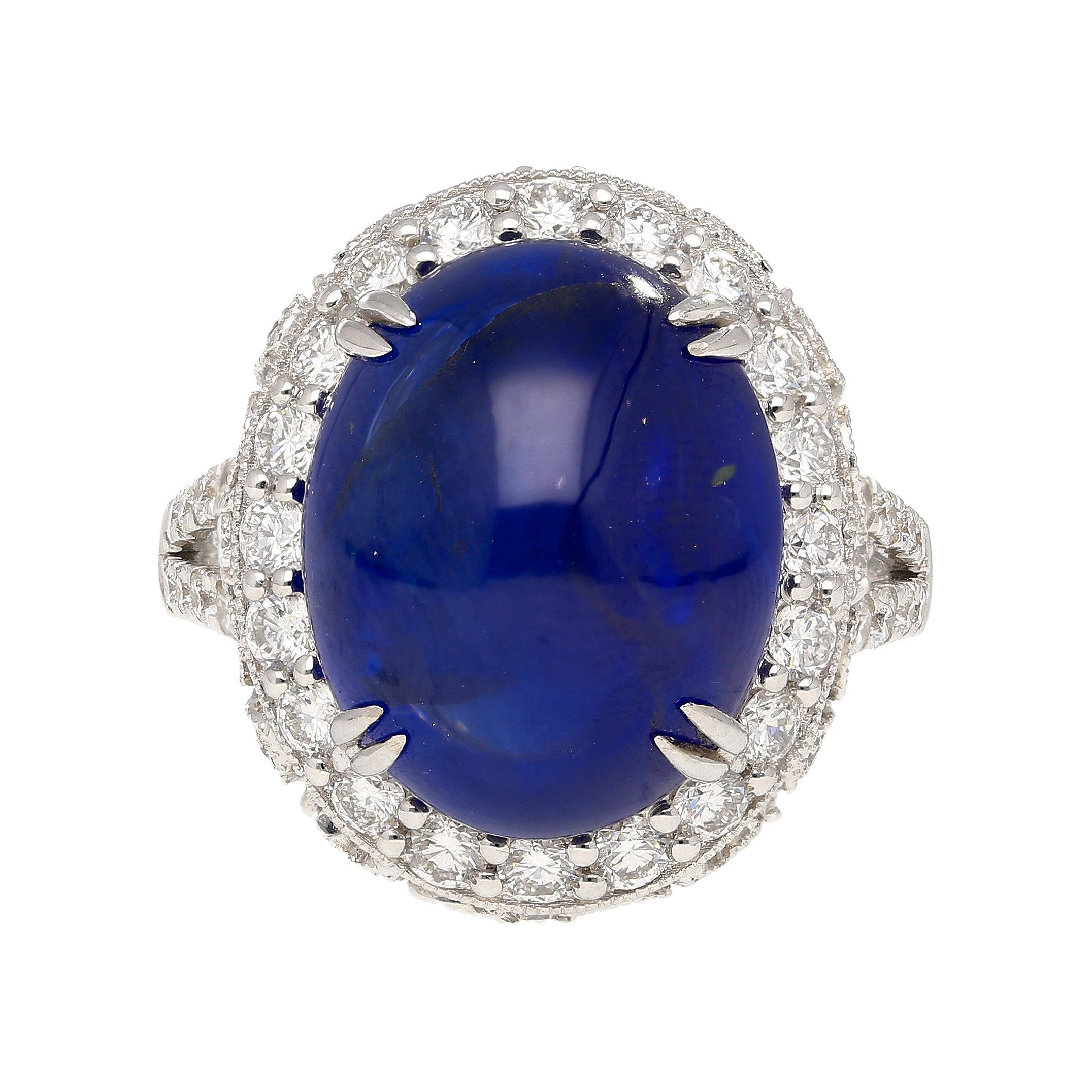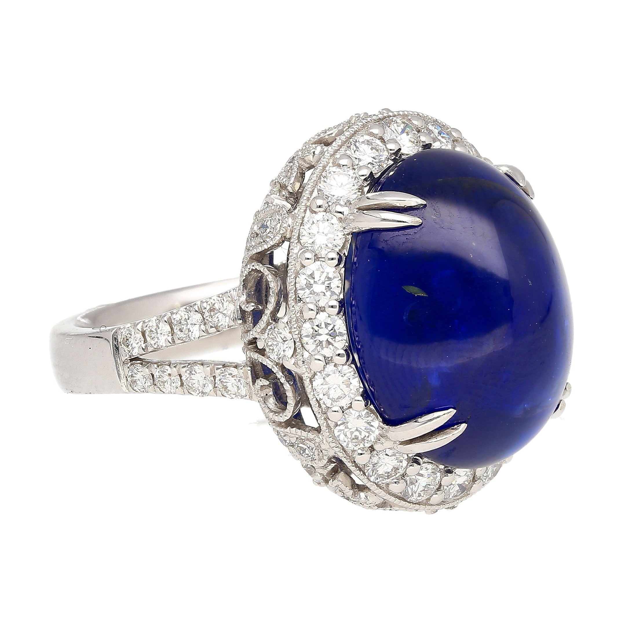 AGL certified 16.68 carat Ceylon blue sapphire set in 18K white gold ring. Cabochon cut blue sapphire with round diamond halo and floral filigree design in retro style.