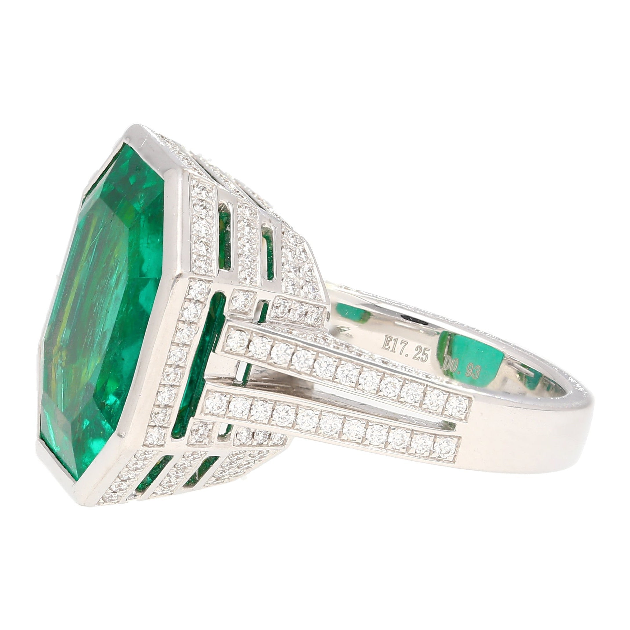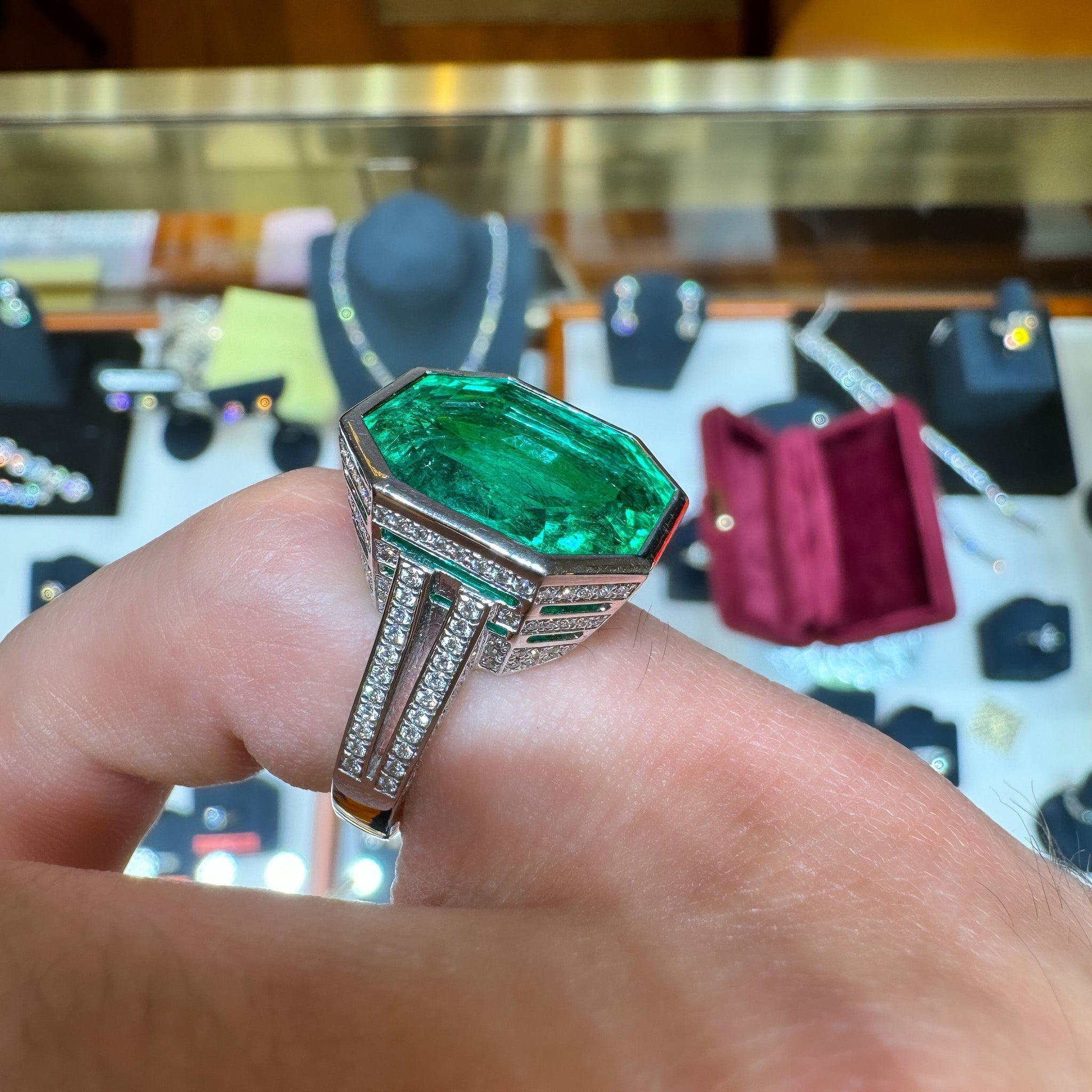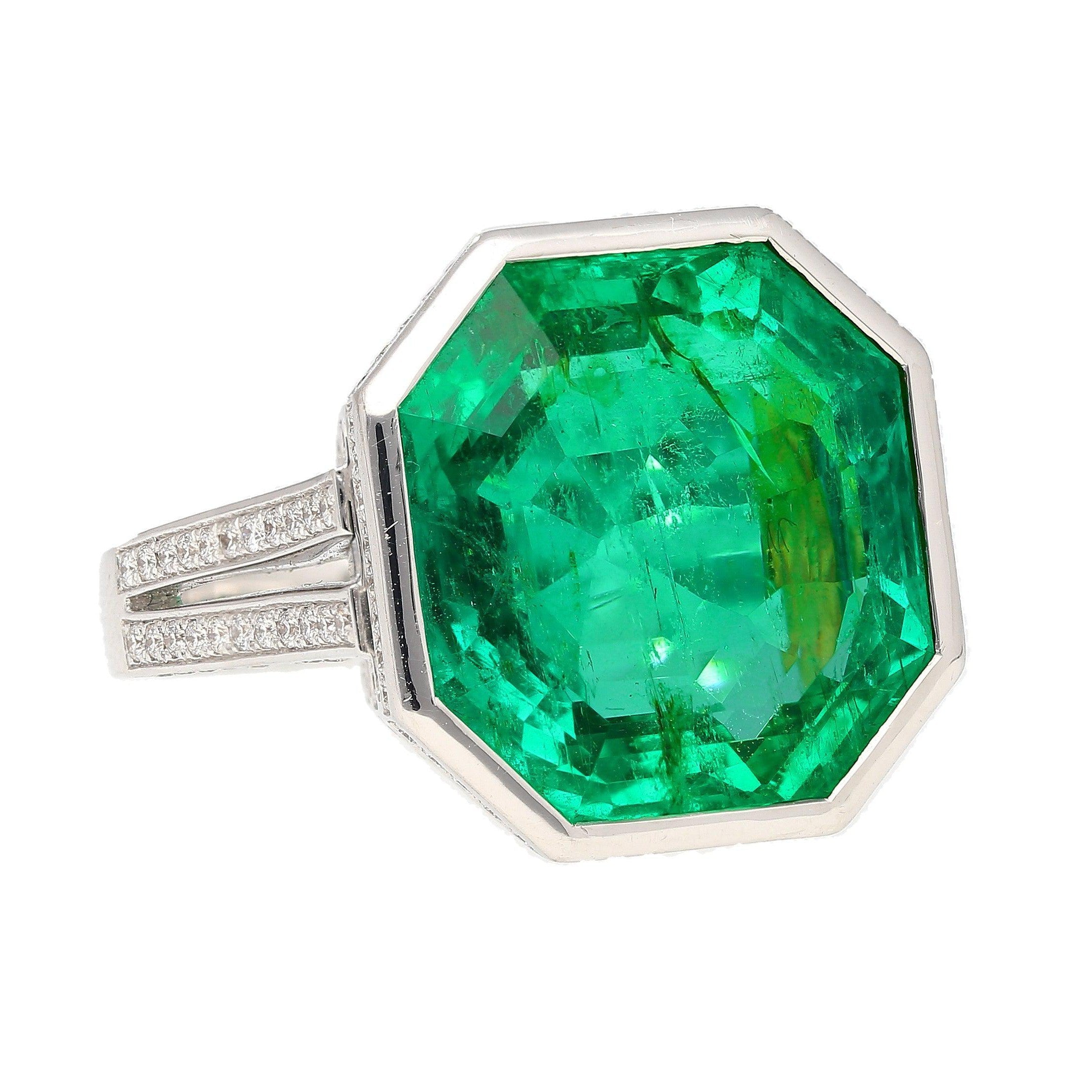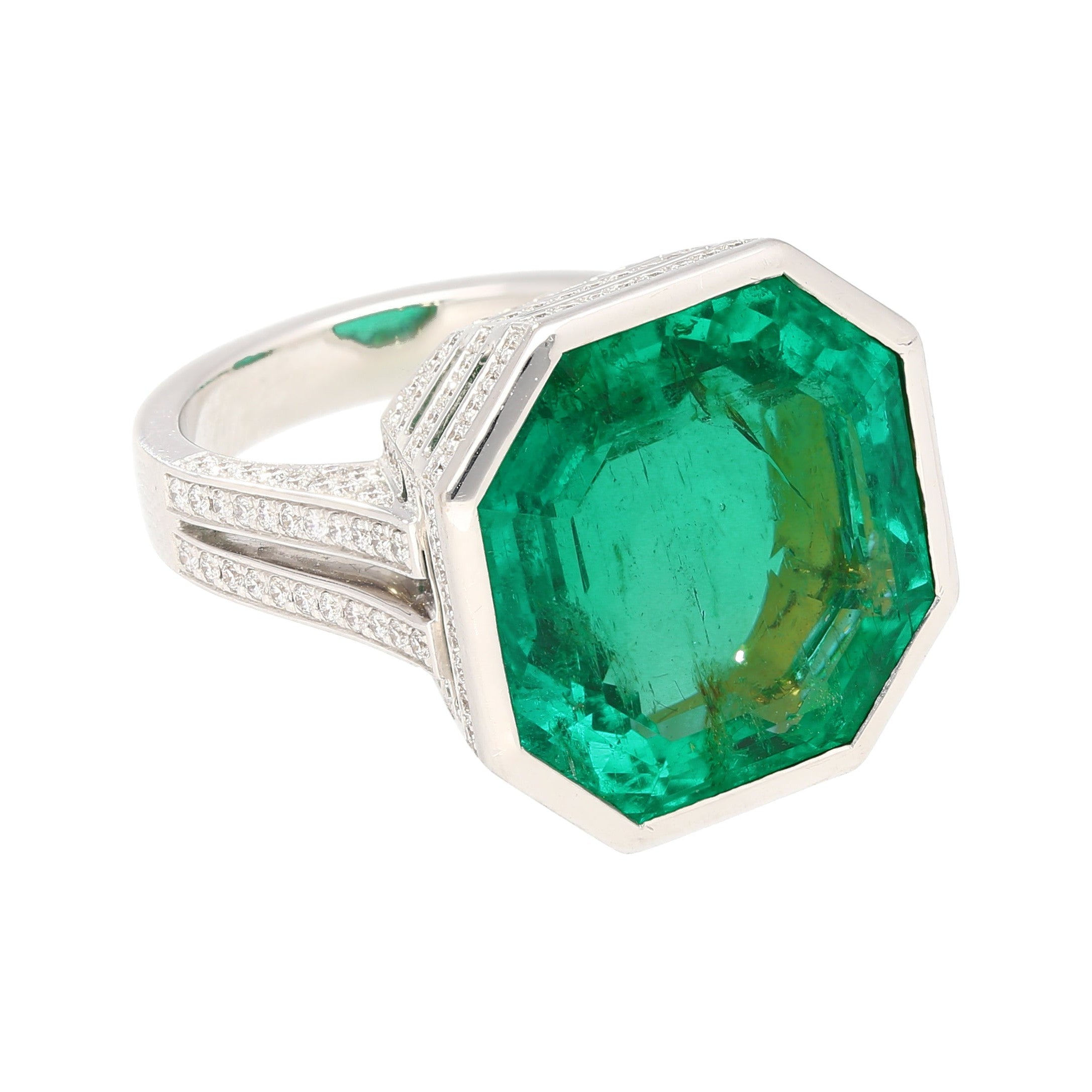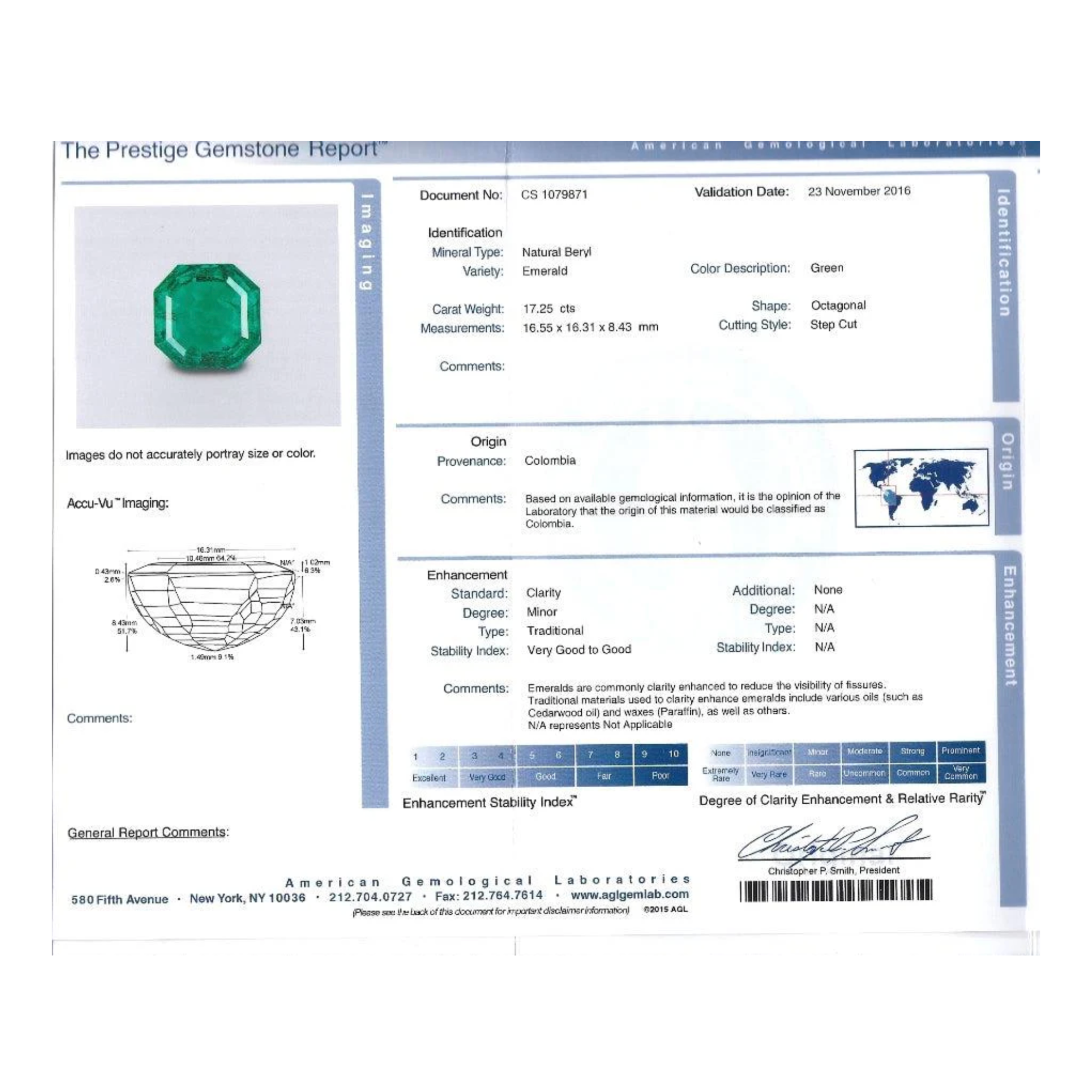 Experience the pinnacle of sophistication with our 17 Carat Octagonal Cut Colombian Emerald. AGL Certified minor oil. Set in flawless 18k white gold and adorned with a stunning array of natural round-cut diamonds, this investment-grade piece is truly exceptional.