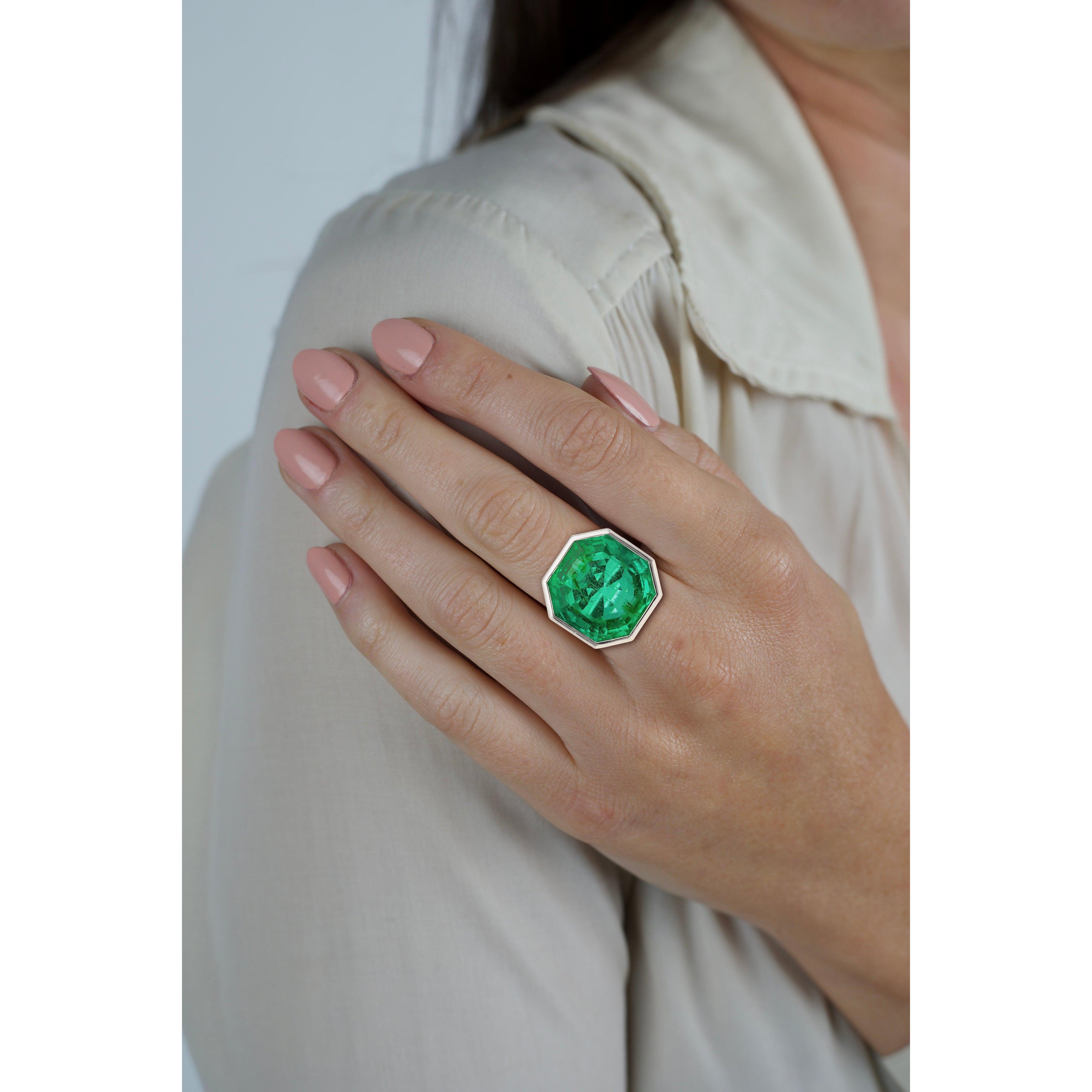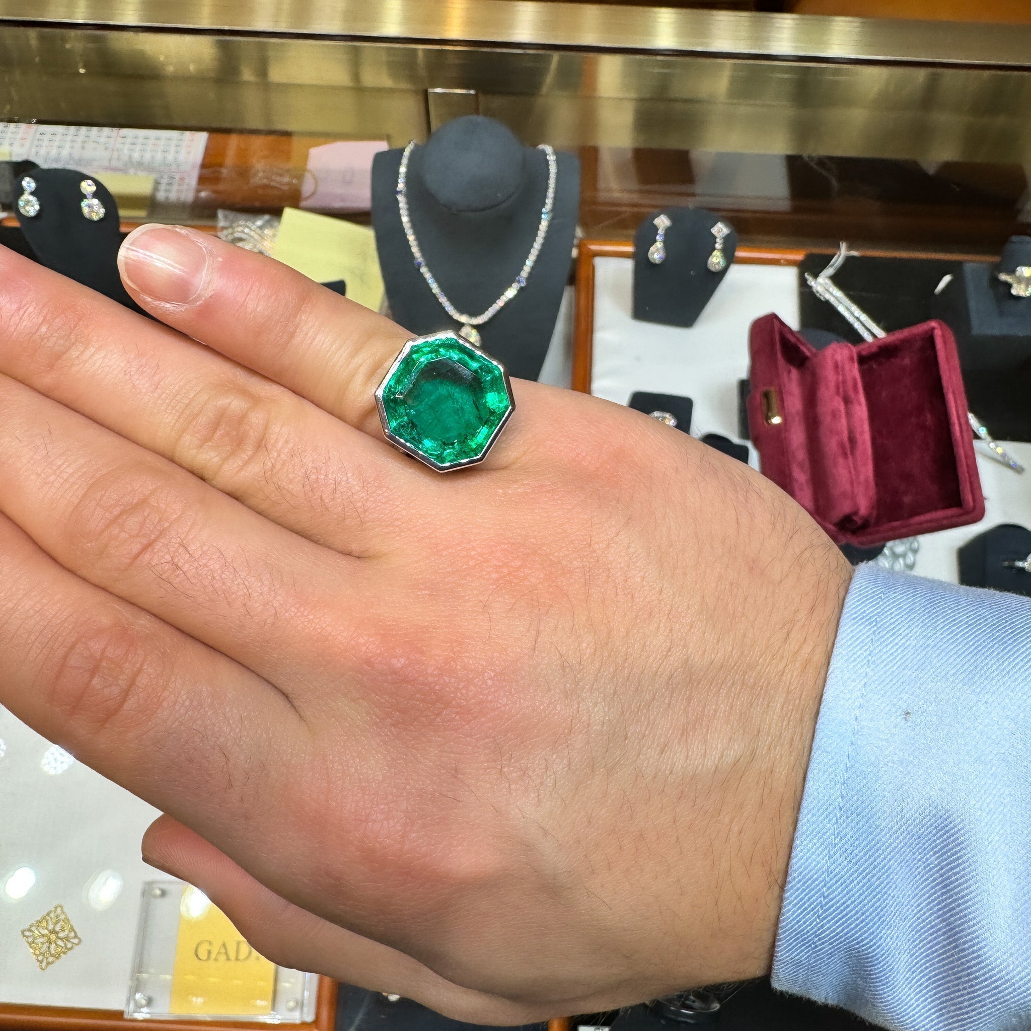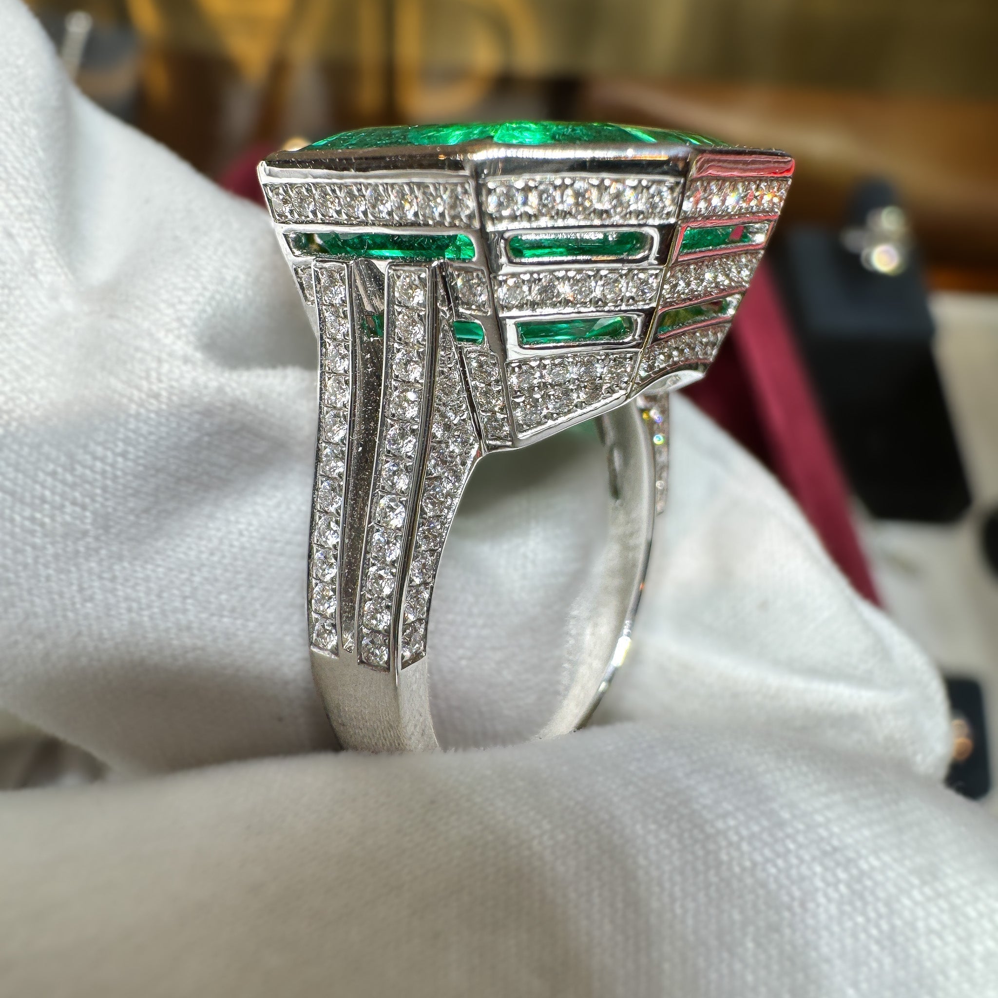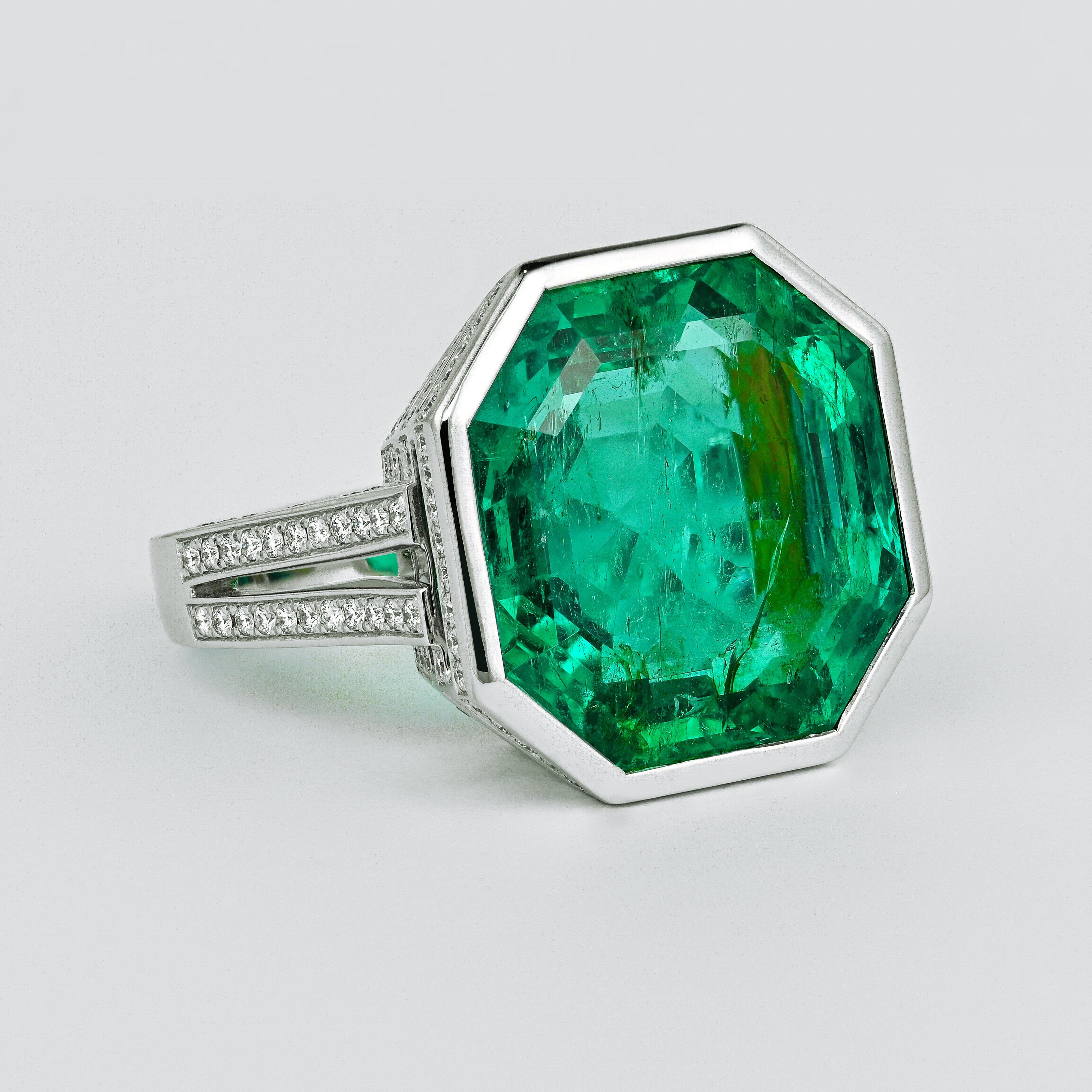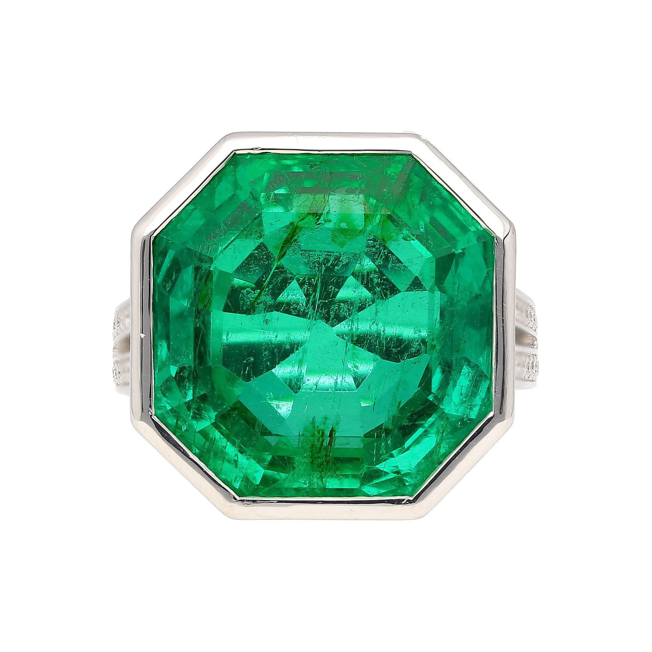 Experience the pinnacle of sophistication with our 17 Carat Octagonal Cut Colombian Emerald. AGL Certified minor oil. Set in flawless 18k white gold and adorned with a stunning array of natural round-cut diamonds, this investment-grade piece is truly exceptional.