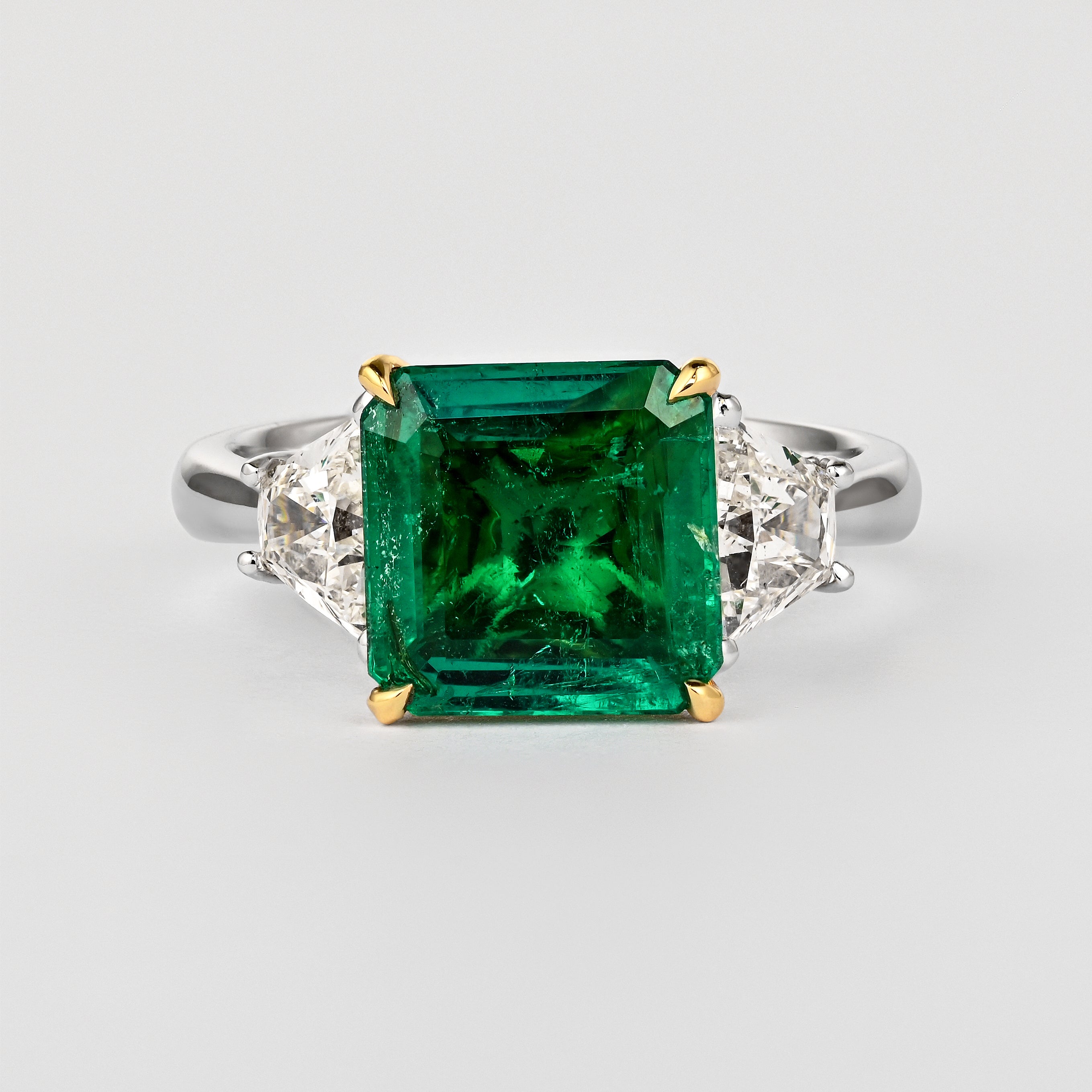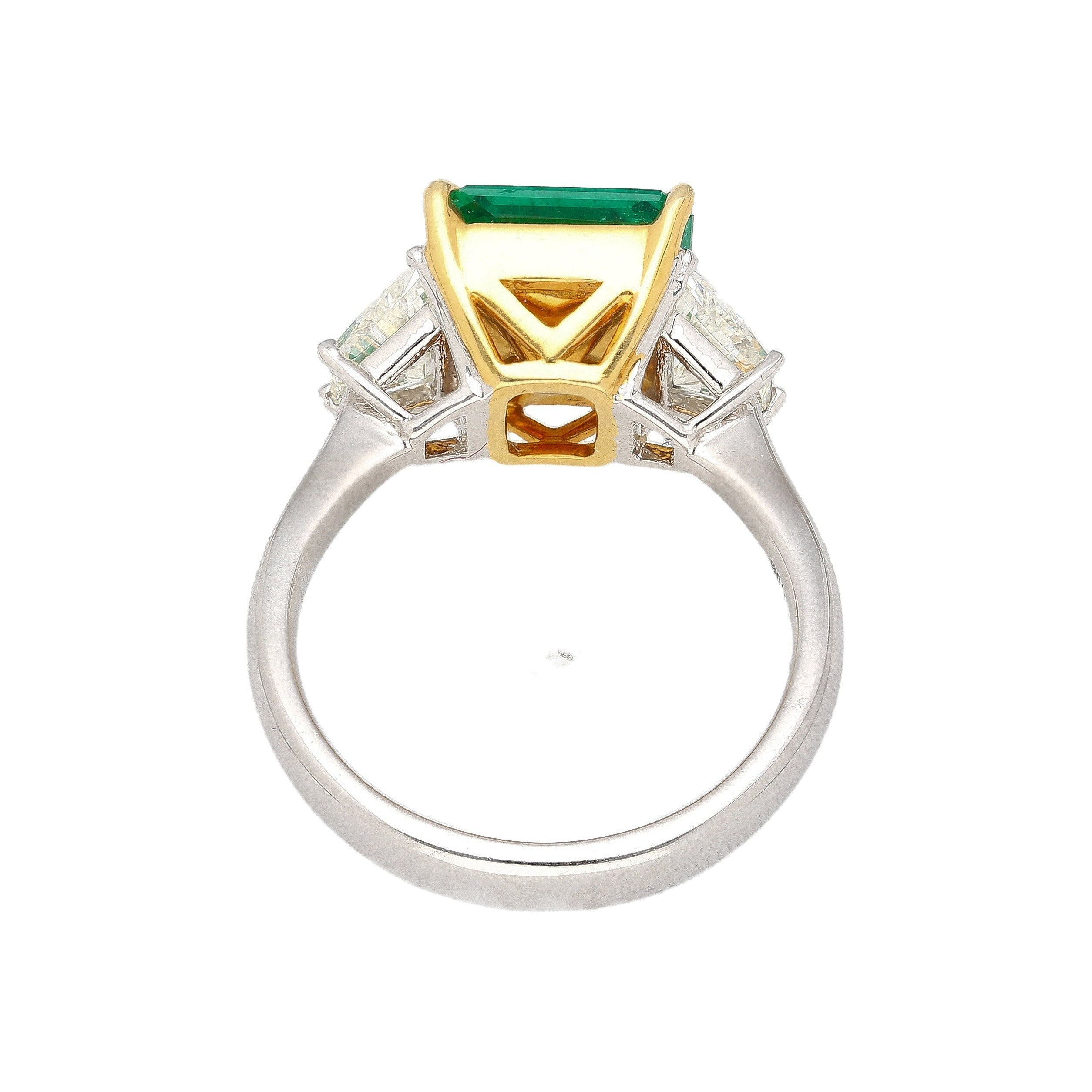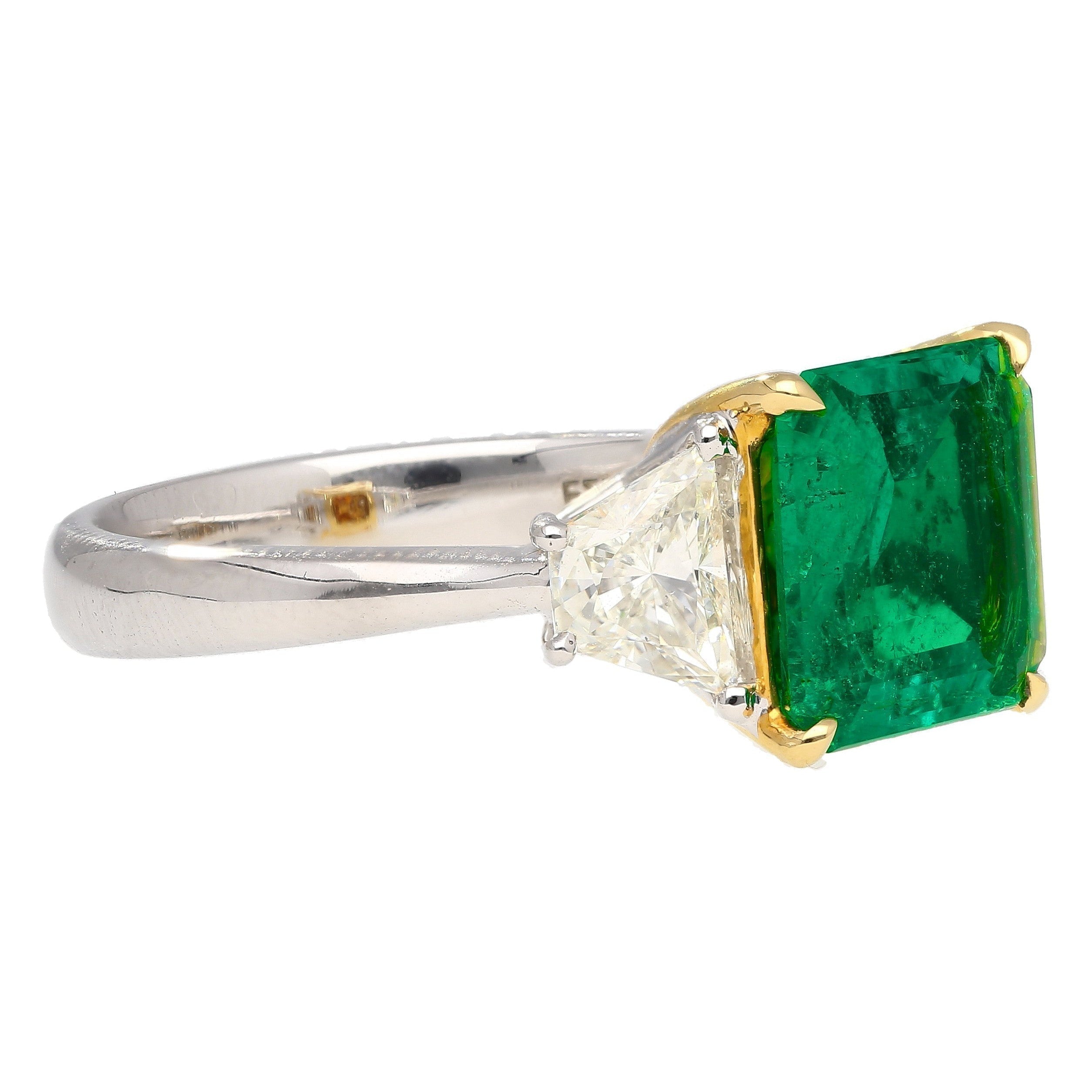 2.44 Carat Emerald Cut No Oil Green Emerald Trapezoid Diamond Three Stone Ring