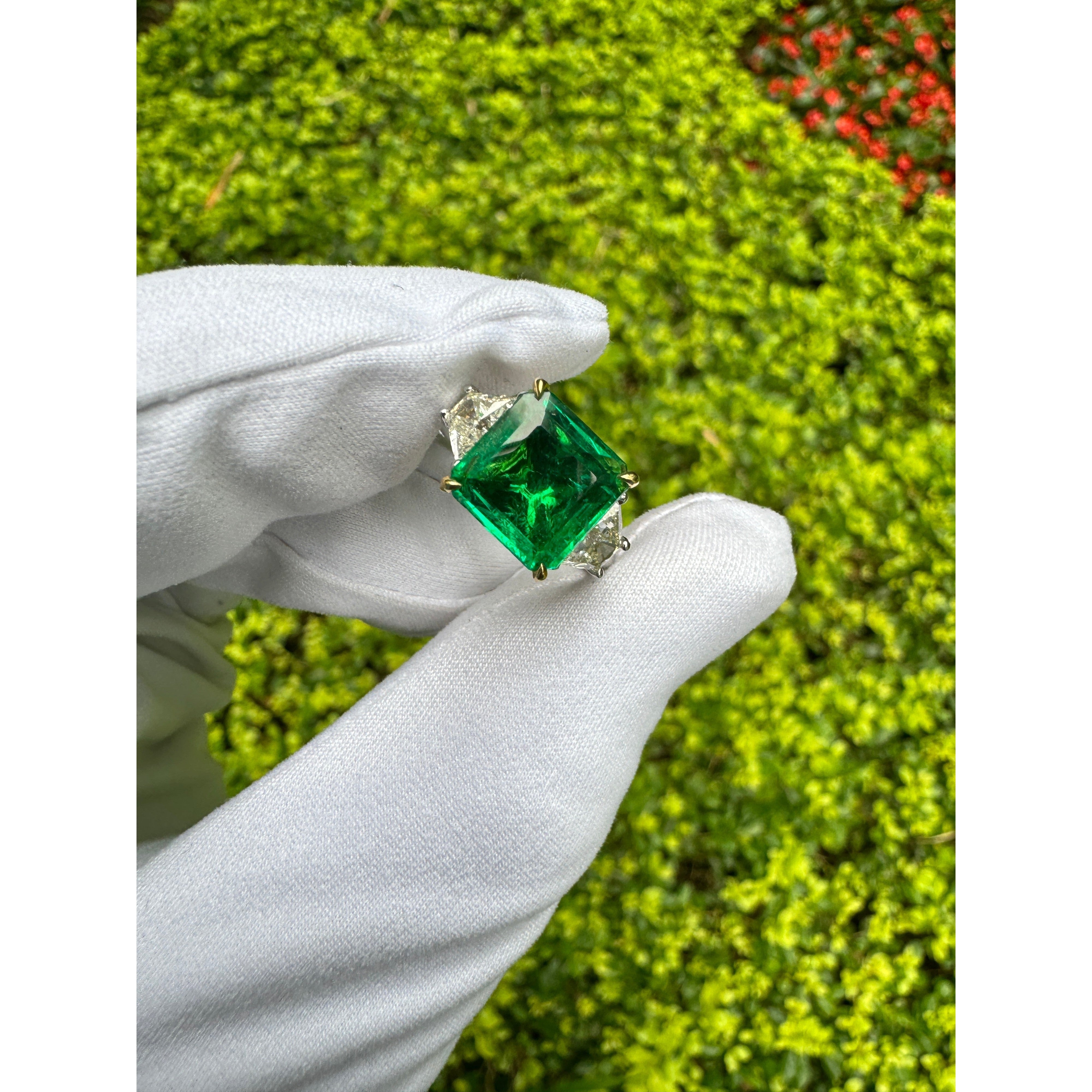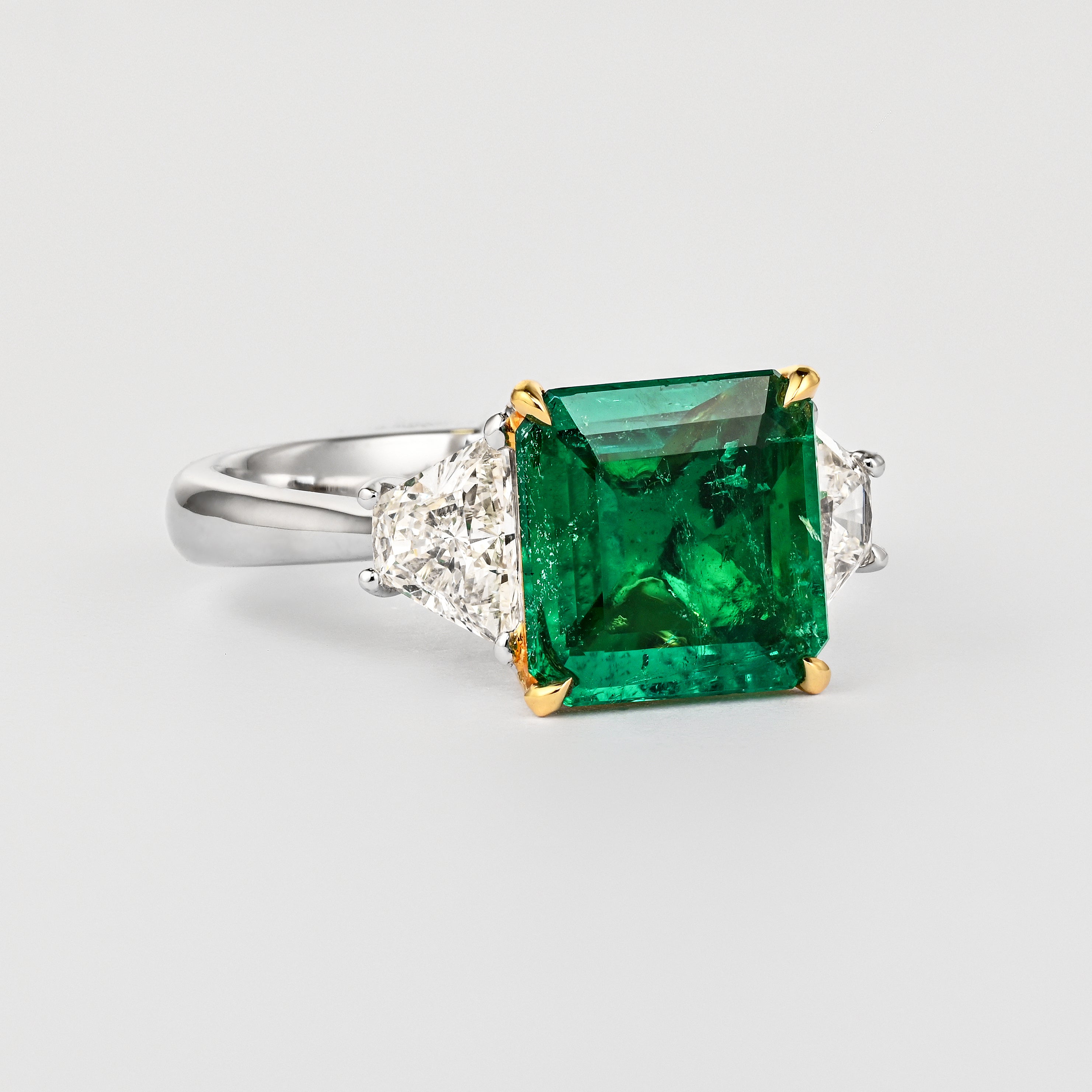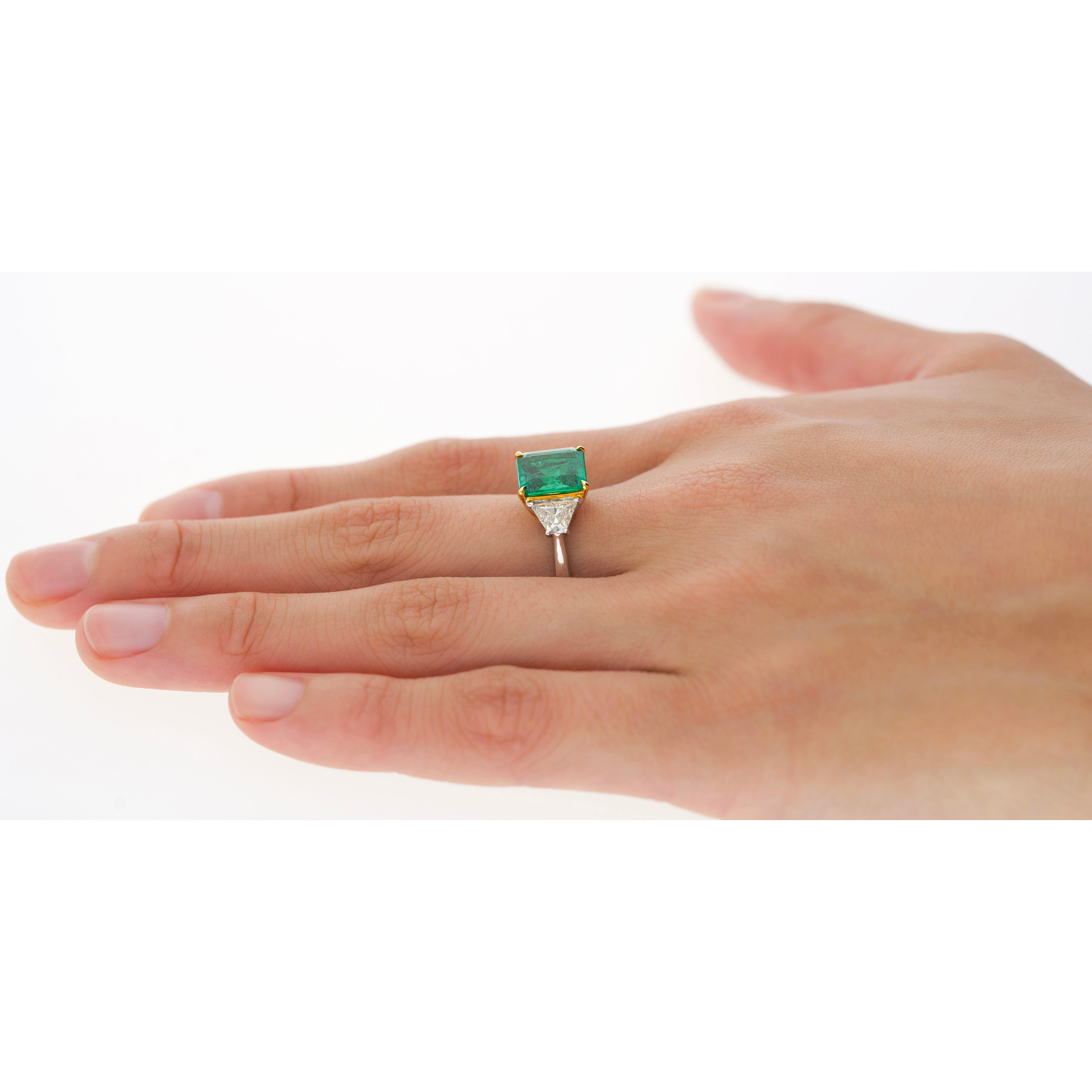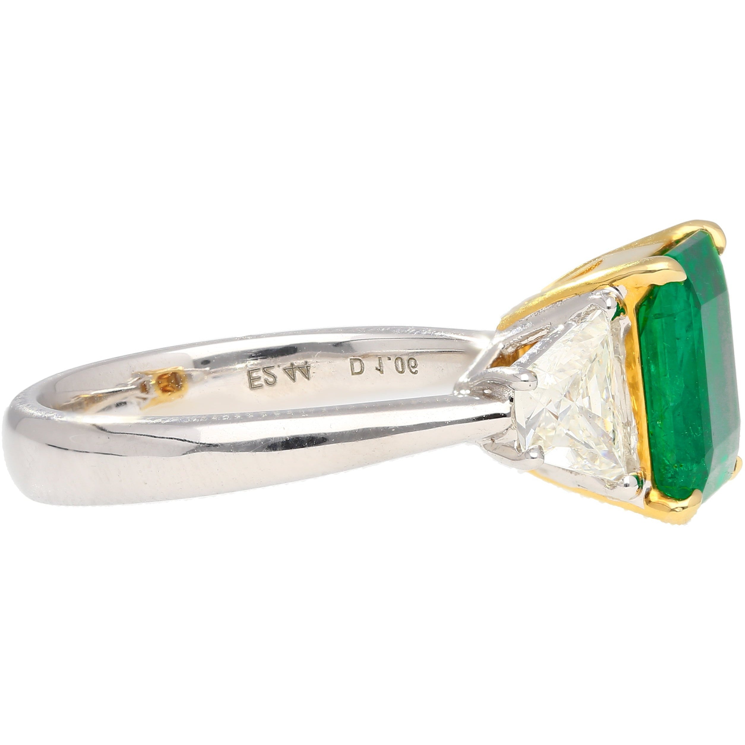 2.44 Carat Emerald Cut No Oil Green Emerald Trapezoid Diamond Three Stone Ring