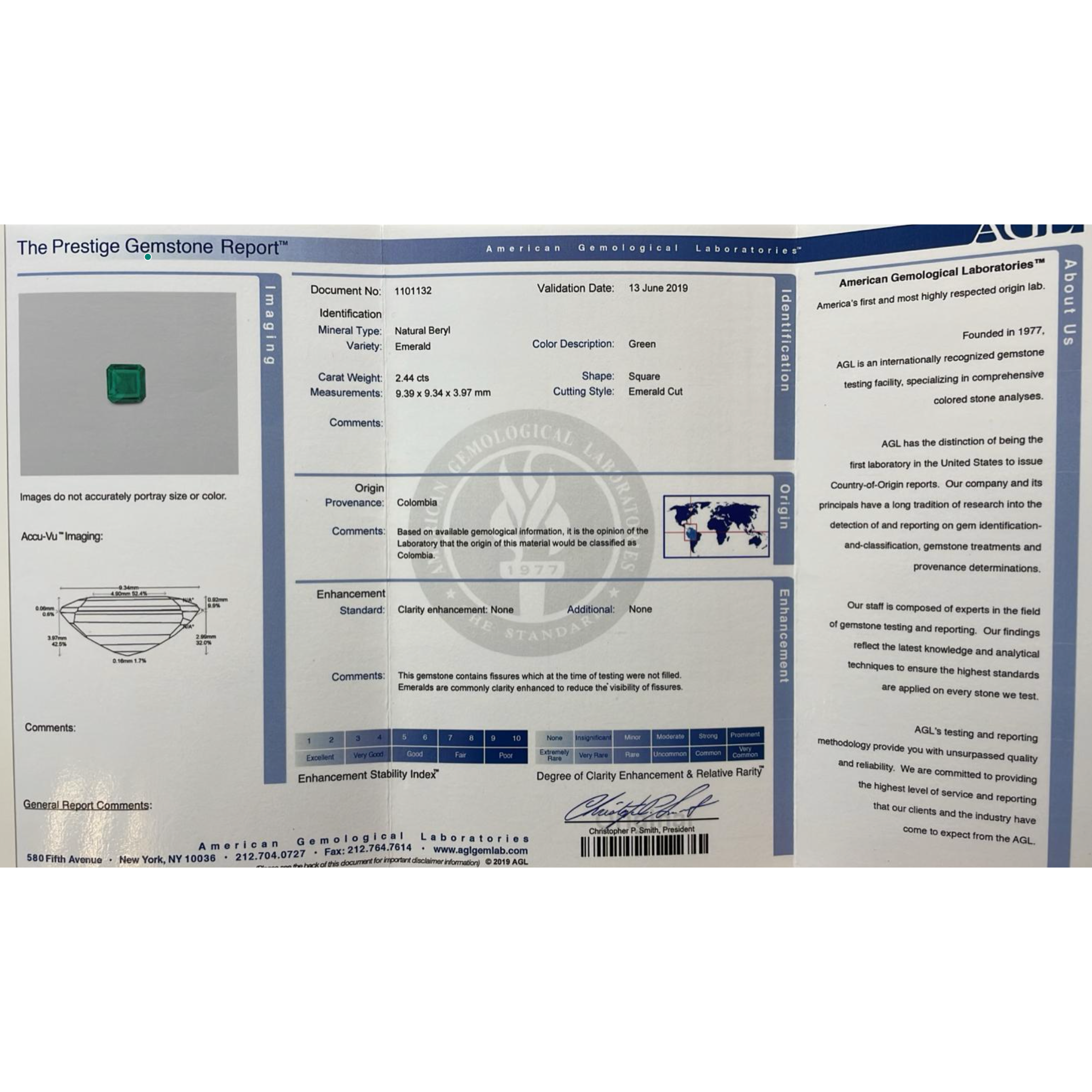 - Accompanied by AGL report no. 1101132 stating the emerald is natural, emerald cut, green color, and untreated