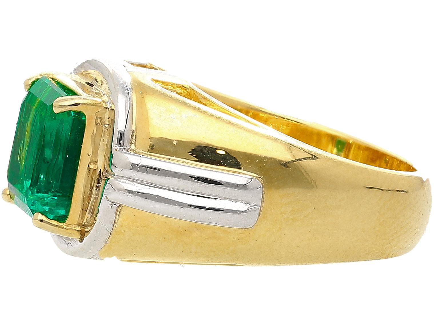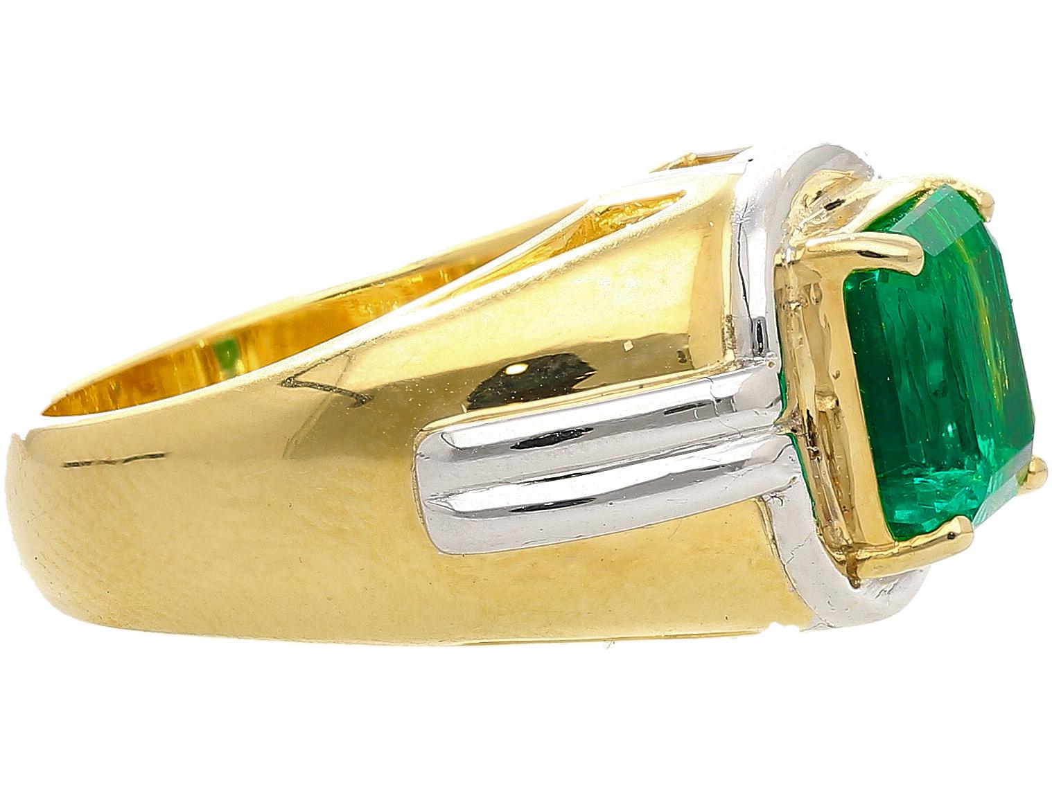 AGL certified 3.98 carat Colombian emerald set in platinum and 18K yellow gold men's ring. Emerald cut Colombian emerald with minor oil treatment in two-tone setting with beveled platinum inlays.