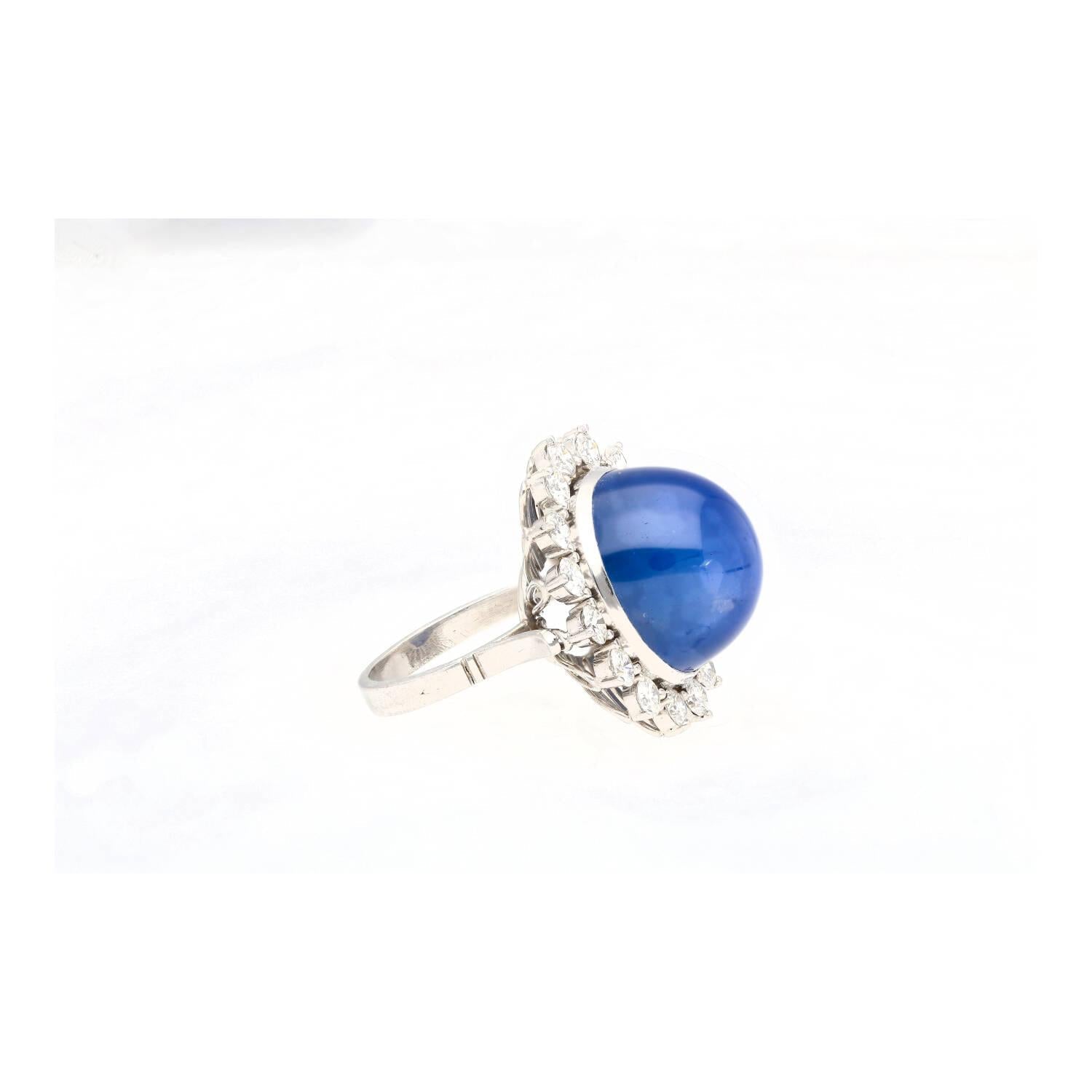 AGL certified approximately 30 carat natural blue star sapphire set in a platinum diamond halo ring. This is a cabochon oval cut star sapphire ring from Ceylon with round diamond accents.