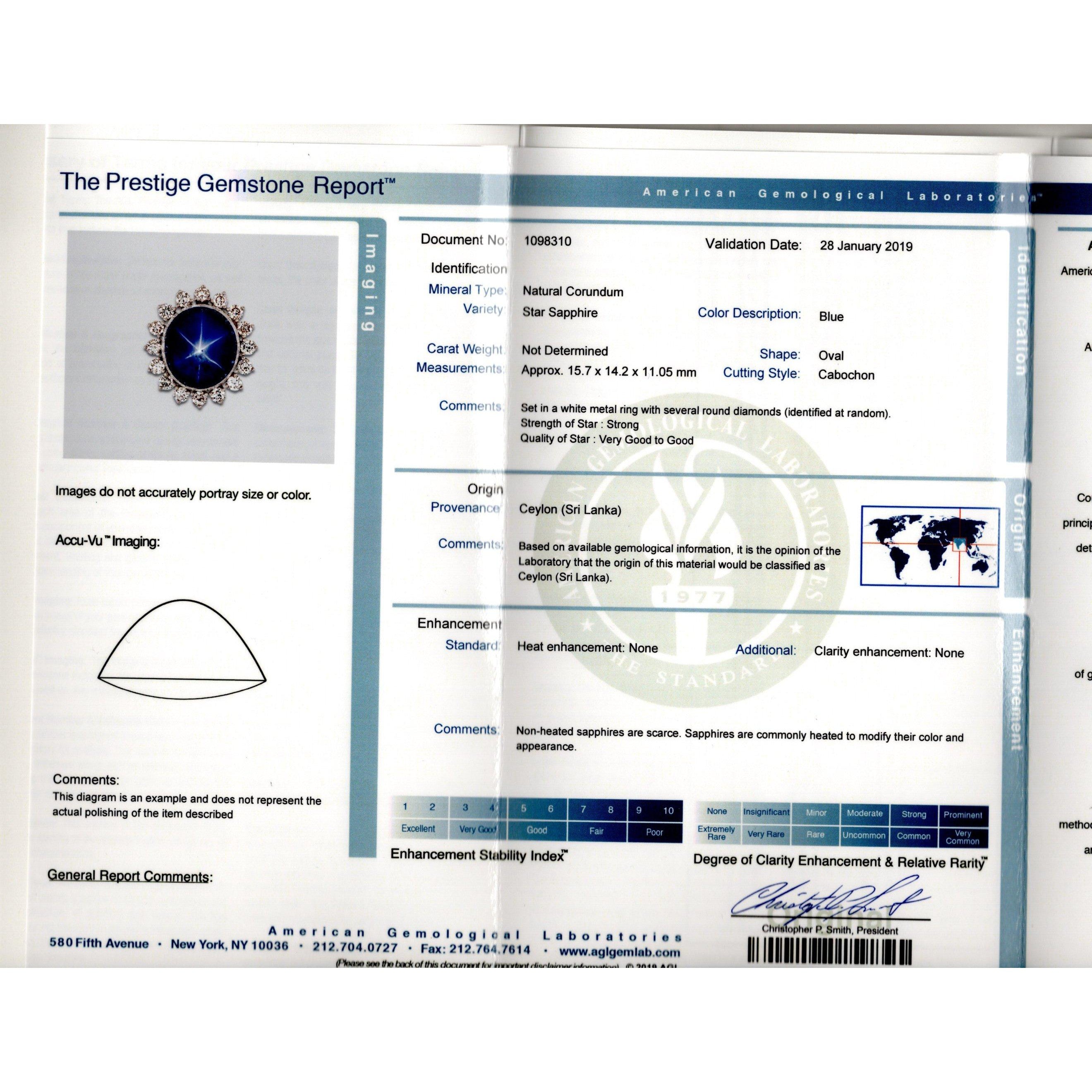- Accompanied by AGL report no. 1098310 stating the sapphire is natural, Ceylon origin, blue color, cabochon oval cut, and unheated