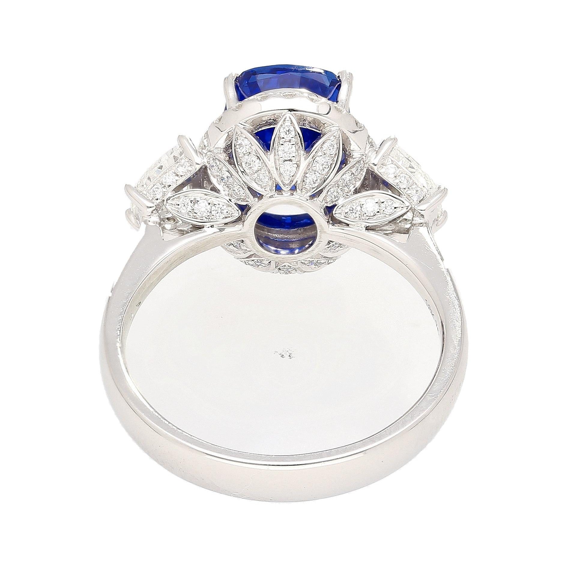 AGL certified 4.07 carat oval cut blue sapphire set in an 18K white gold engagement ring. The ring uses a prong set sapphire from Burma with half moon diamond side stones and a round cut diamond halo extending along a split cathedral shank.
