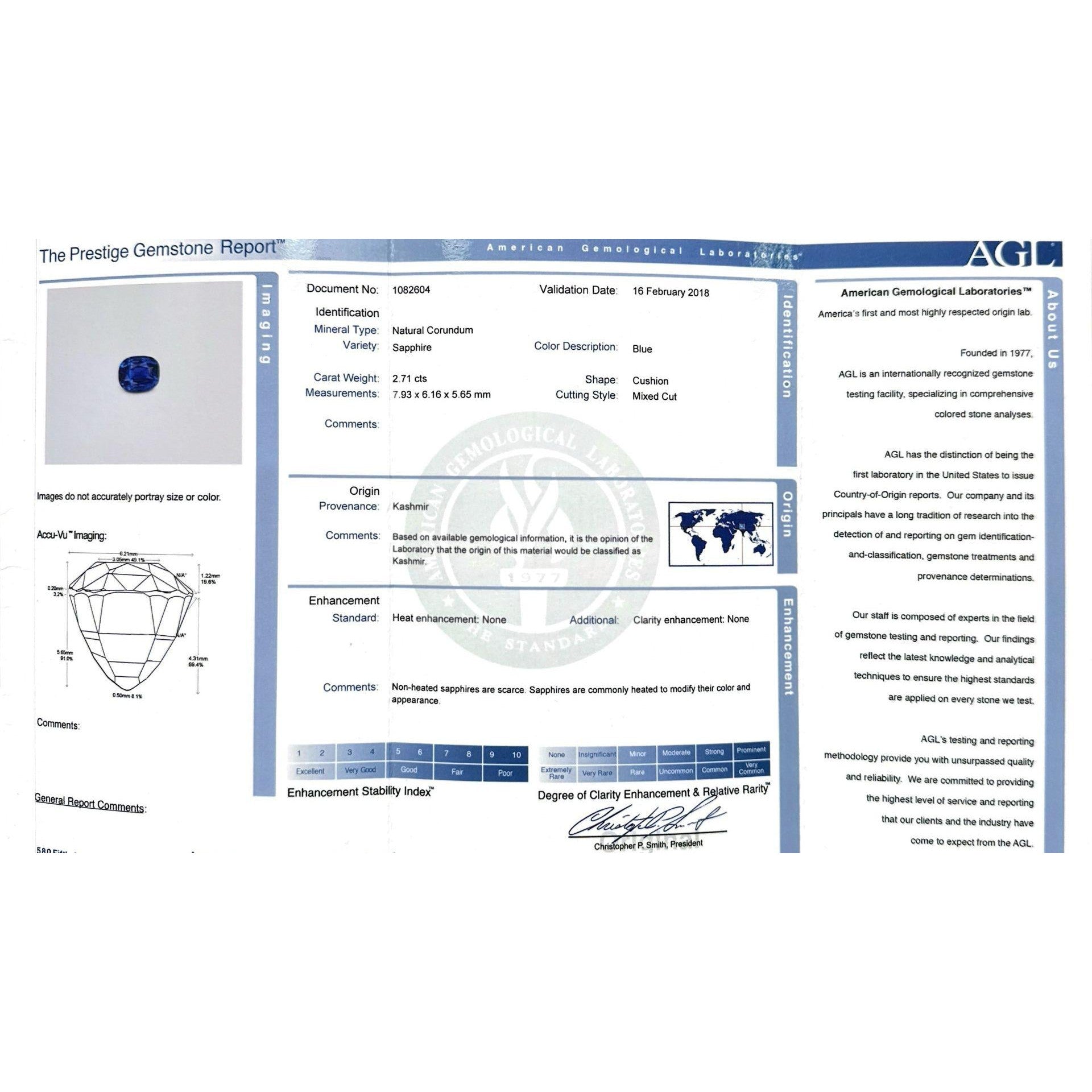 - Accompanied by AGL report no. 1096654 stating the sapphire is natural, Kashmir origin, blue color, no heat treatment