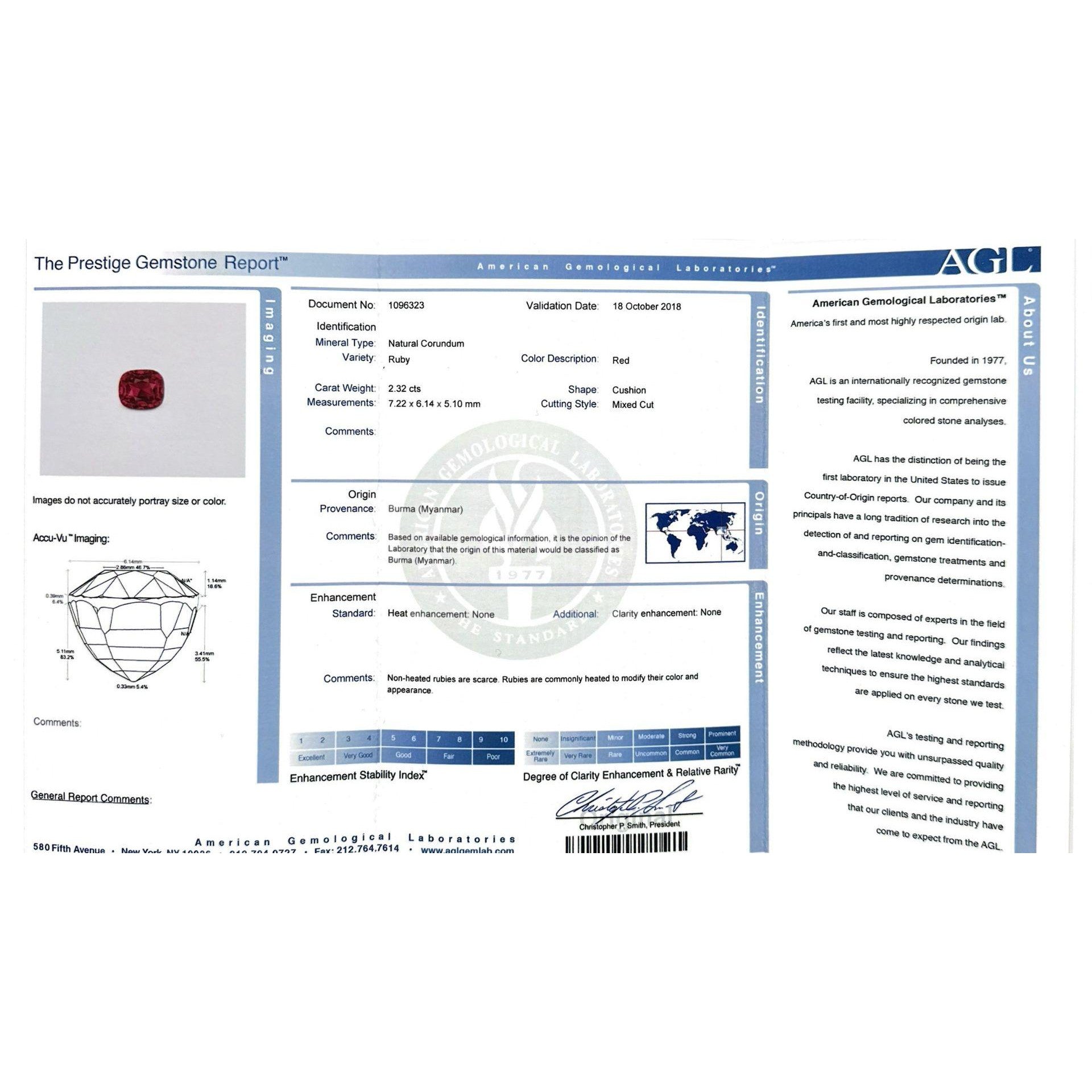 - Accompanied by AGL report no. 1082604 stating the ruby is natural, Burma origin, red color, no heat treatment