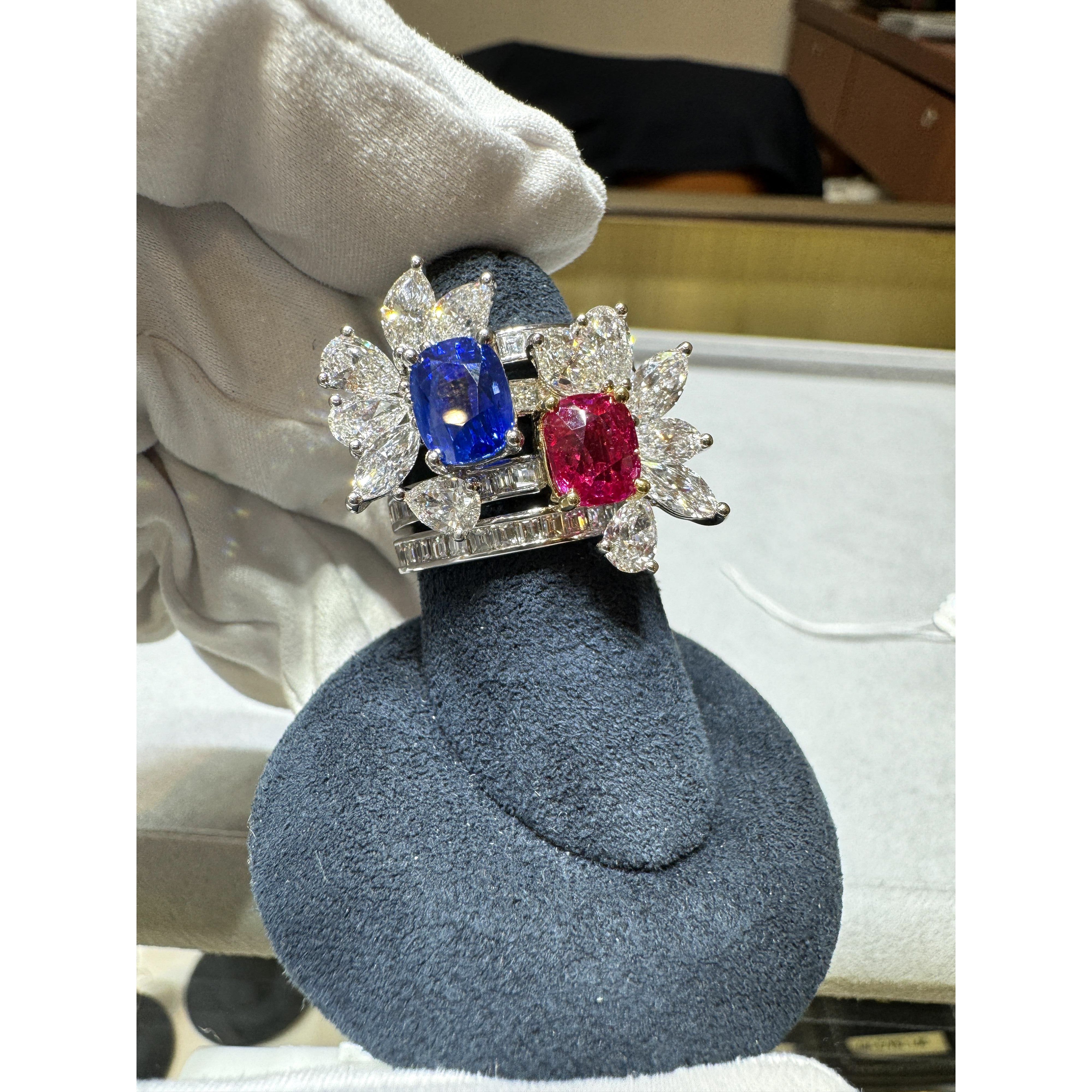 - 4 marquise cut diamonds per ring (ruby and sapphire)