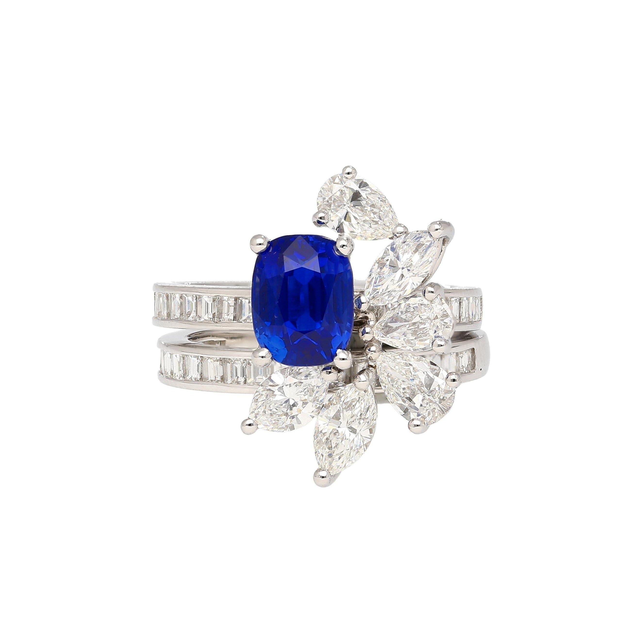 AGL certified no heat Kashmir sapphire and Burma ruby detachable stack ring set in 18K white and yellow gold toi et moi design with marquise, drop, and baguette diamond accents. The four-band stackable design features 2.71 carat cushion Kashmir sapphire and 2.32 carat cushion Burma ruby with individual detachable bands.