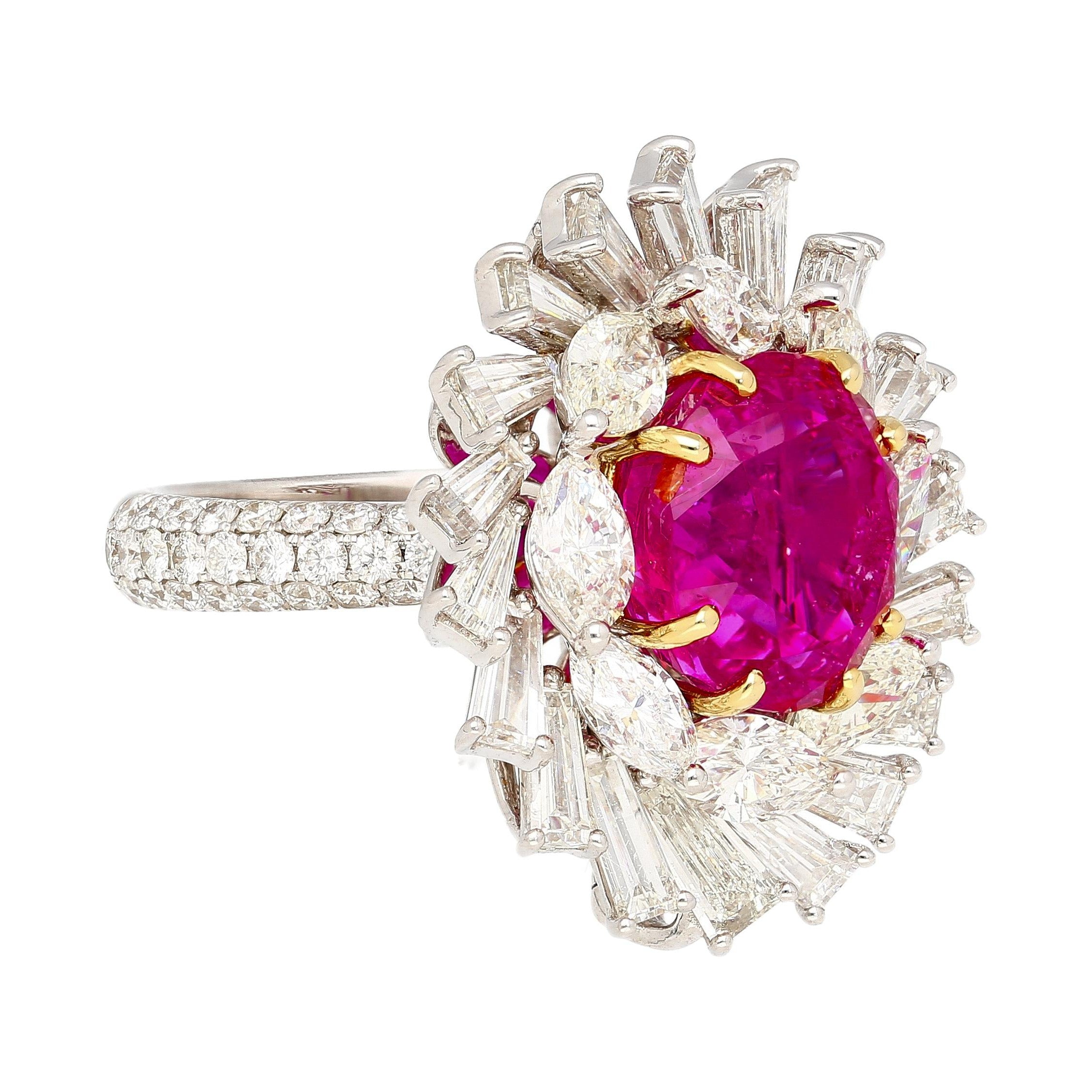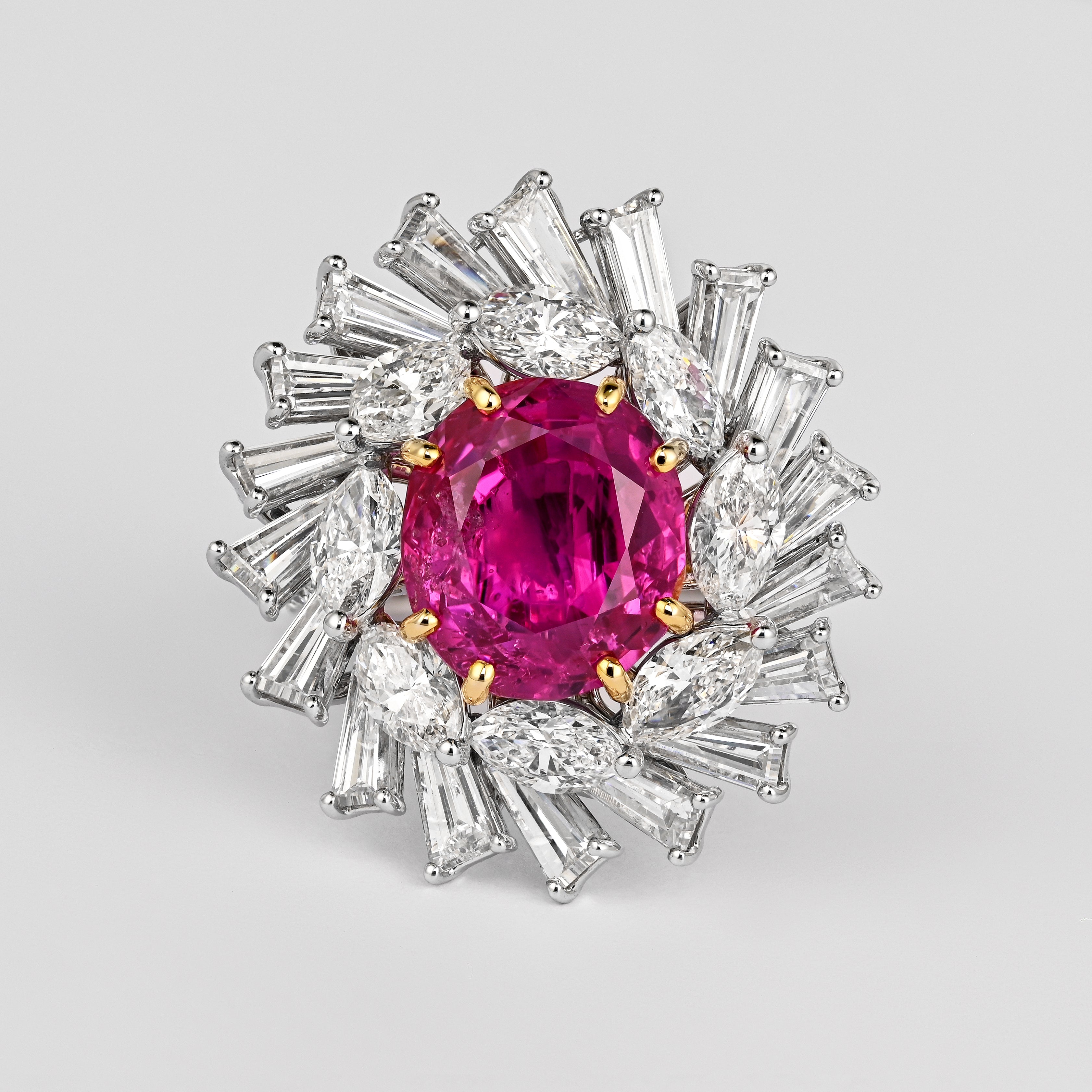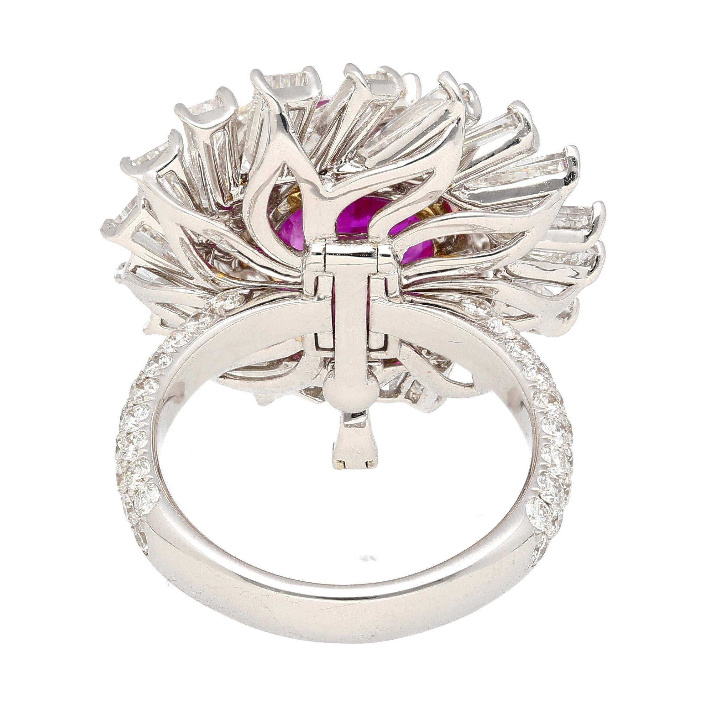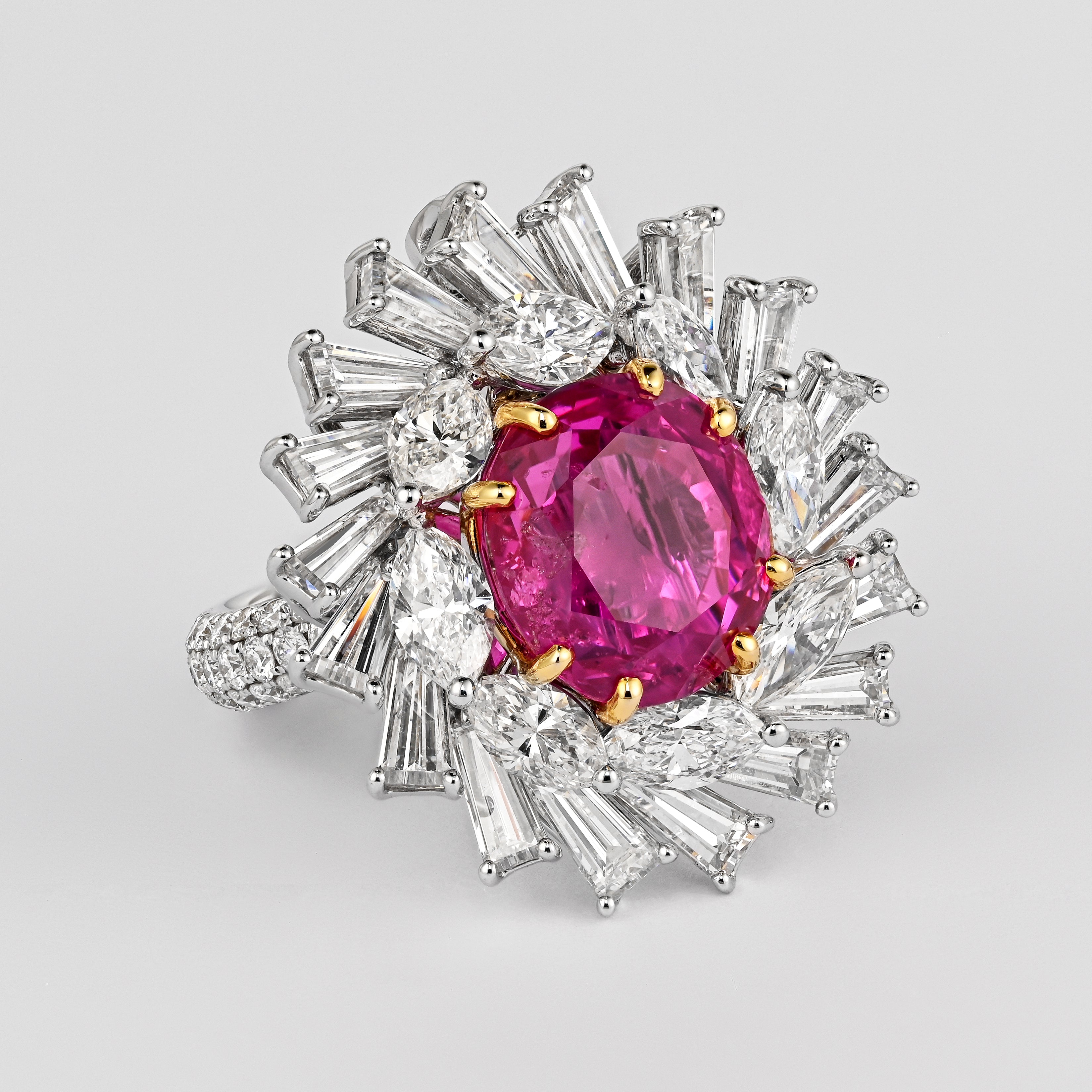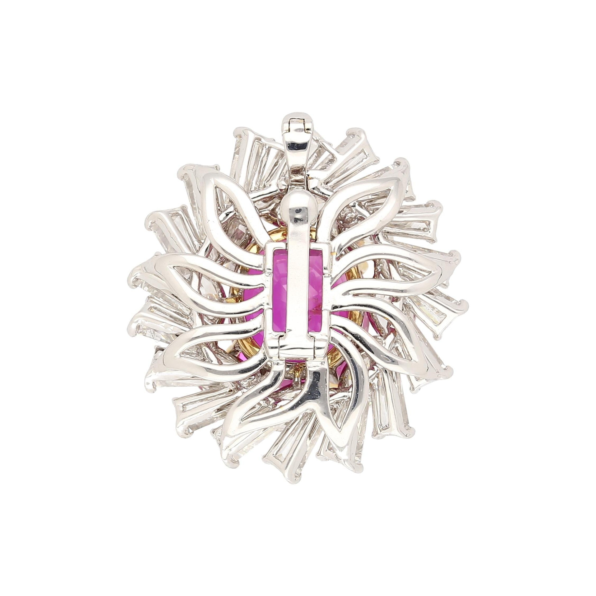 AGL certified 9.55 carat no heat pink sapphire set in an 18K white gold detachable ring to pendant. The piece converts between ring and pendant and uses a prong set oval sapphire with a mixed cut diamond halo and pavé diamond shank.