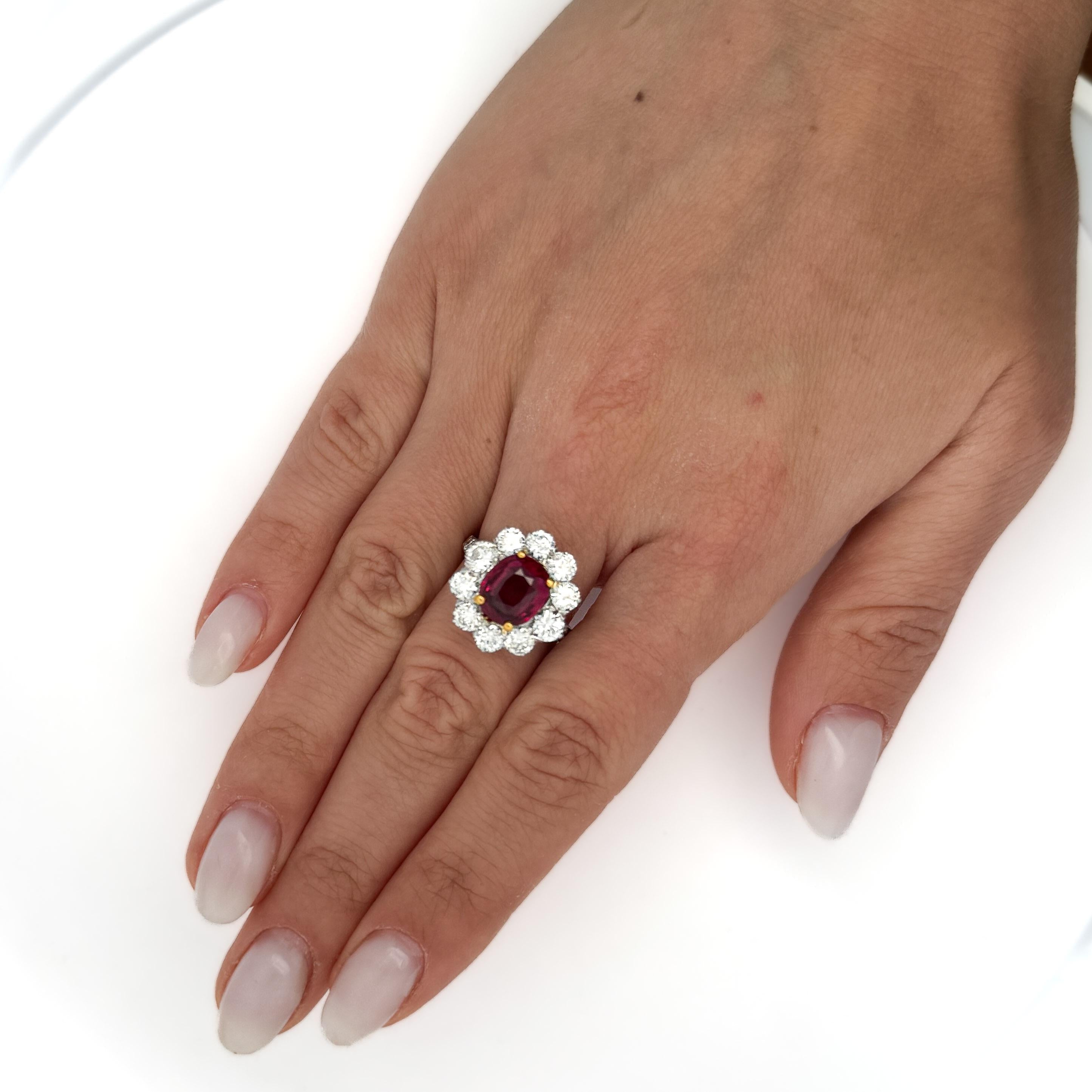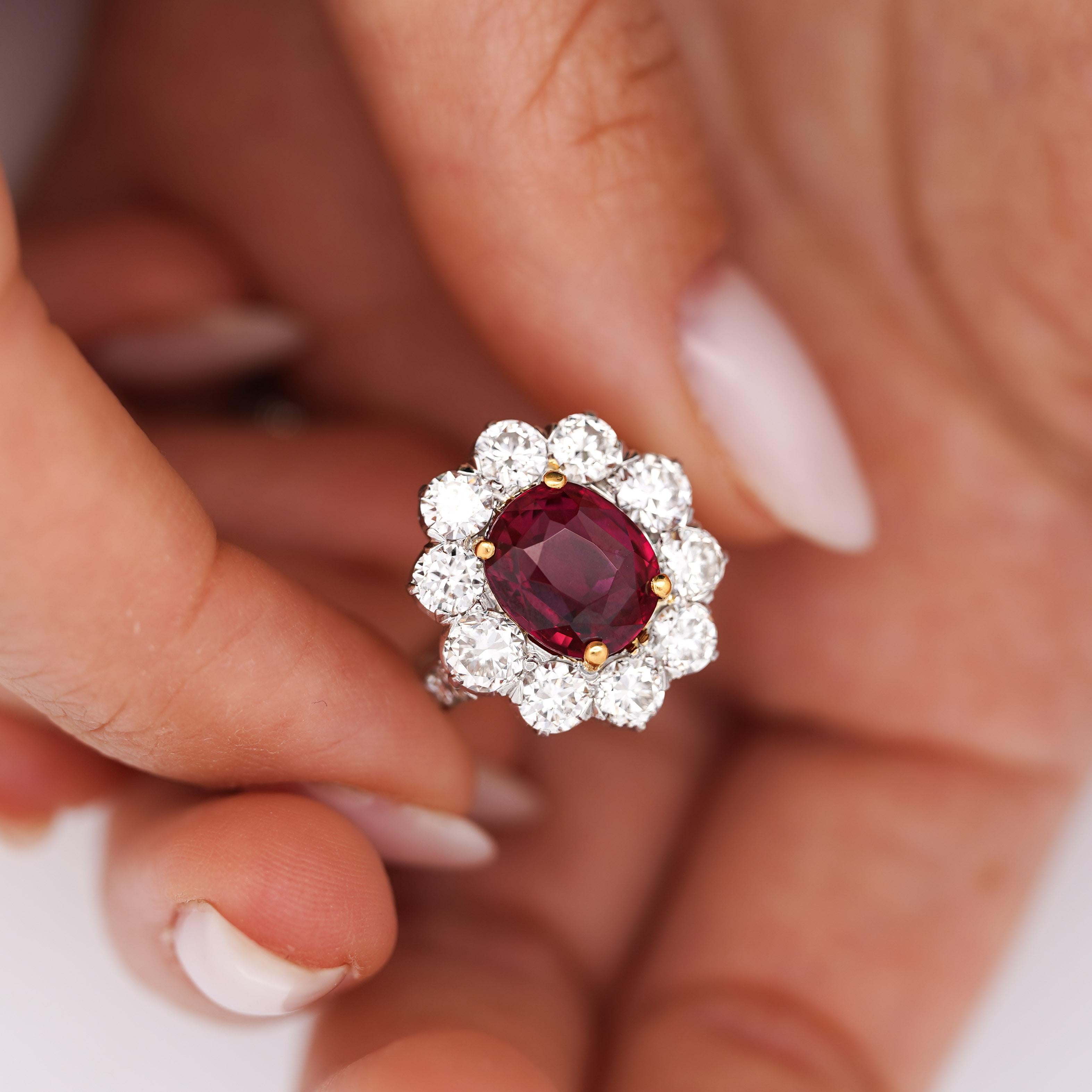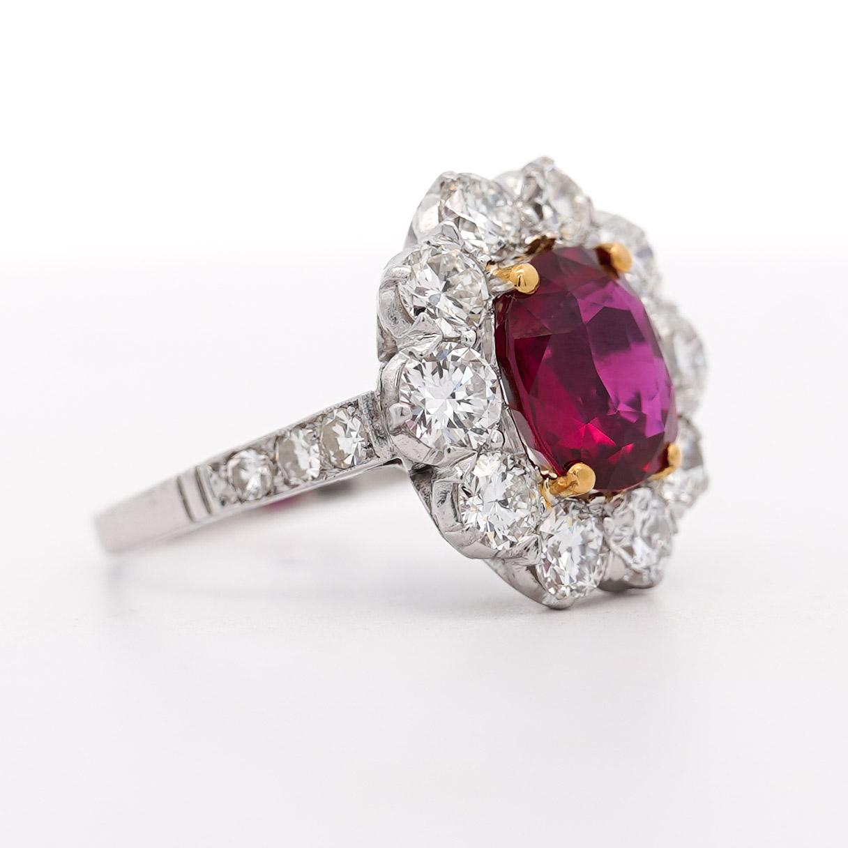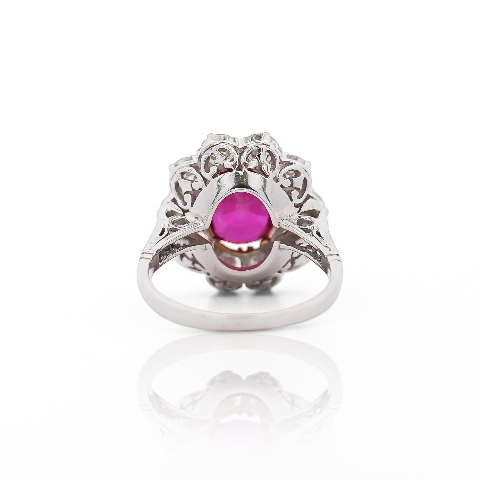 Vintage Art Deco original platinum ring featuring a 4.05-carat oval cut Thai ruby, certified by AGL. The ruby is framed by a halo of old European and French-cut diamonds, totaling 2.20 carats. Ring size 7, adjustable.