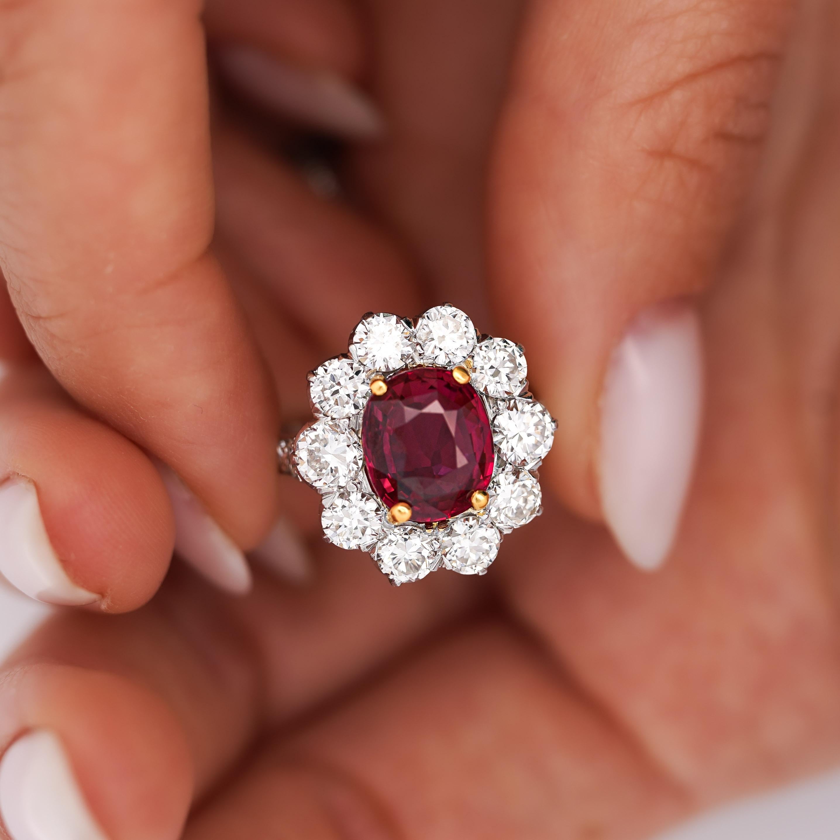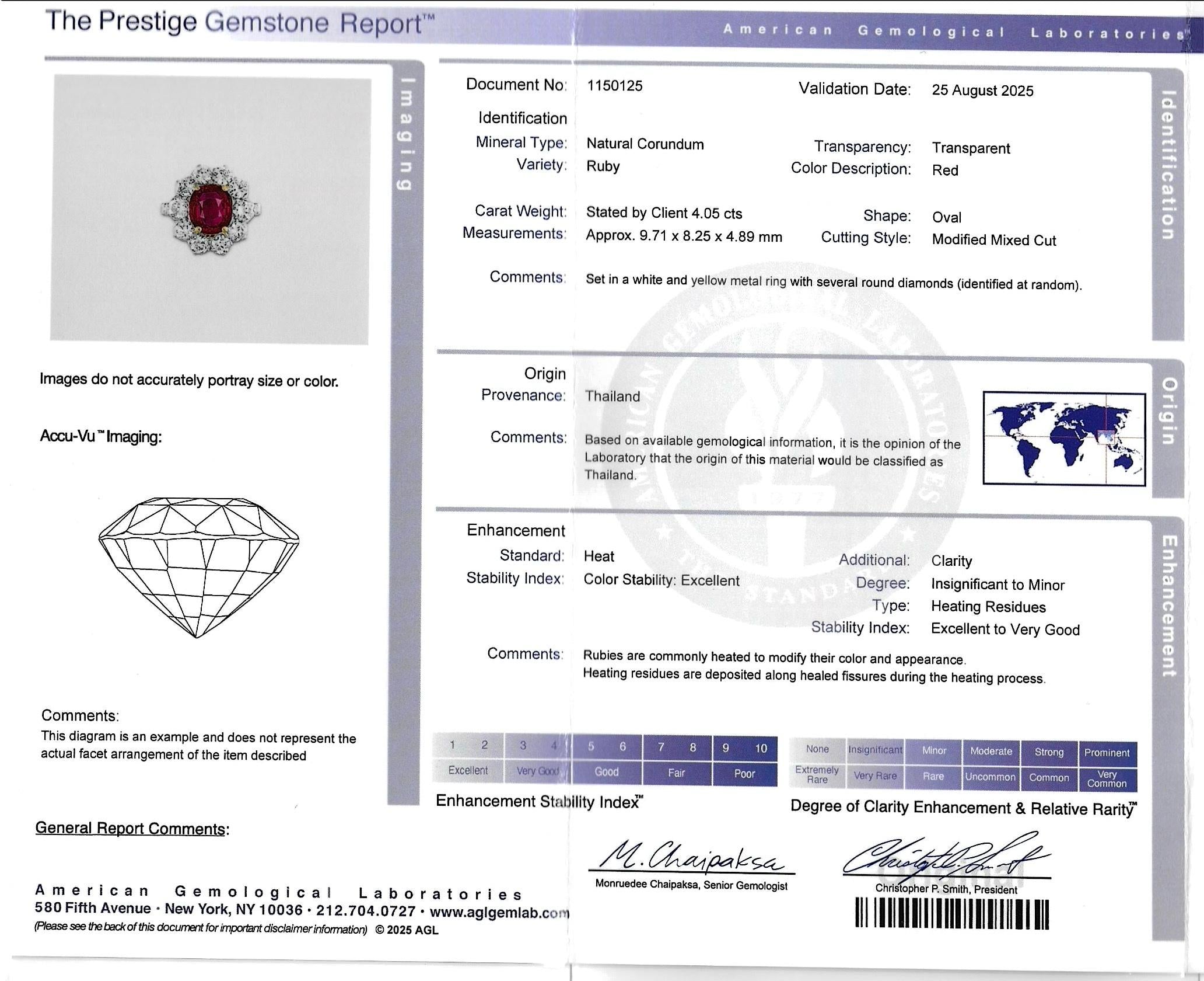 The centerpiece 4.05 carat Thai ruby displays excellent transparency and deep red color enhanced through traditional heating treatment. AGL certification confirms the stone's natural origin and quality characteristics. The surrounding 2.20 carats of vintage-cut diamonds feature the distinctive faceting patterns of old European and French single cuts, creating unique light play and romantic sparkle that perfectly complements the Art Deco aesthetic.