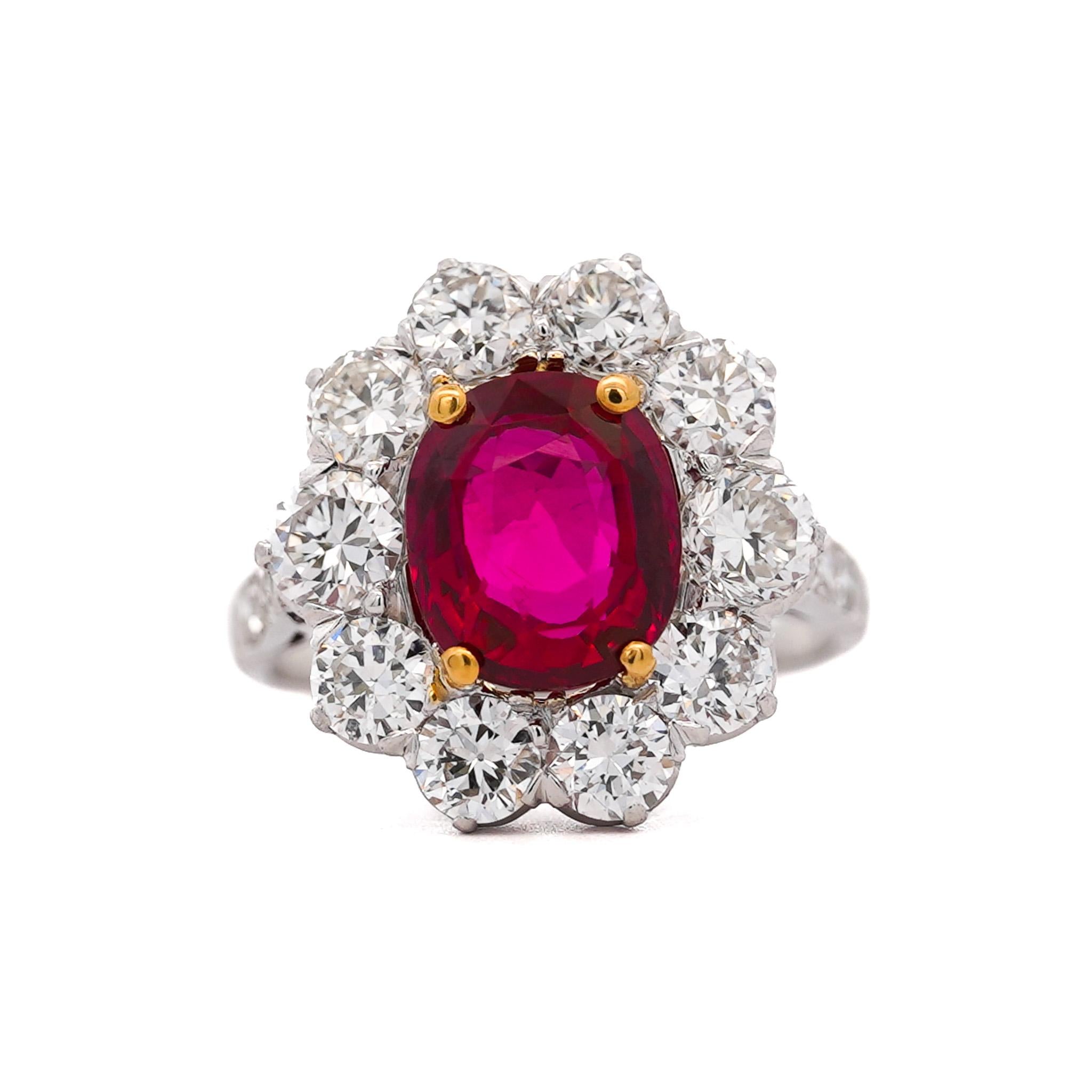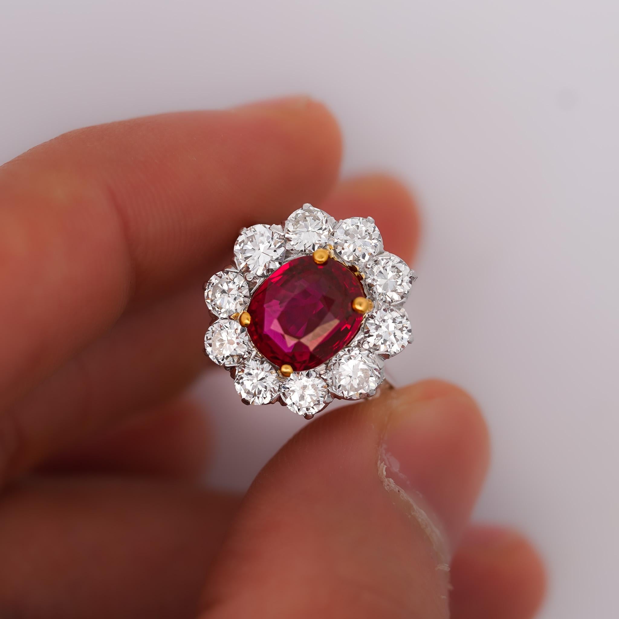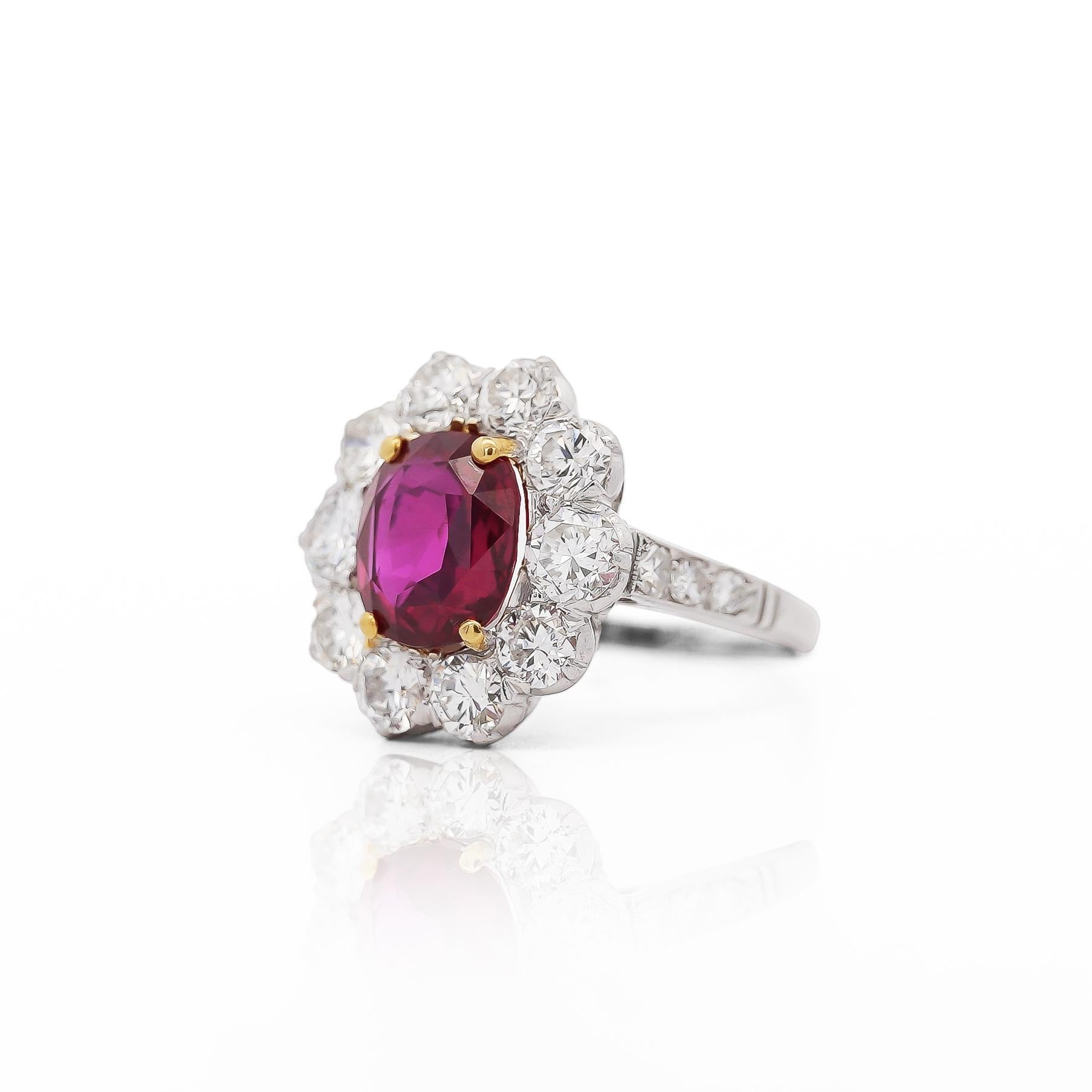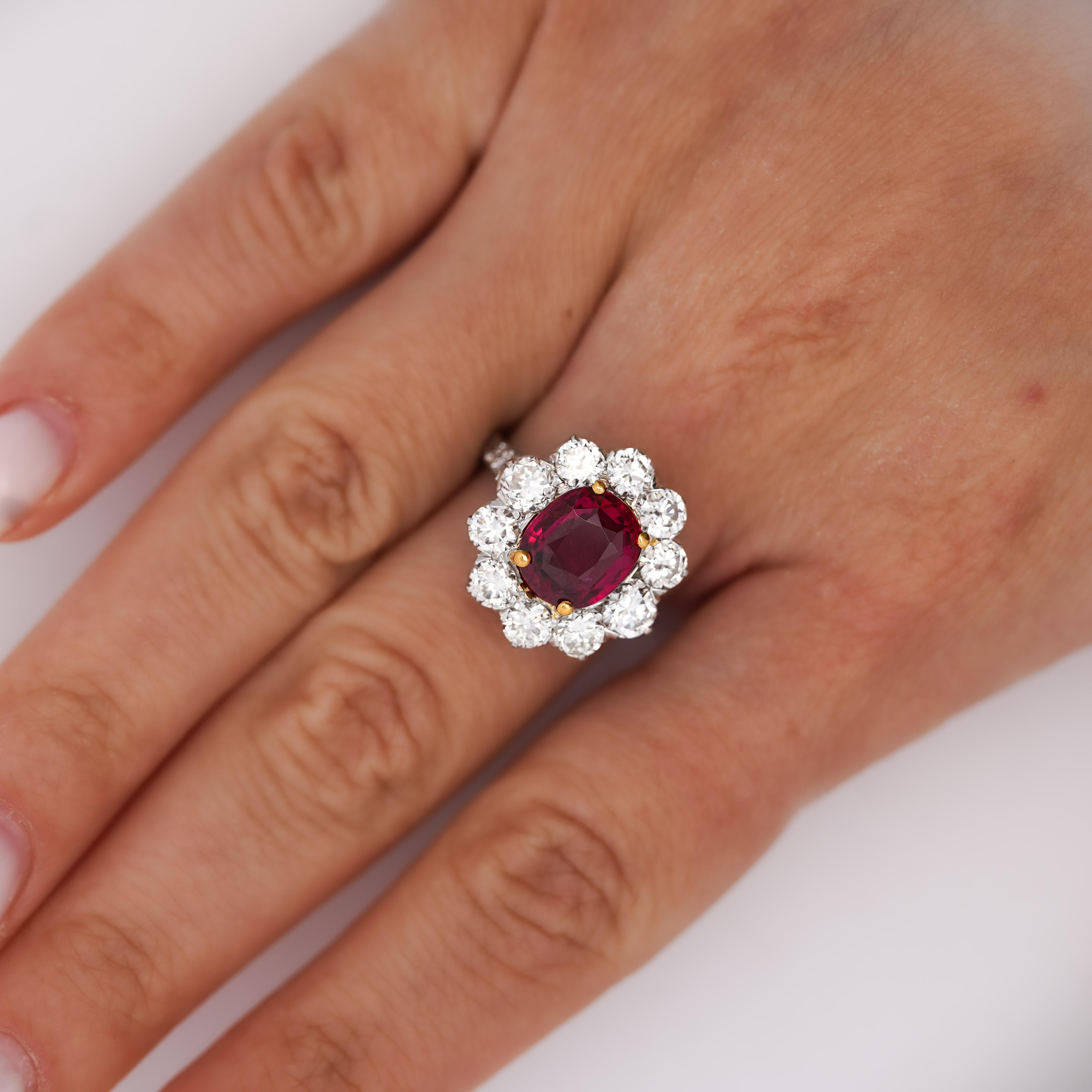 This authentic Art Deco platinum mounting showcases exceptional period craftsmanship with intricate metalwork and scalloped detailing. The cluster design positions the 4.05 carat ruby at center surrounded by graduated old European cut diamonds creating a spectacular floral motif. The substantial 7.54 gram platinum construction ensures durability while maintaining the elegant proportions characteristic of 1930s design.