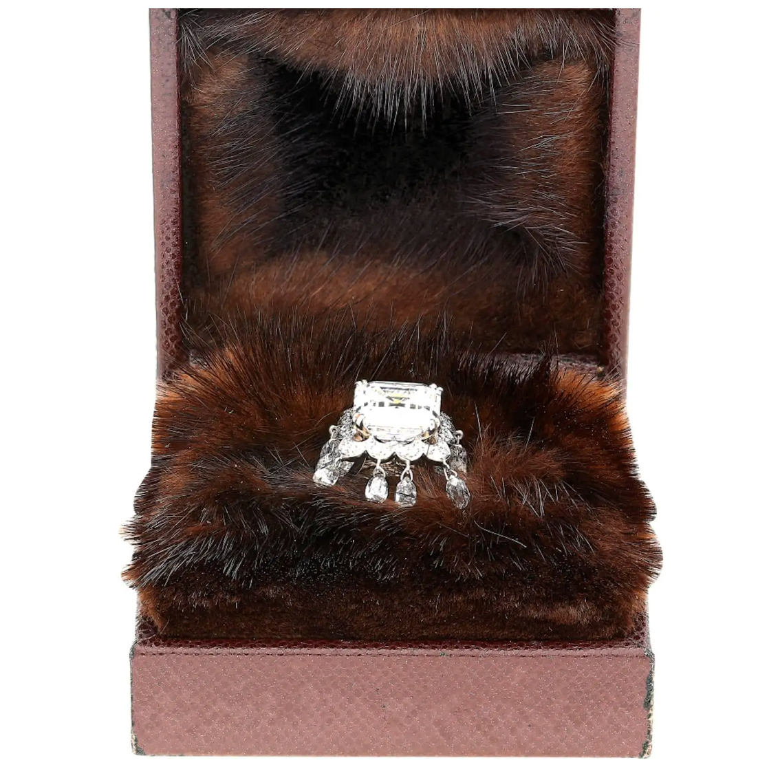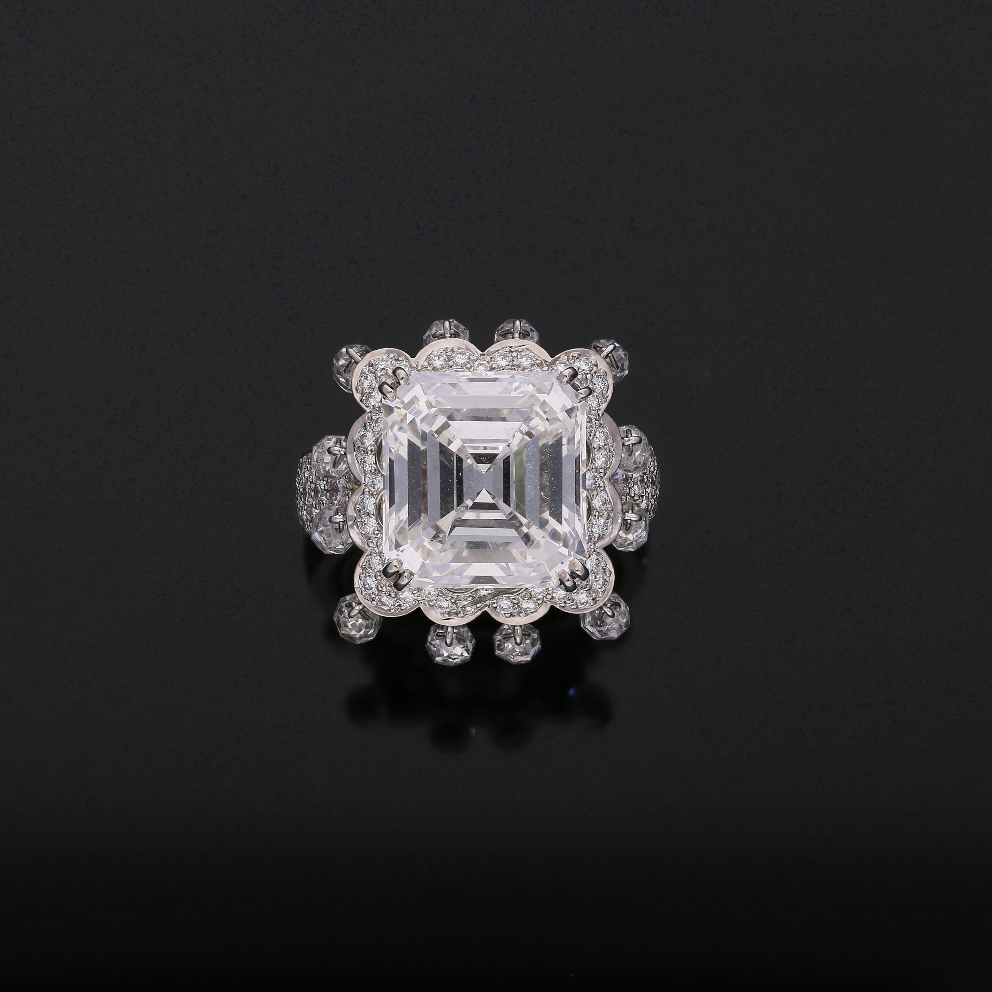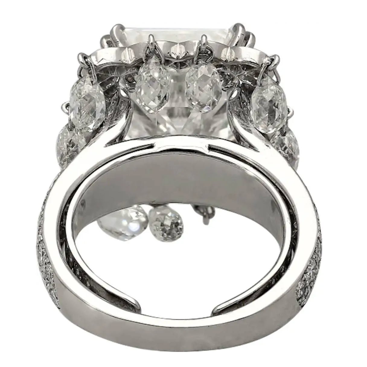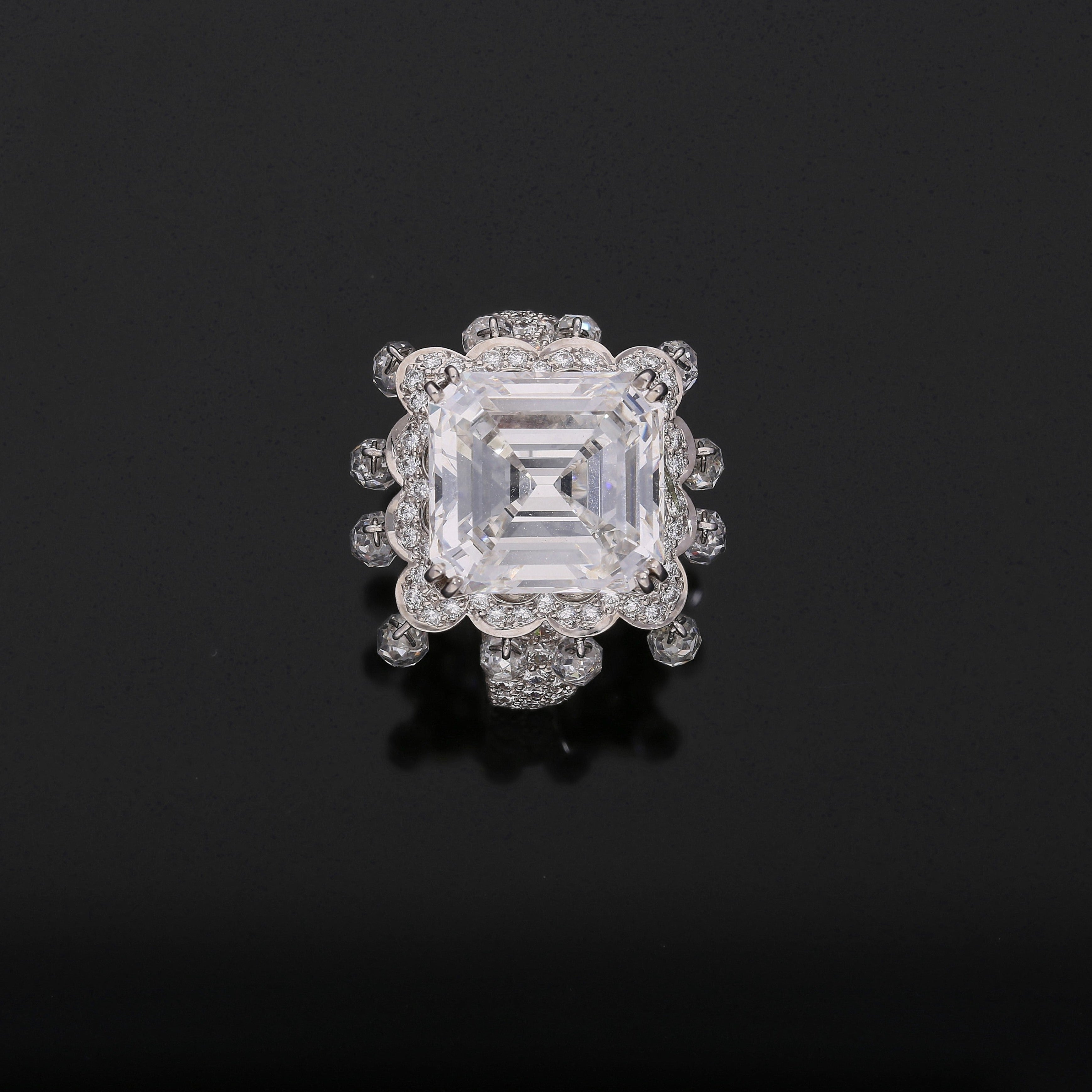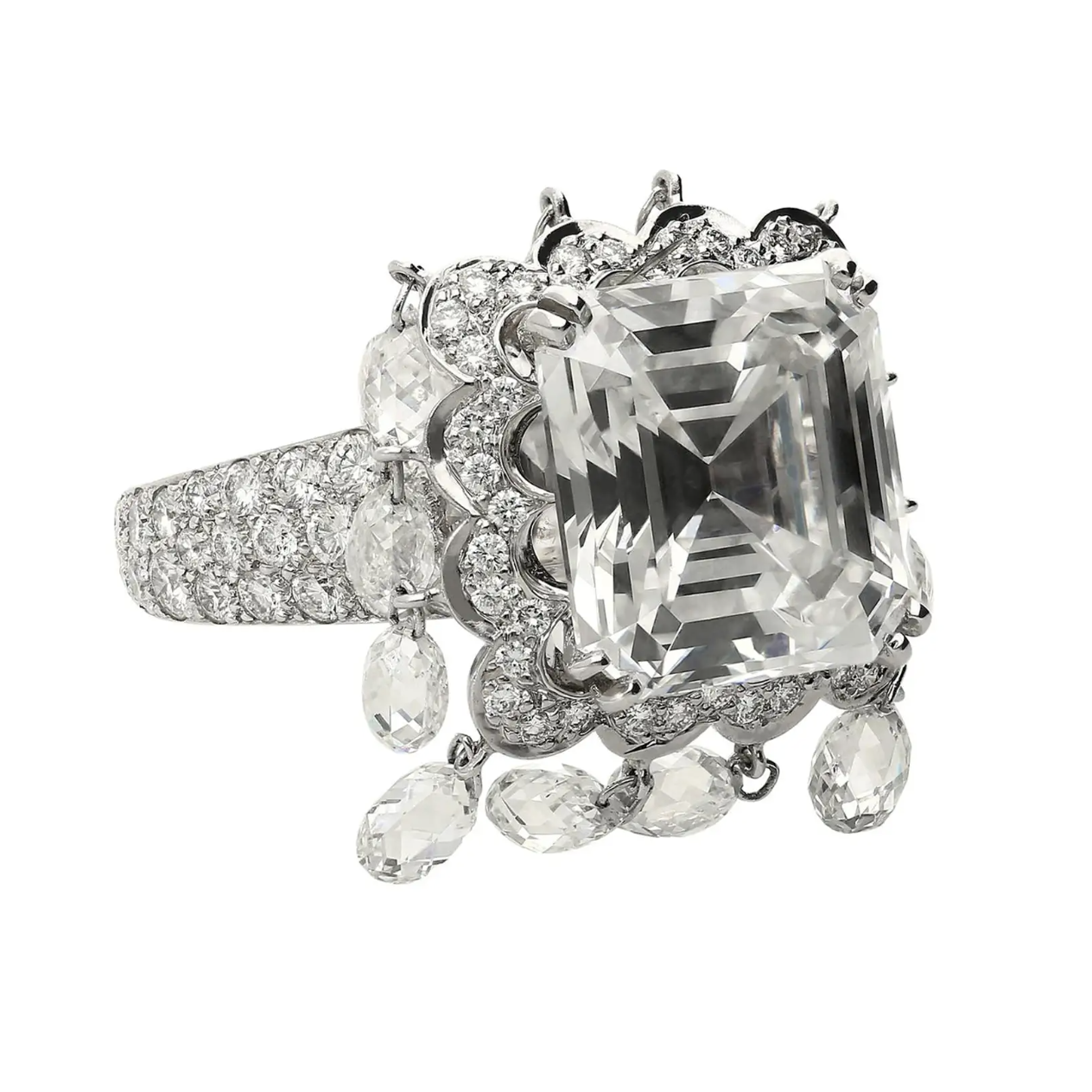 GIA certified 8.03 carat natural diamond set in an 18K white gold ring by Boucheron. This is an emerald cut diamond ring with briolette cut diamond drops and round brilliant cut diamond accents.