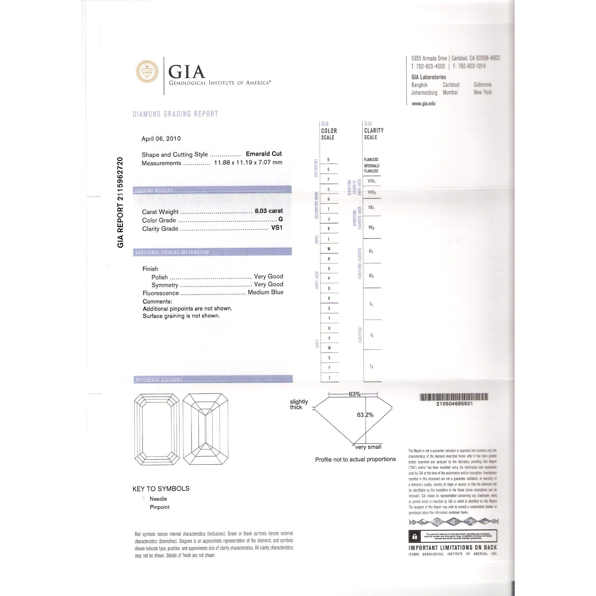 - Accompanied by GIA report no. 2115962720 stating the center diamond is natural, emerald cut, G color, VS1 clarity, and weighs 8.03 carats