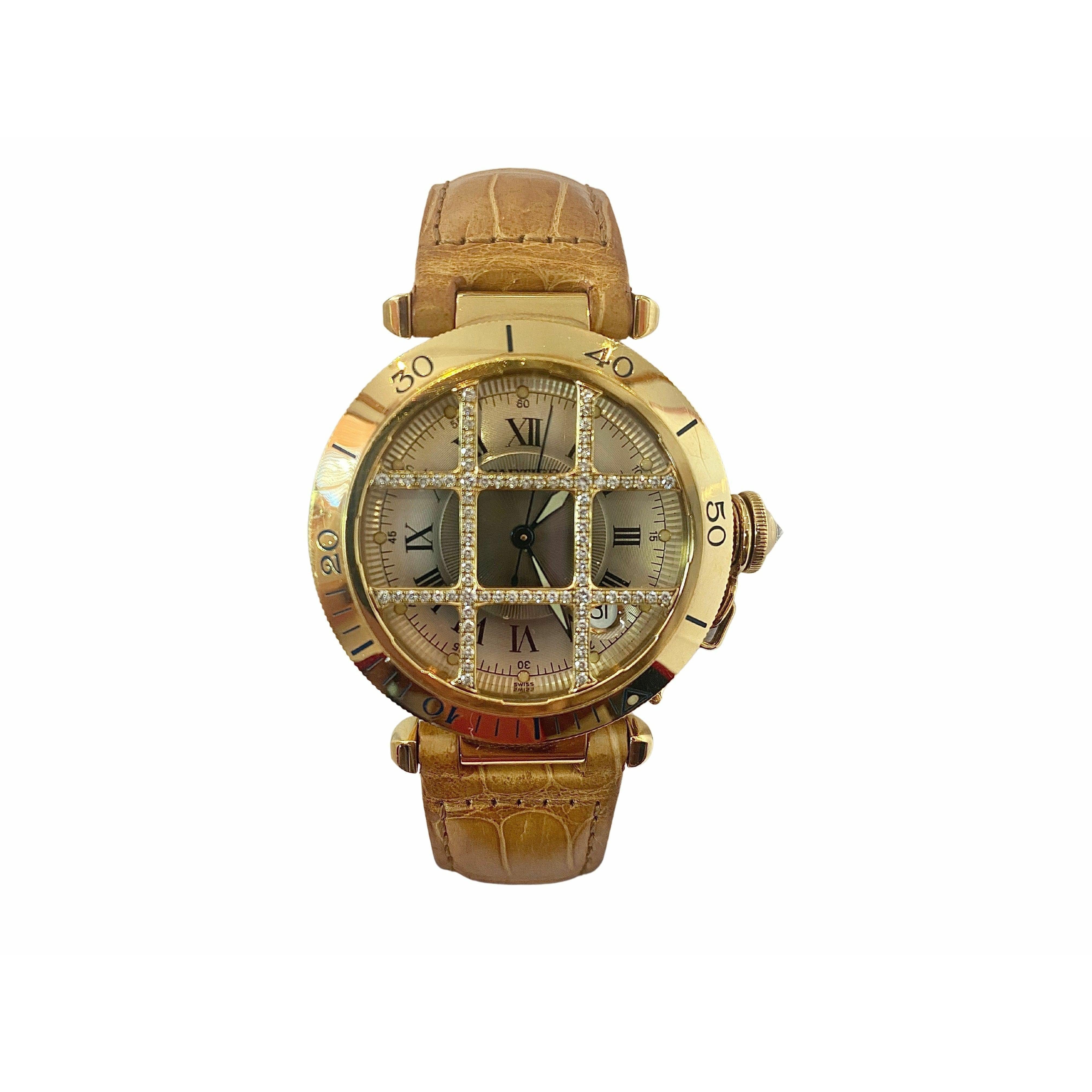 This watch features a 38mm dial with a Cartier factory diamond cage, a date window, and fluorescent minute/hour markers. An 18k gold rotating bezel with 10-minute interval markers. The white Sapphire crown also screws off completely but is interlocked and held in place with an attached lock. Similar to that of a hip flask. This watch has been meticulously crafted to perfection. The diamond cage design doesn't hinder the ability to tell the time since the hour/minute hands are thick enough to see through it.