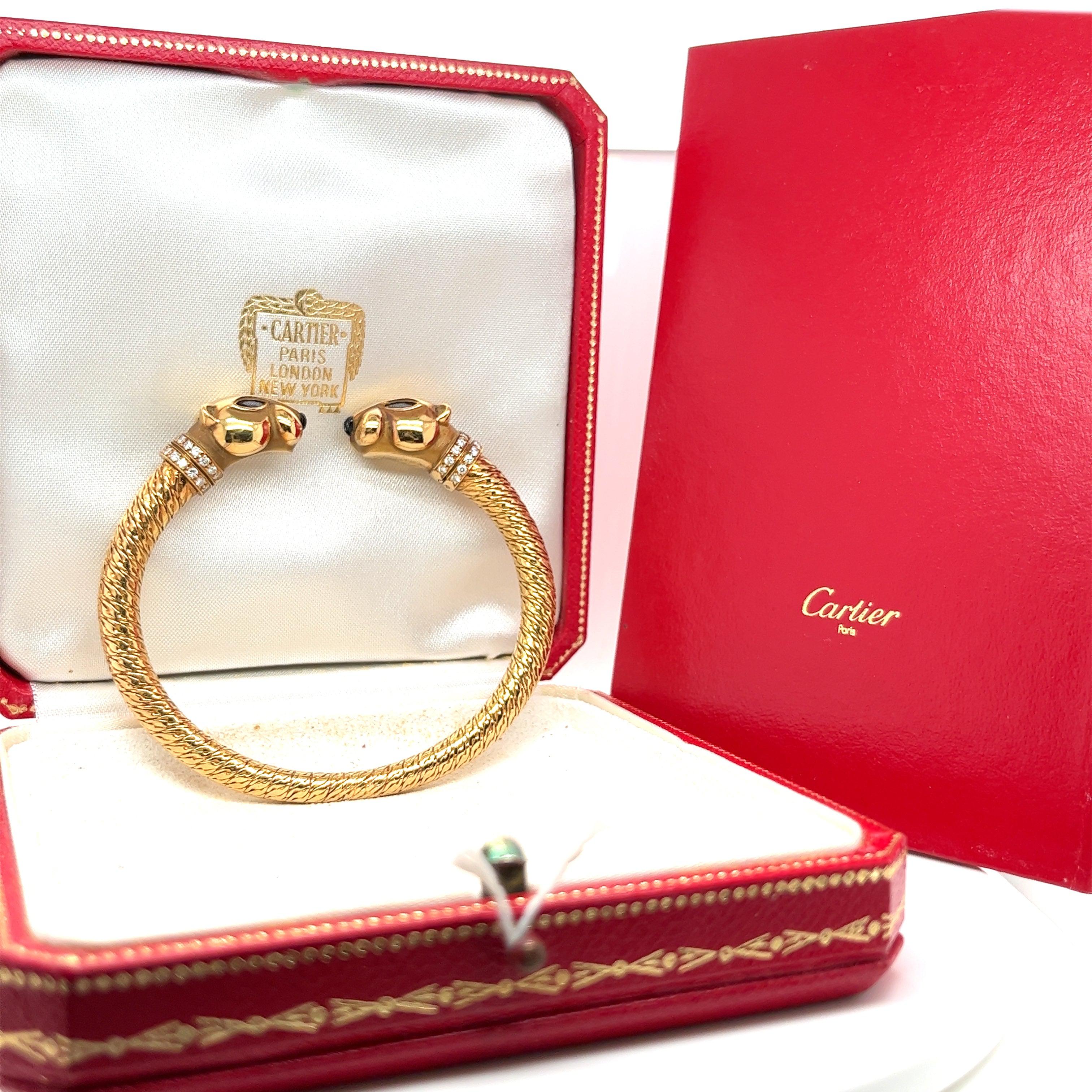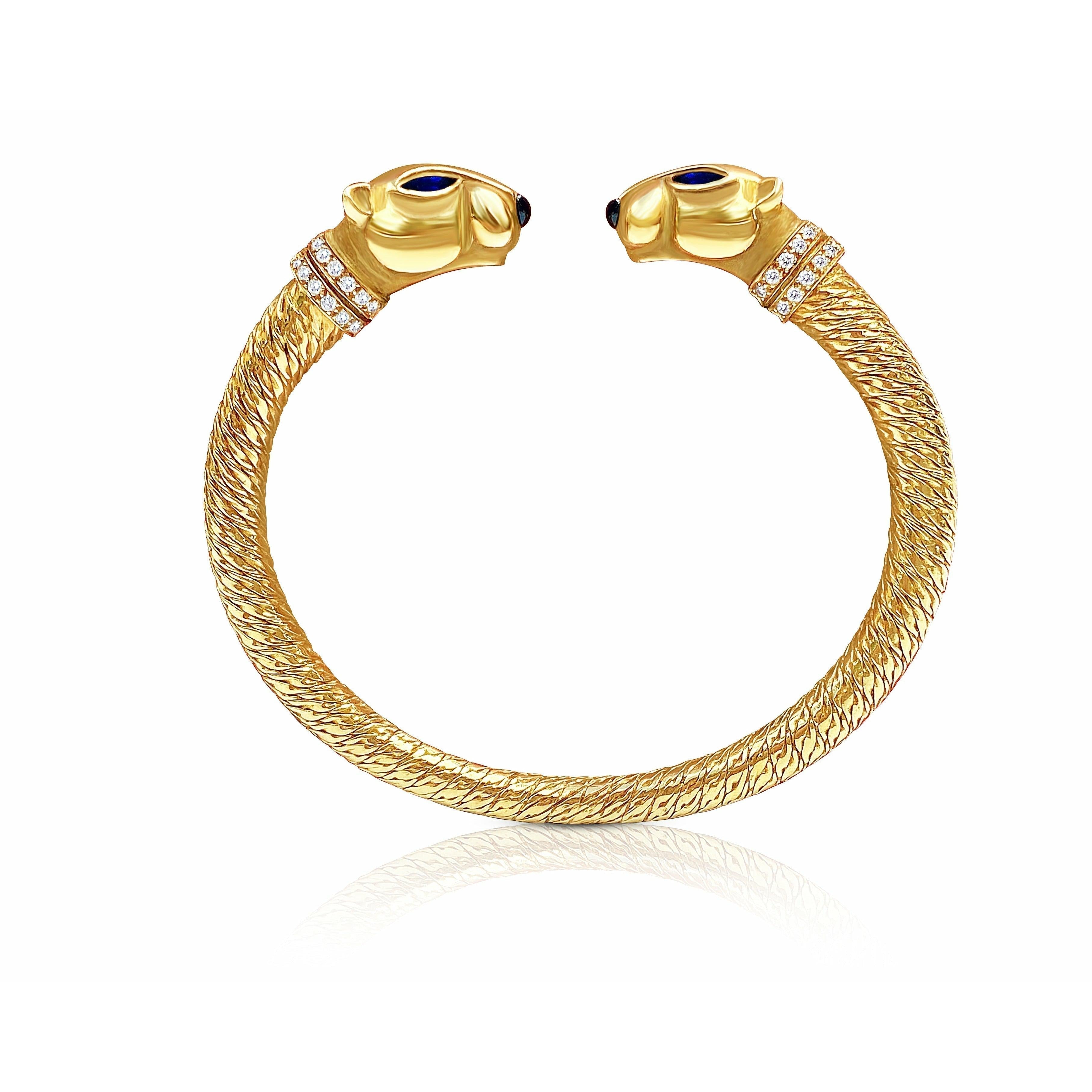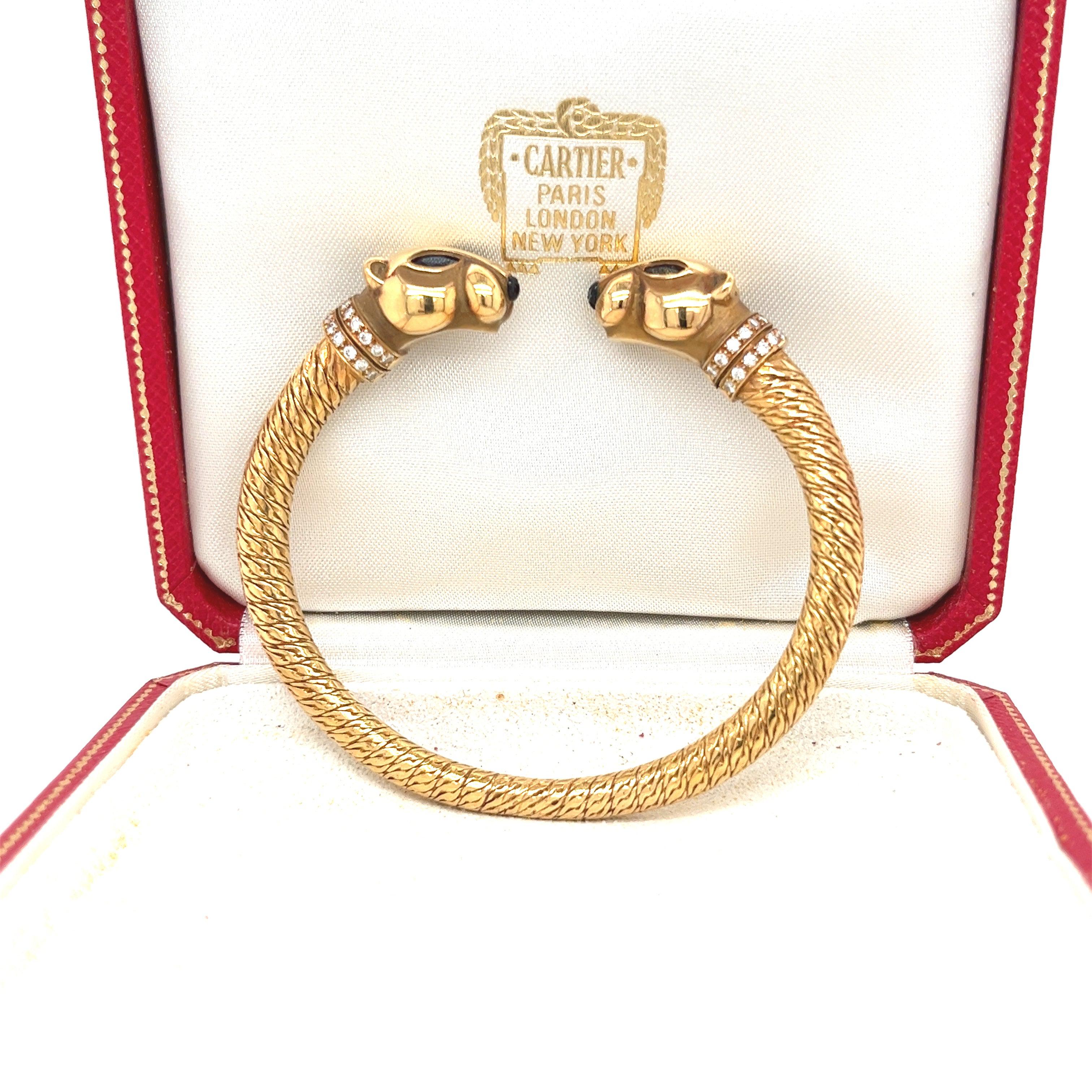 Designed as pair of opposing panthers, set in 18K Yellow Gold and accented by round brilliant cut diamonds, with Cabochon-Cut Onyx noses, and completed by Marquis-Cut Blue Sapphire eyes. Signed Cartier, numbered #639714, with French assay and workshop mark. Bangle is completed with the original box and original Cartier certificate.