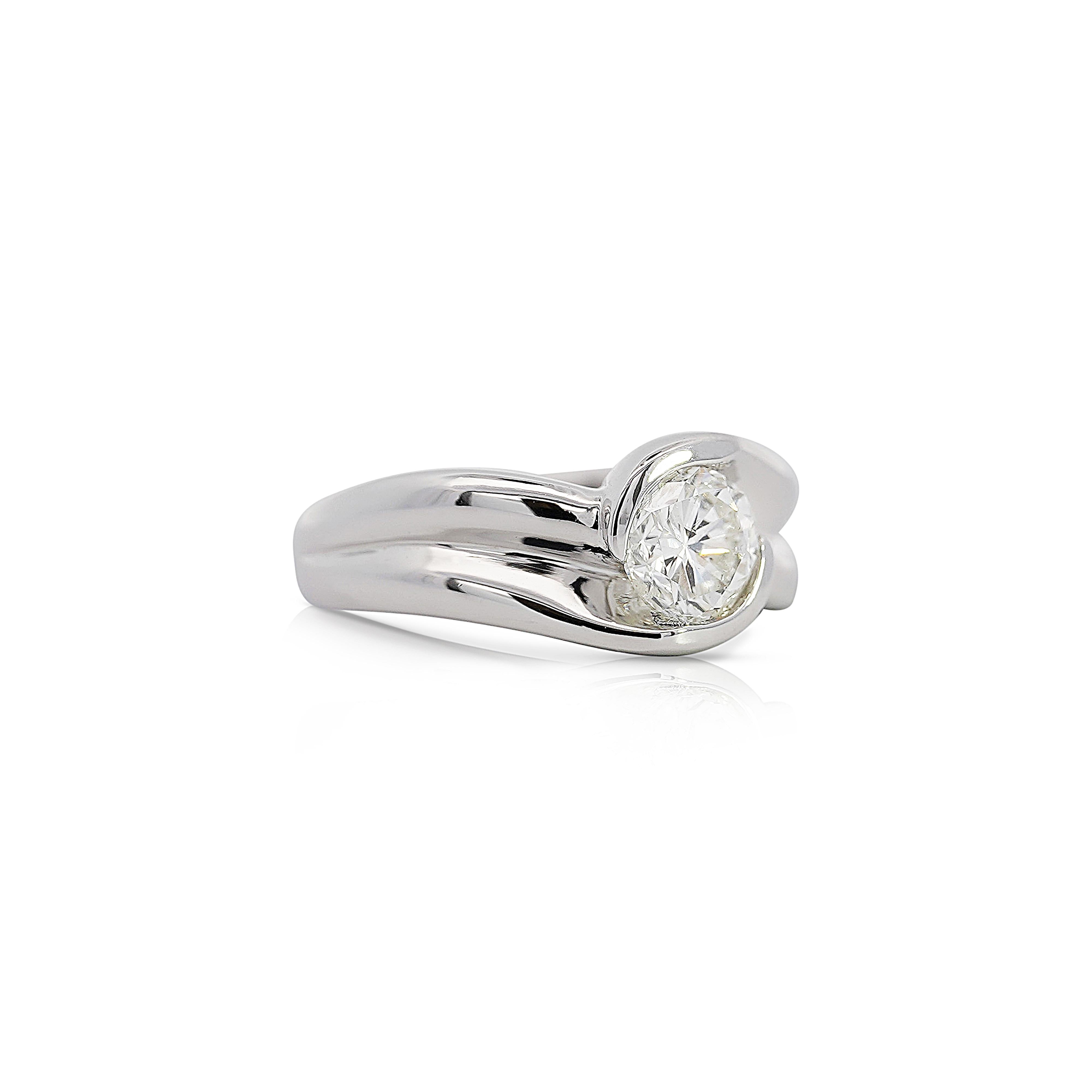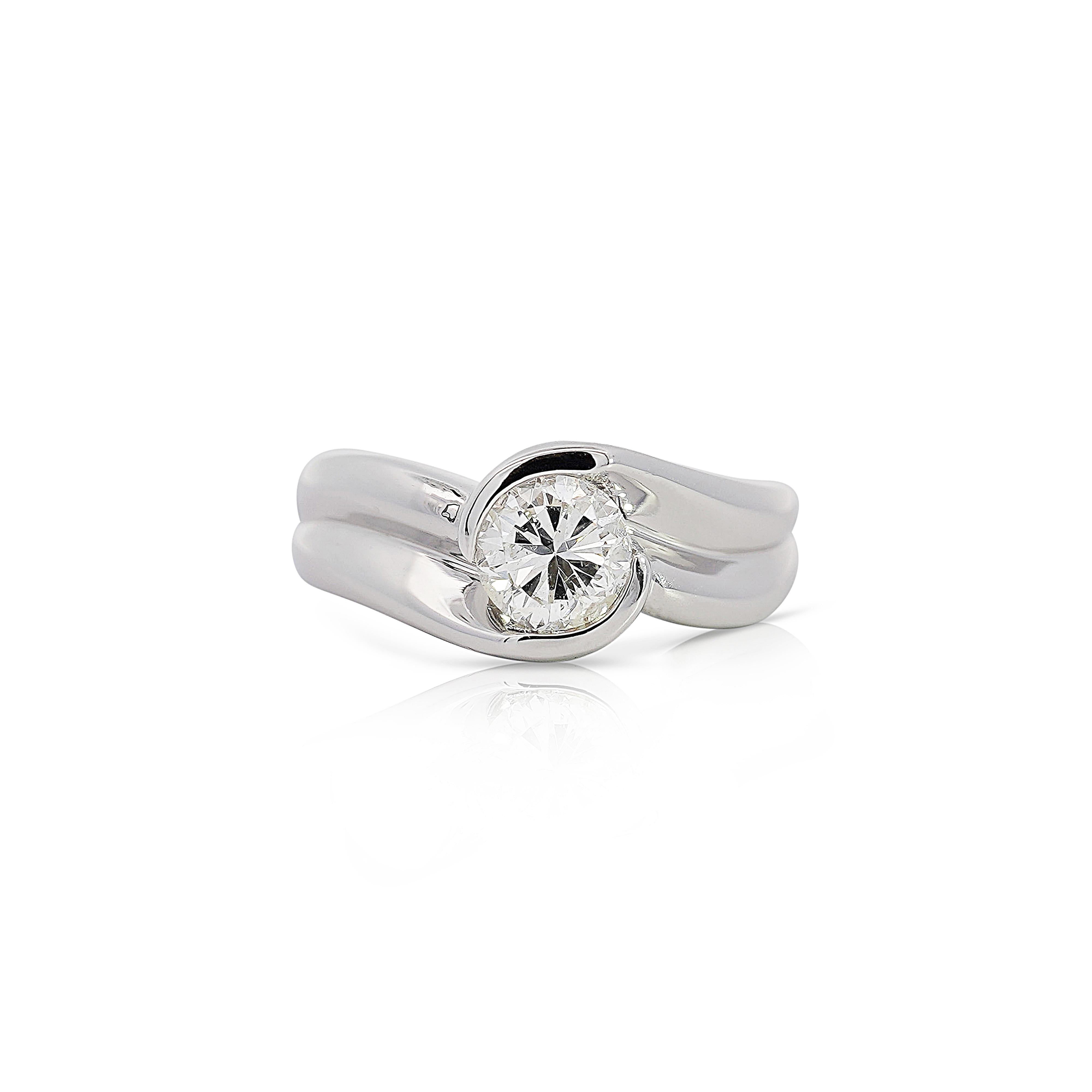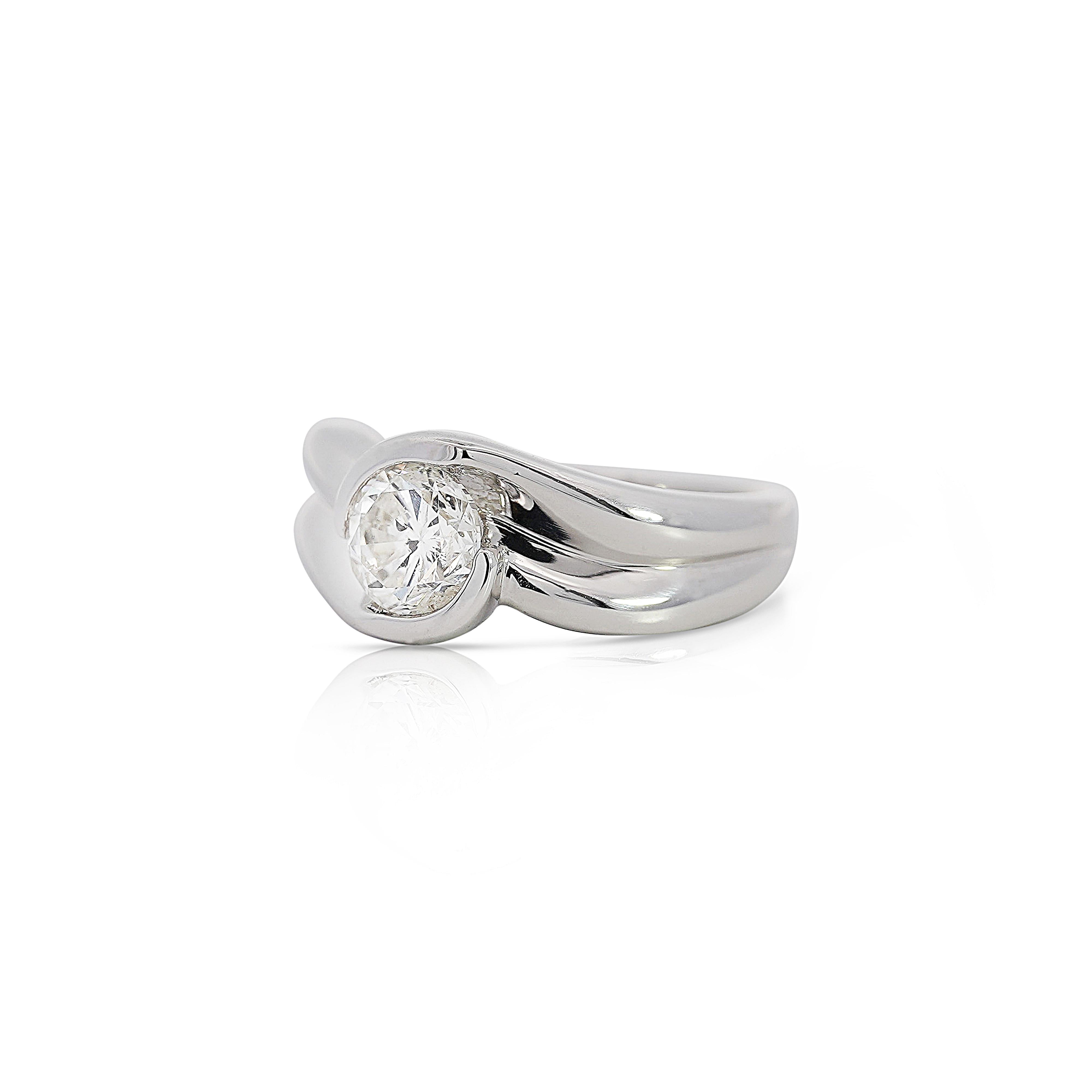 This Platinum and Diamond Bypass Ring showcases a stunning 1.01-carat round brilliant-cut diamond set in a sophisticated bypass design. Crafted from PT850 platinum, this piece radiates timeless elegance and modern style, effortlessly enhancing any attire with its bold yet graceful presence. The diamond’s F-G color and SI3 clarity ensure an exquisite sparkle, while the unique setting style draws attention to the stone’s natural brilliance, making it the perfect symbol of understated luxury. With an EGL certificate and appraisal value, this ring offers both authenticity and elegance for those with discerning taste.