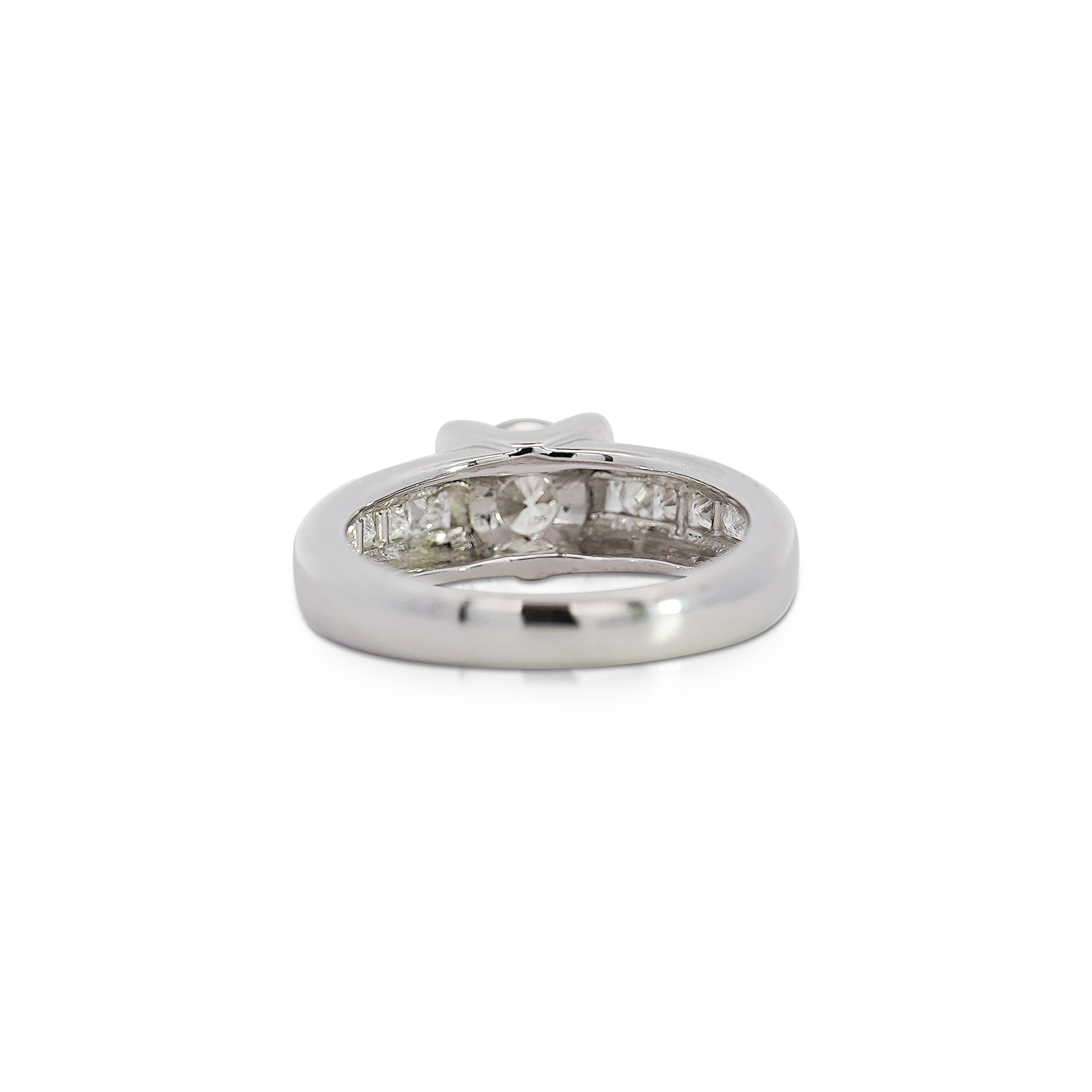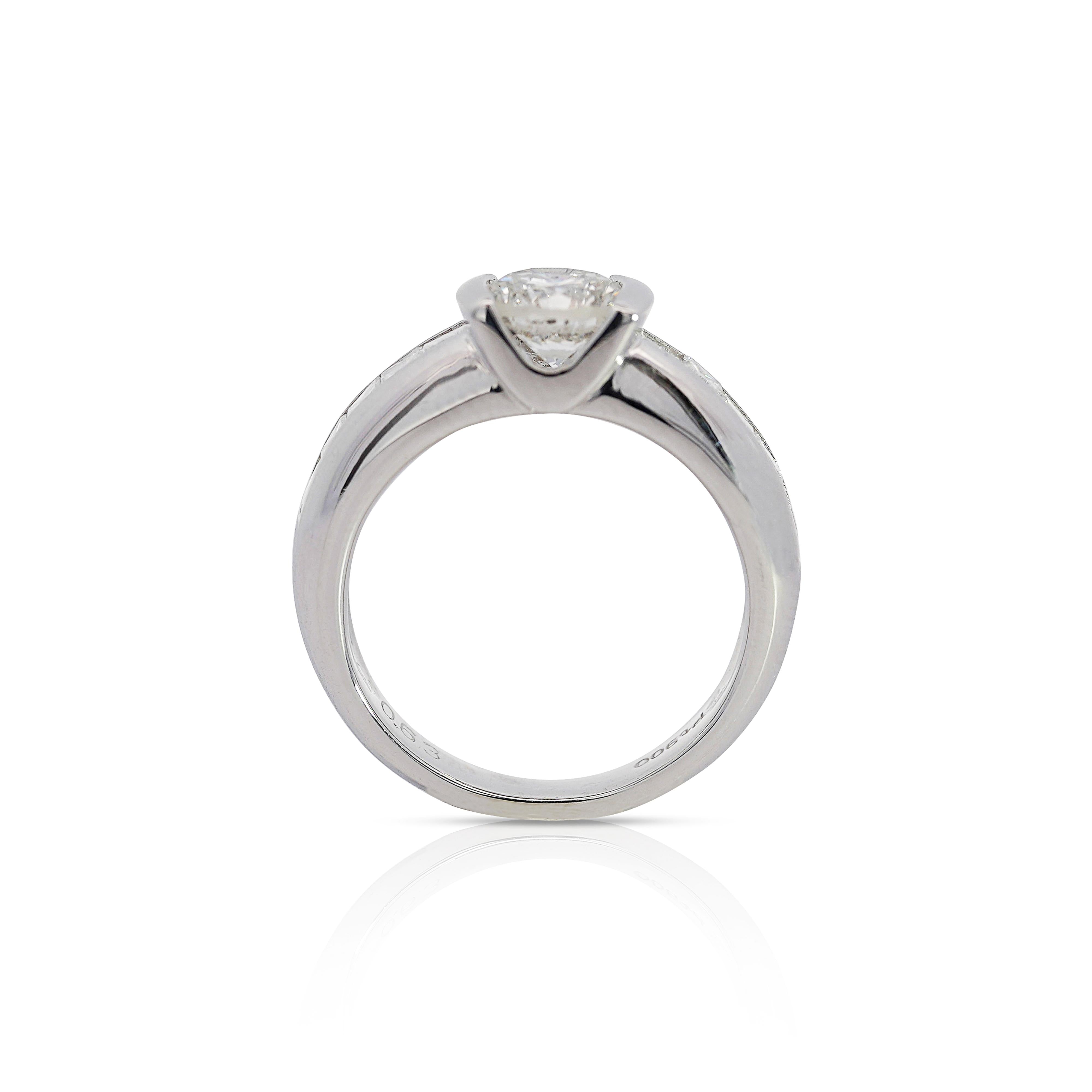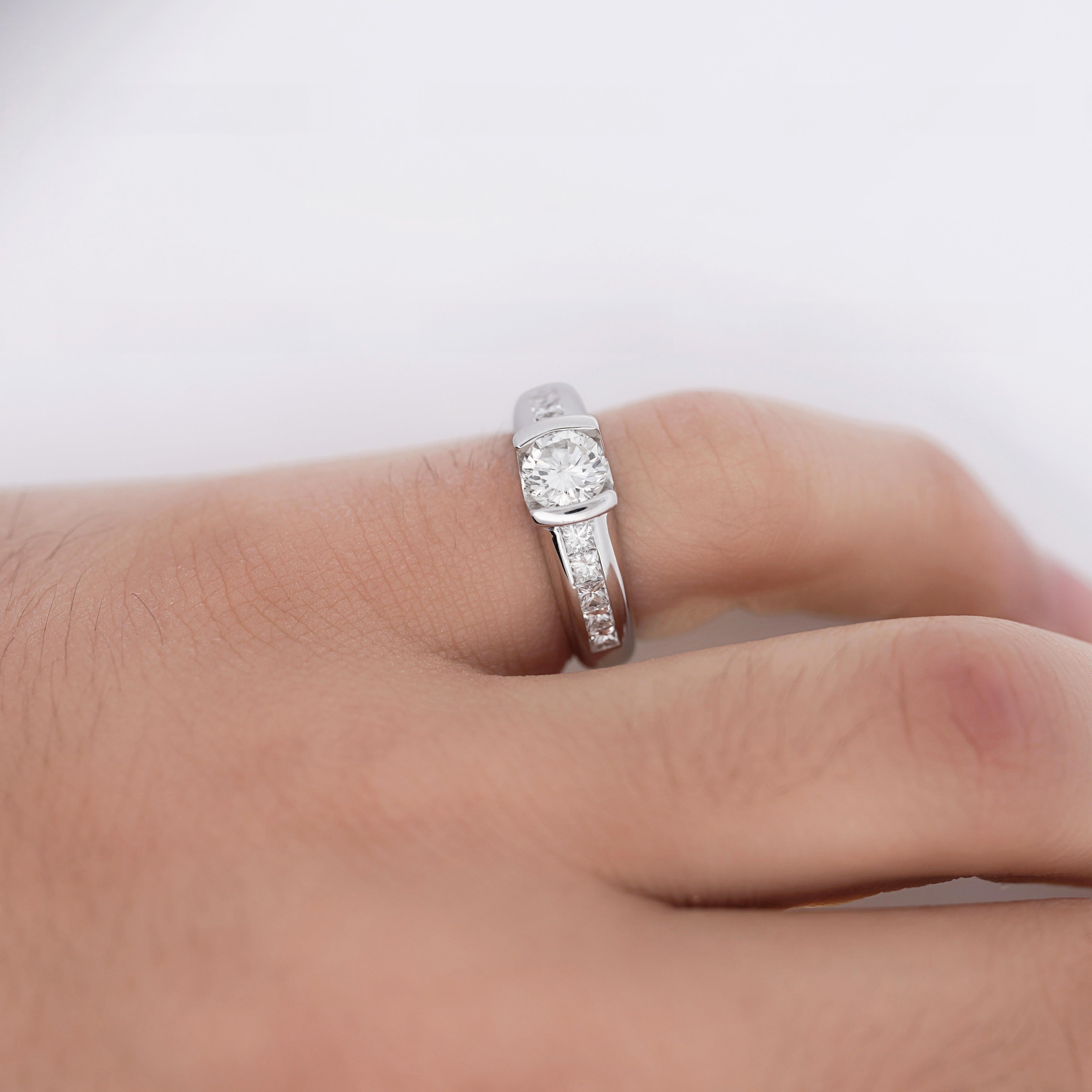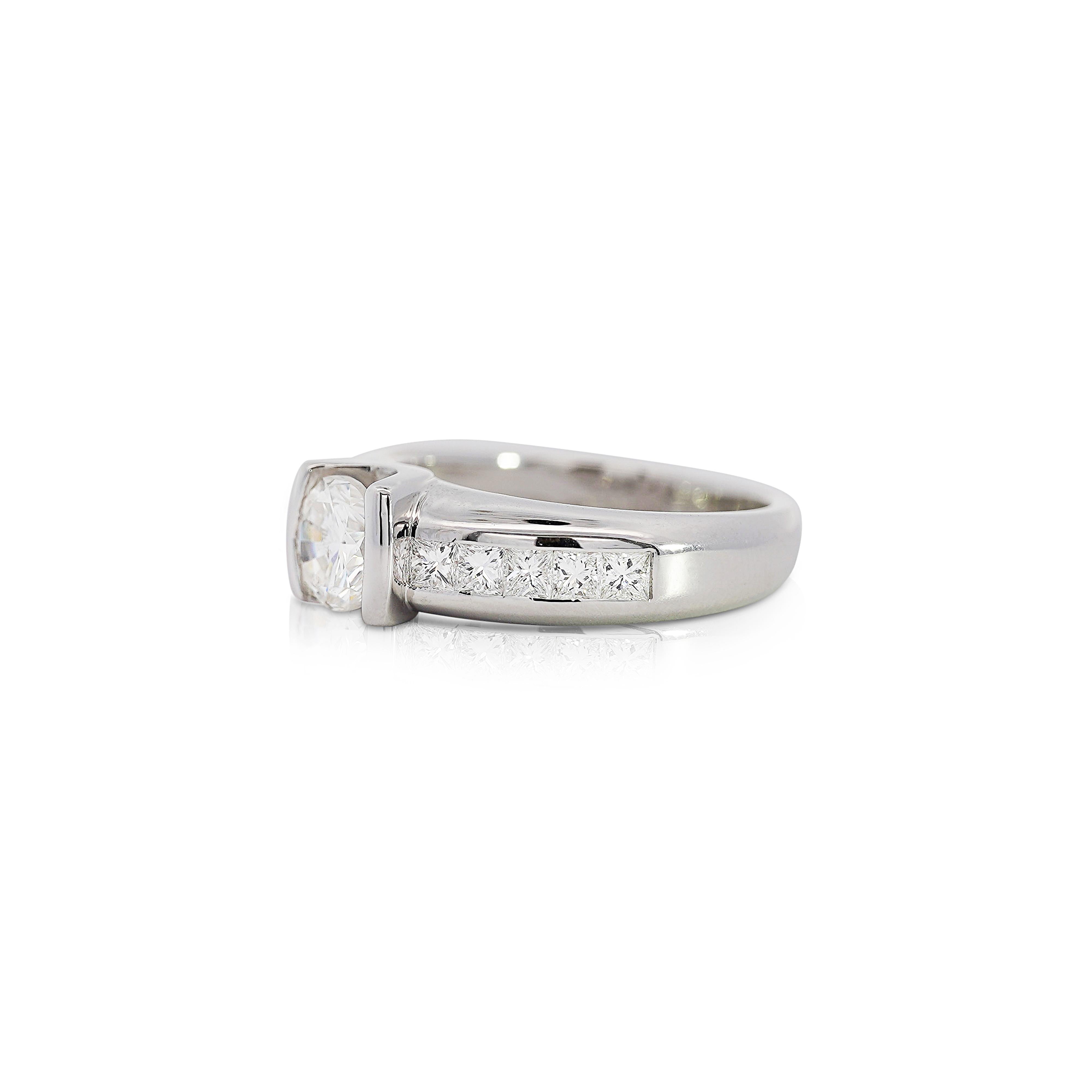 This platinum ring exudes sophistication, featuring a timeless blend of round brilliant and princess-cut diamonds. At its center lies a captivating 1.05-carat round brilliant diamond, nestled in a half-bezel setting that allows the stone’s fire to shine with brilliance. Complementing the center stone are a series of princess-cut diamonds set within a channel that adds a touch of elegance and modernity to the band. Crafted in high-quality PT900 platinum, the ring is built to last and radiate luxury. Ideal for those who appreciate refined details and the enduring beauty of platinum, this piece is a perfect balance of classic and contemporary.