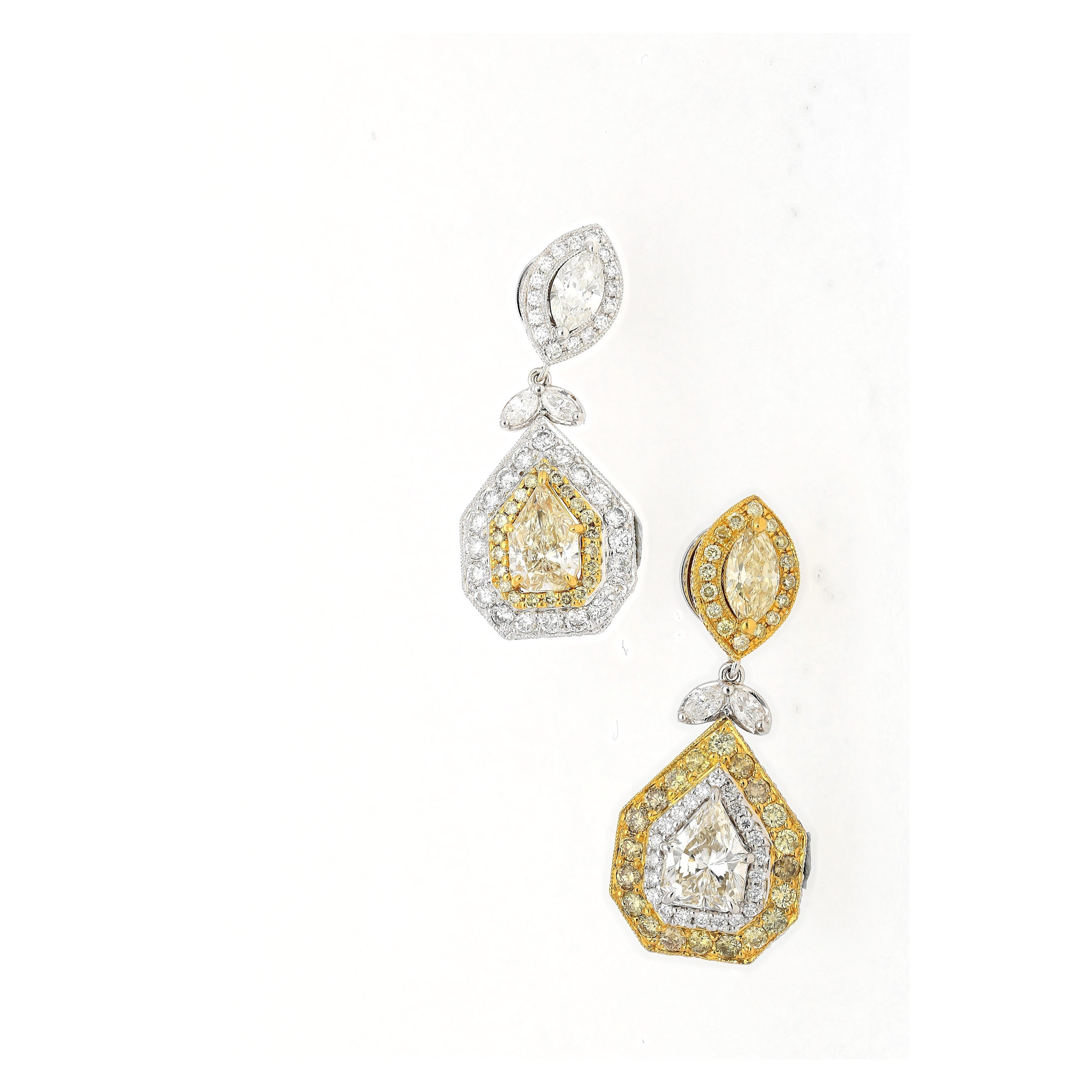 EGL certified natural diamond inverse dangle drop earrings set in two tone 18K white and yellow gold. Multi cut white and yellow diamond earrings with articulated drop design and prong settings.