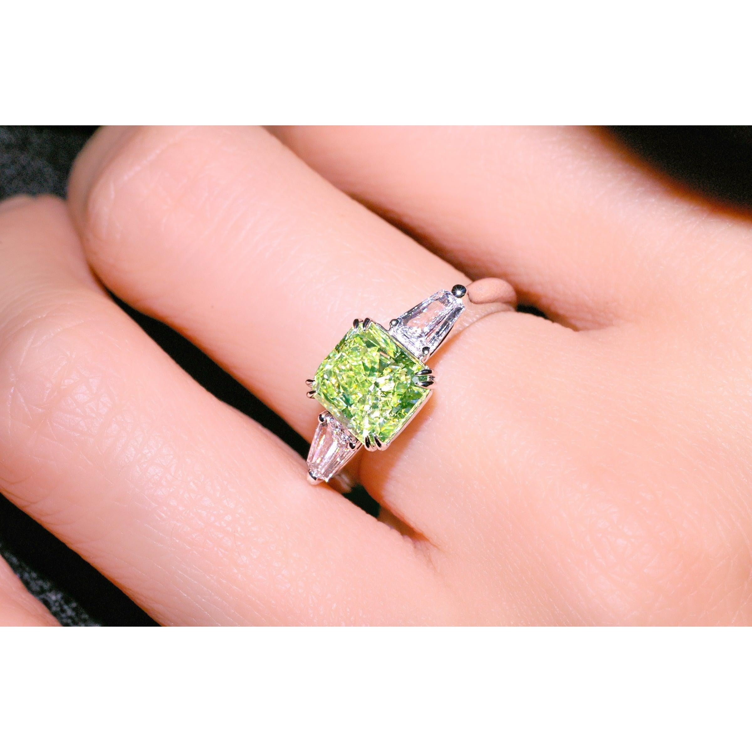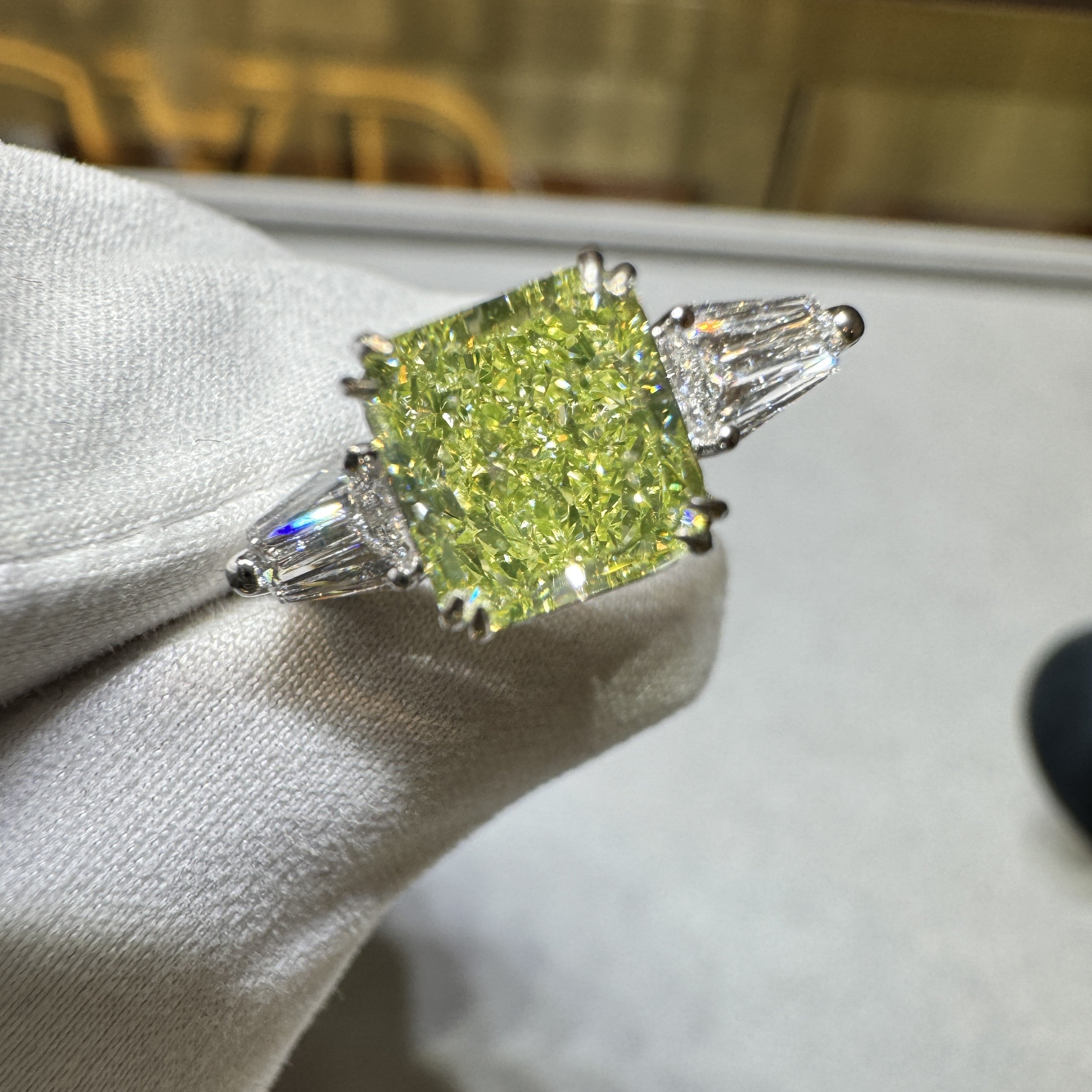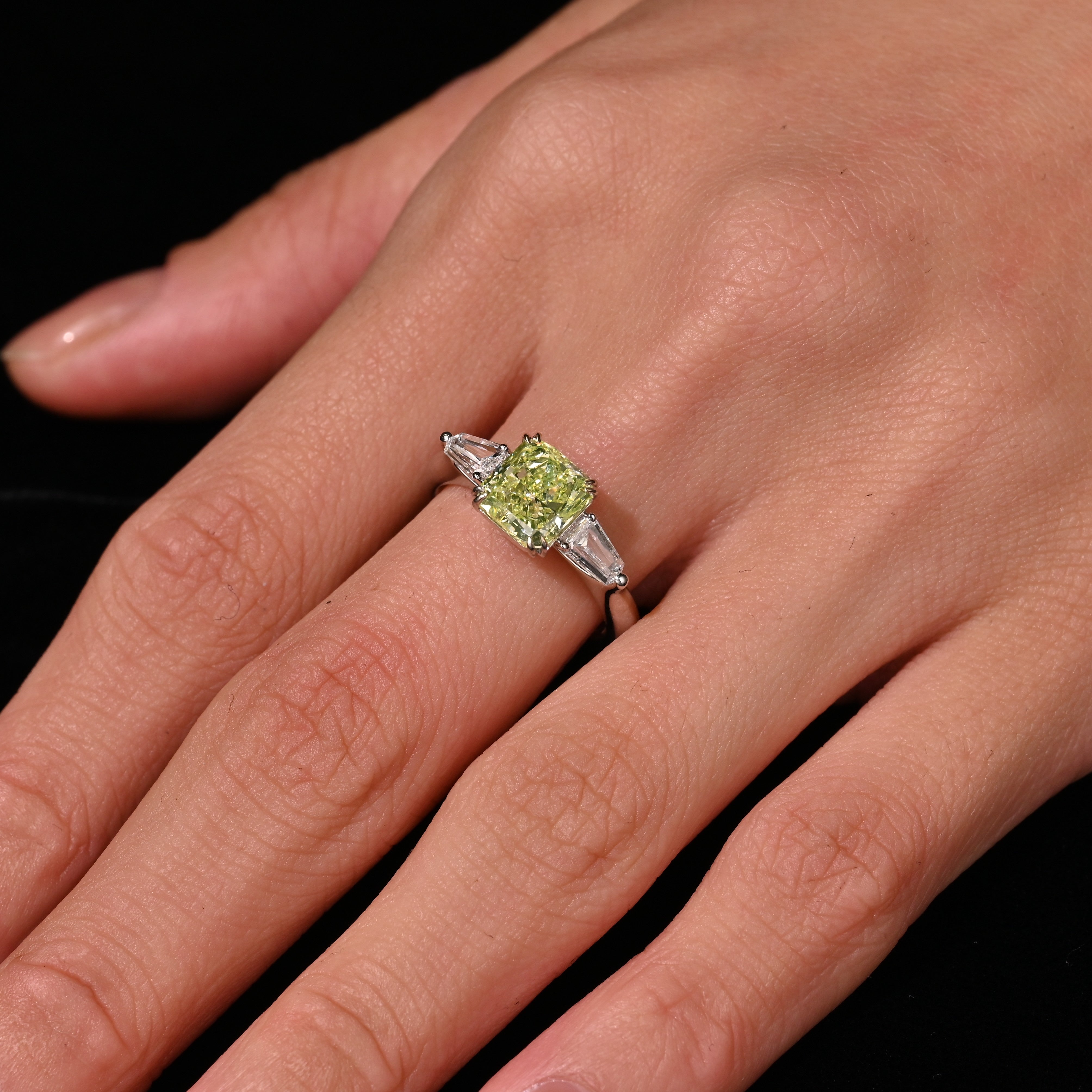 2.22 Carat Radiant Cut Fancy Yellow-Green Diamond Tapered Baguette Diamond Three Stone Ring 18K White Gold