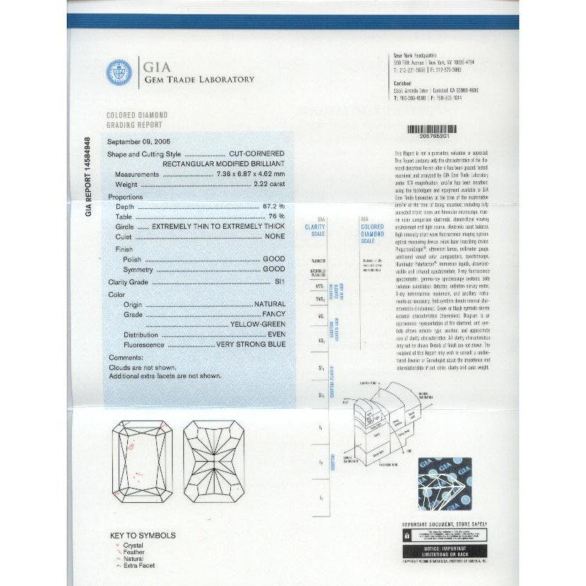 GIA certified 2.22 carat fancy yellow-green diamond set in 18K white gold three-stone ring. Radiant cut fancy yellow-green diamond with... Read more
