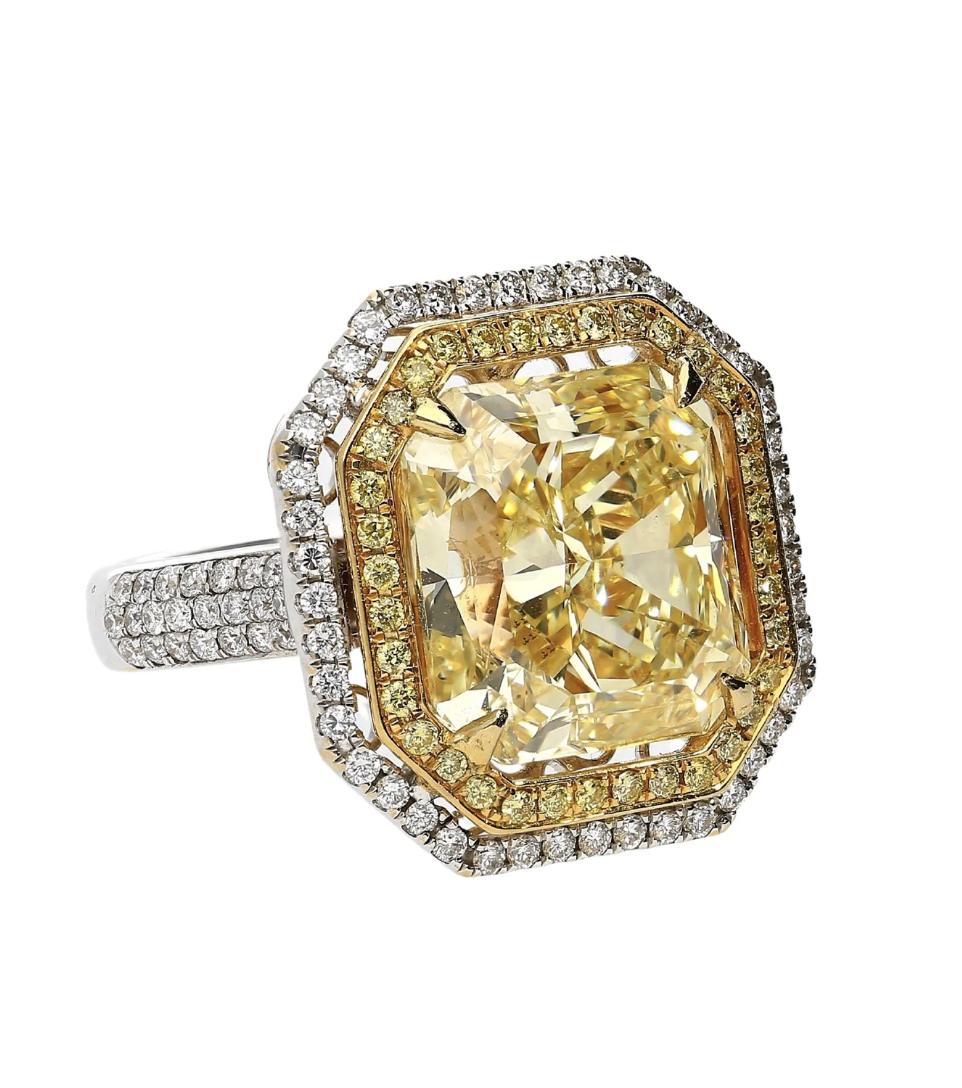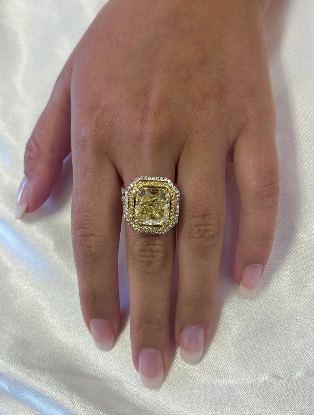 GIA 10.88 Carat Radiant Cut Fancy Yellow Diamond Double Halo Ring