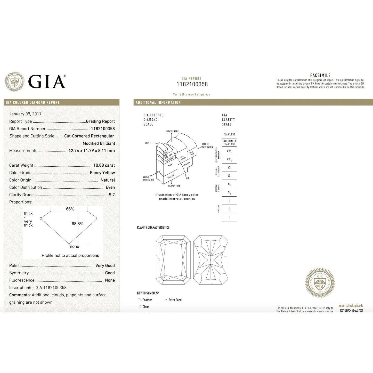 10.88 carat fancy yellow radiant cut diamond set with a 1 carat in white and yellow diamond halo. The ring... Read more
