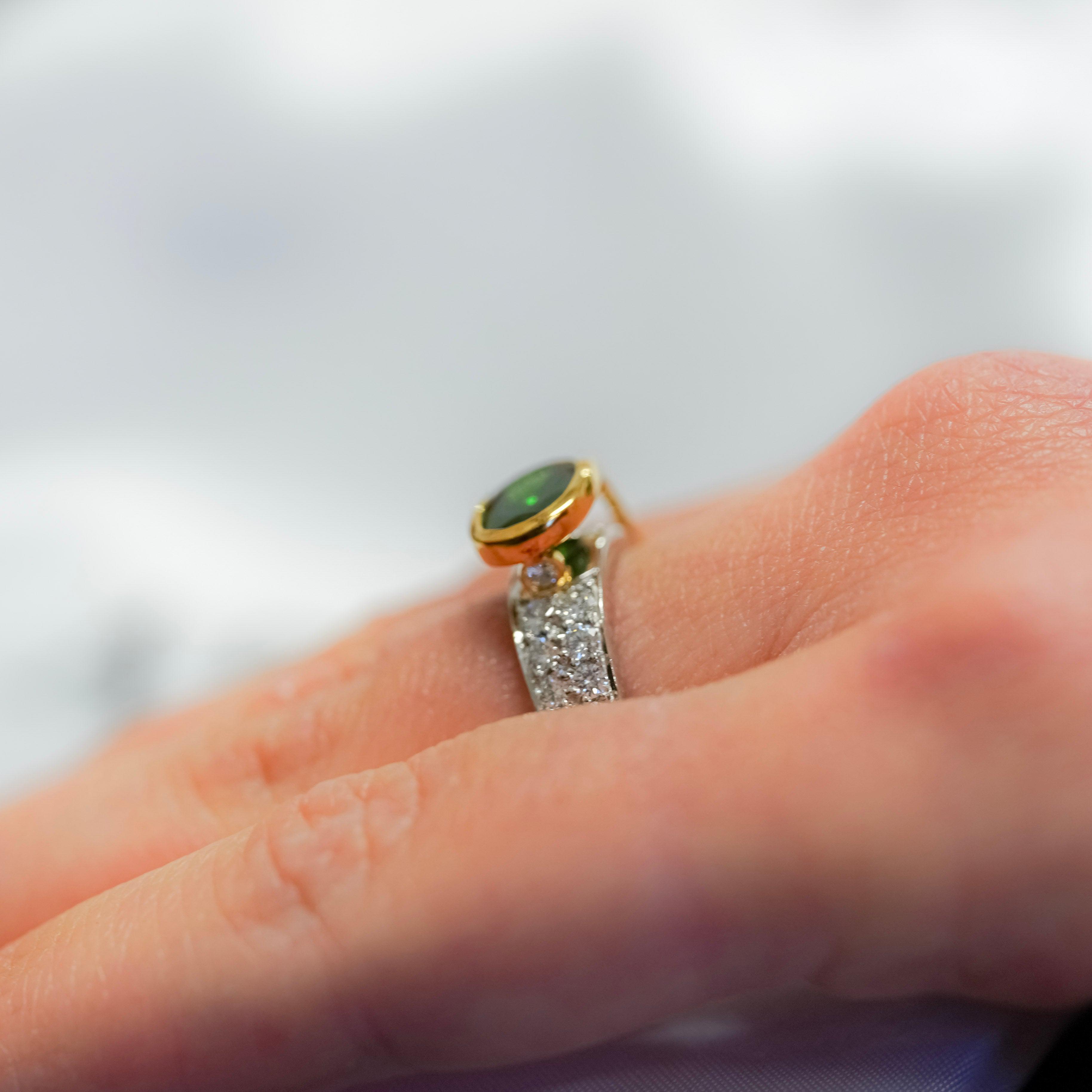 GIA certified approximately 2.50 carat natural green tsavorite set in an 18K yellow gold and platinum ring. This is an oval cut tsavorite cocktail ring with round cut diamond accents in a floating overpass design.