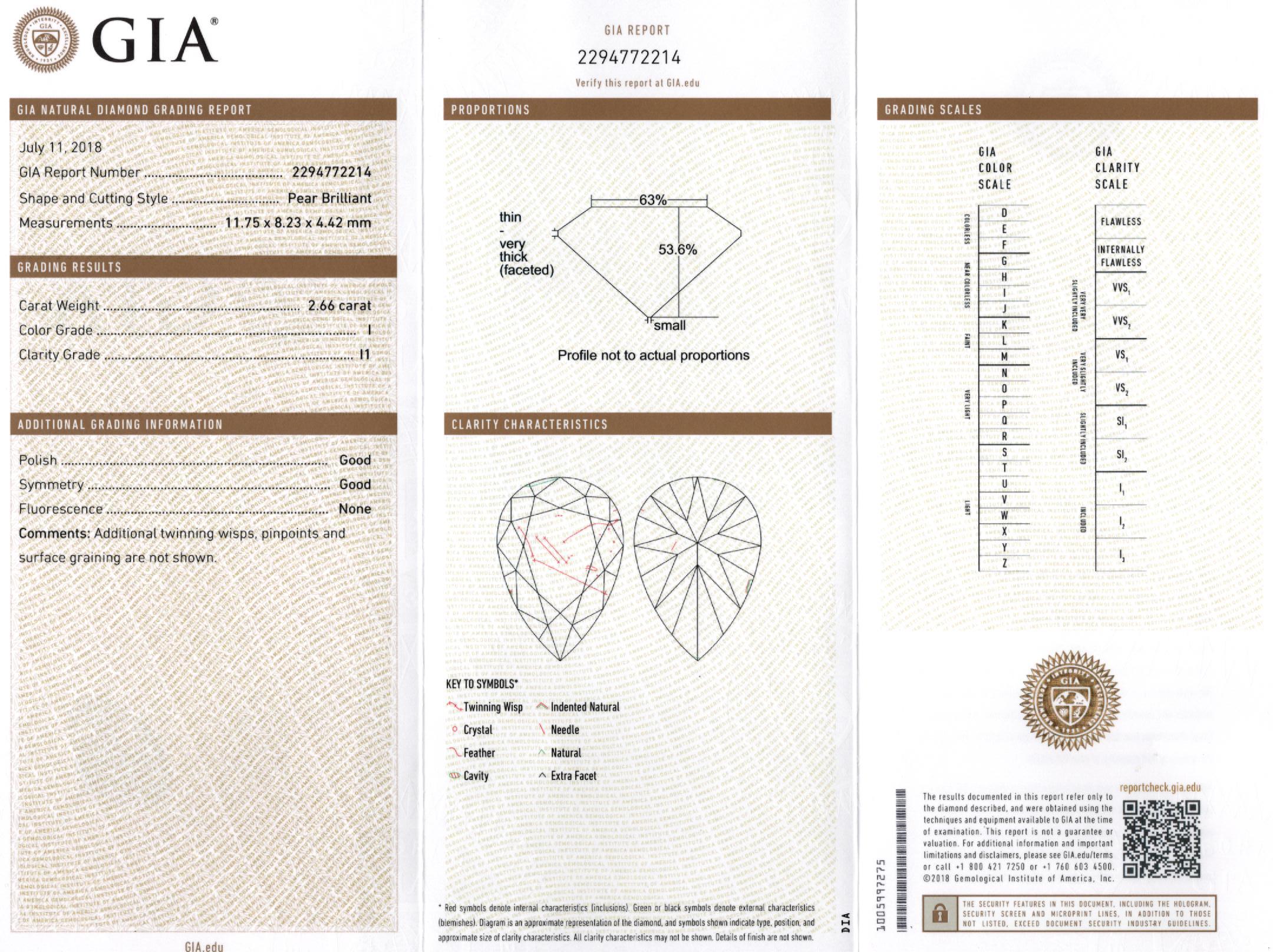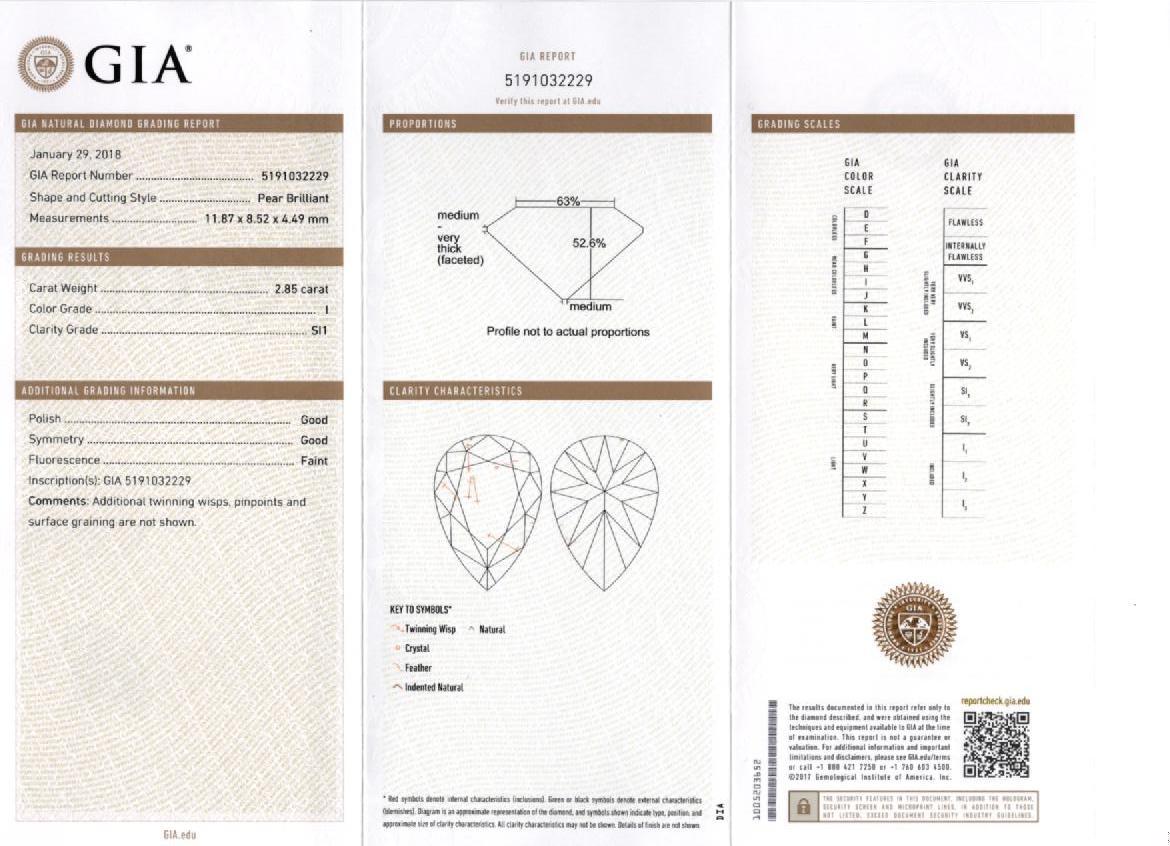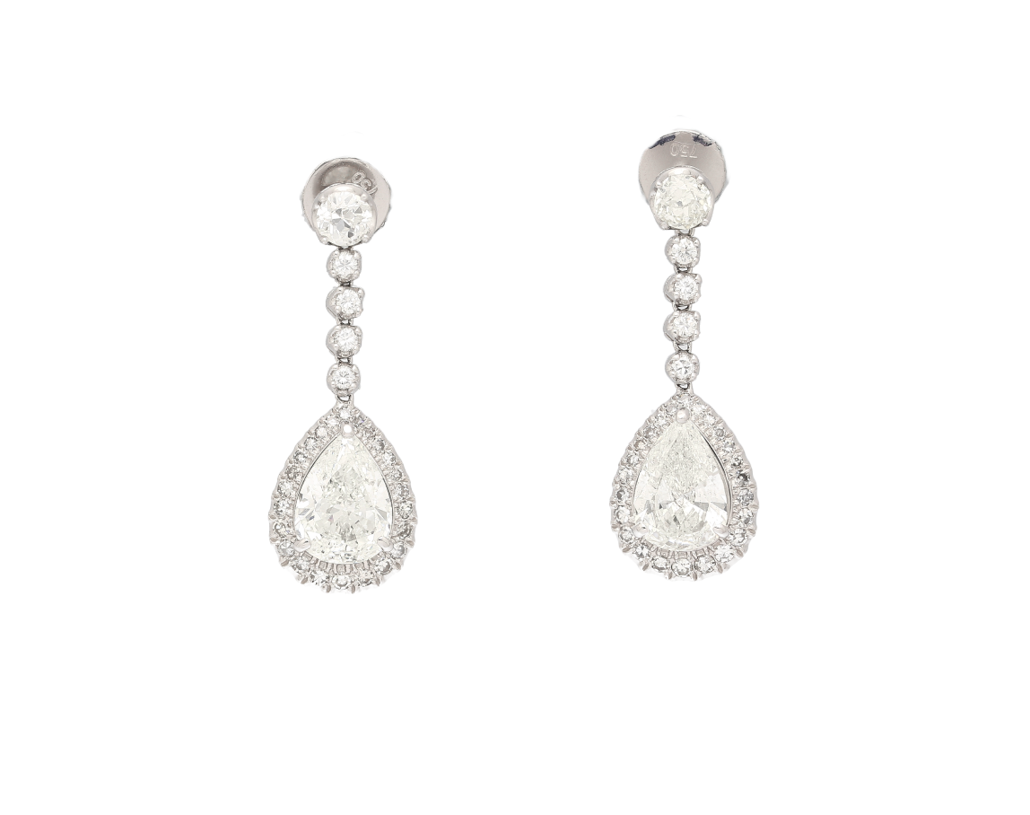 GIA certified pear cut diamond drop earrings in 18K white gold. Contemporary design with two pear cut diamonds, round brilliant... Read more