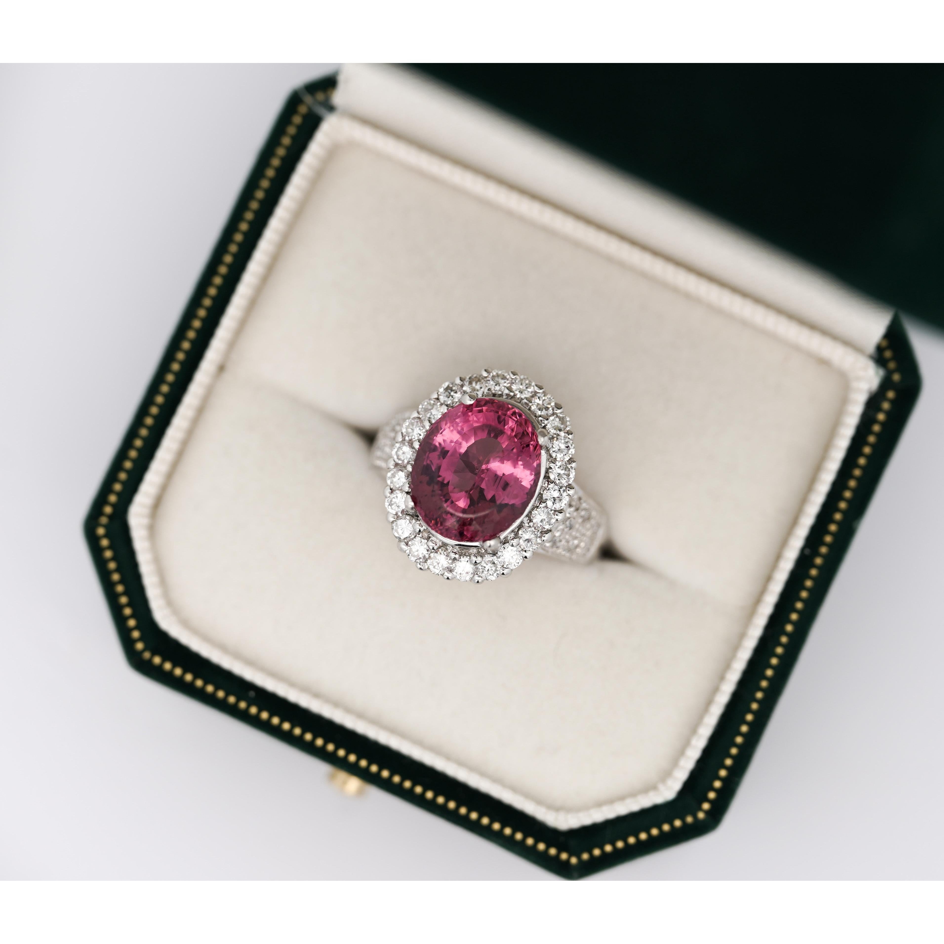 GIA certified 7.60 carat oval cut pink spinel set in a platinum ring with diamond accents. The ring has a prong set center stone with round cut diamond side stones and solid platinum construction.