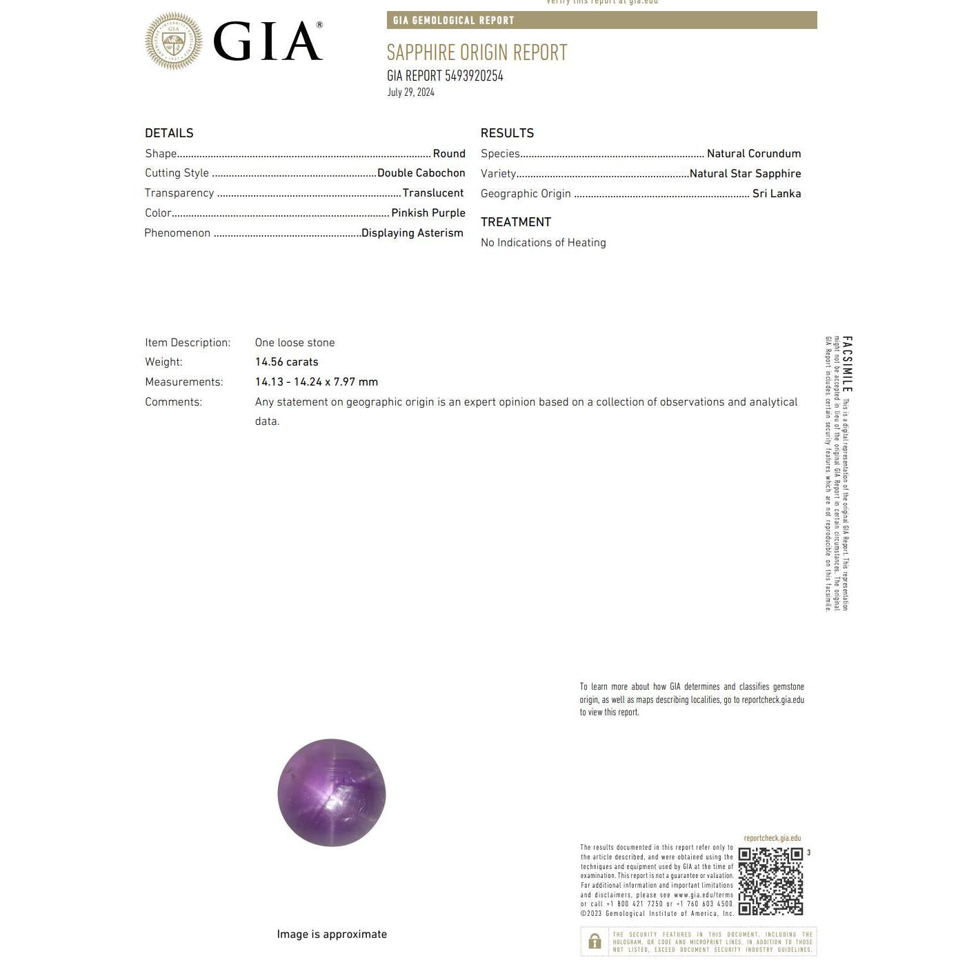 This elegant 14K gold ring features an extraordinary 14.56 Carat Star Purple Sapphire from Sri Lanka, which is prized for its deep purple hue and prevalent natural star pattern (asterism). The sapphire is untreated. Surrounding the sapphire are 1.02 Carat of high-quality round cut white diamonds, enhancing the brilliance of this already stunning piece. GIA Certified and weighing 6.96 grams, this ring is a rare find that is as breathtaking as it is valuable.