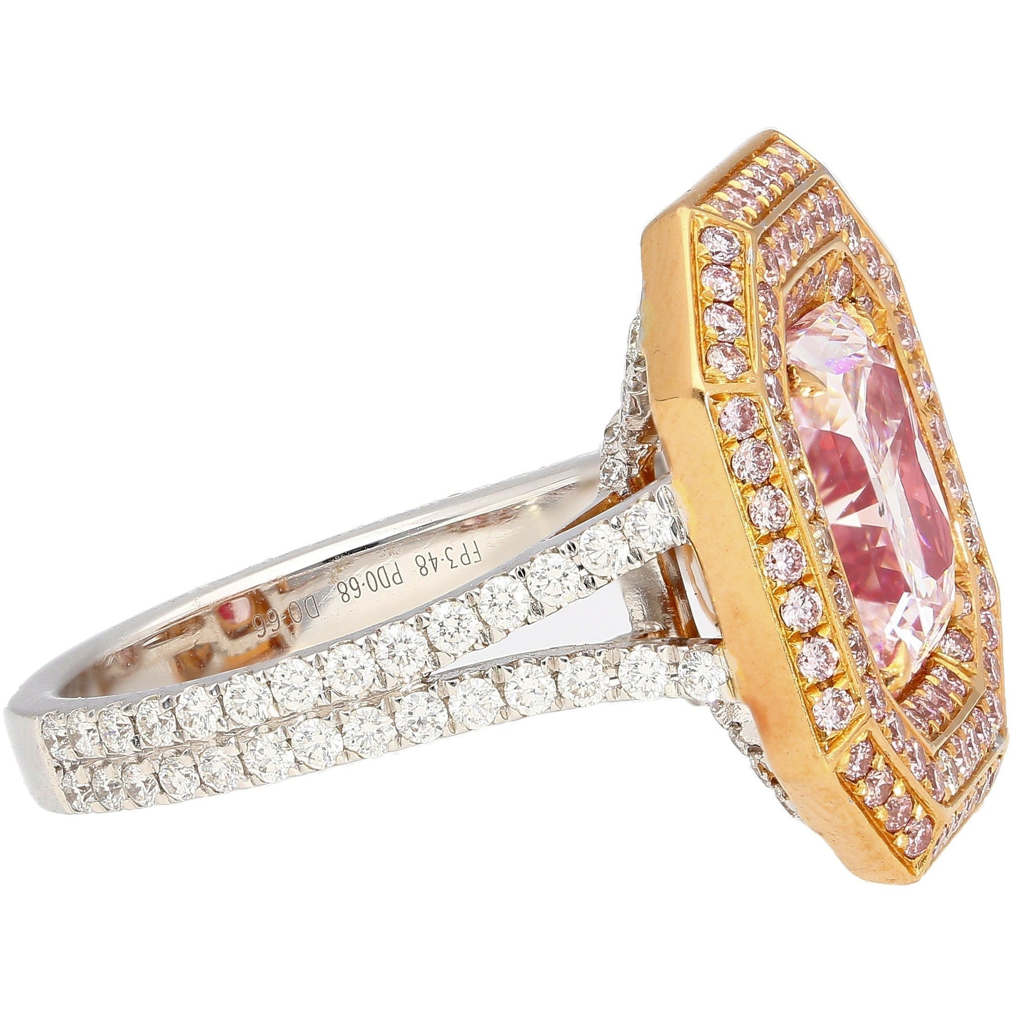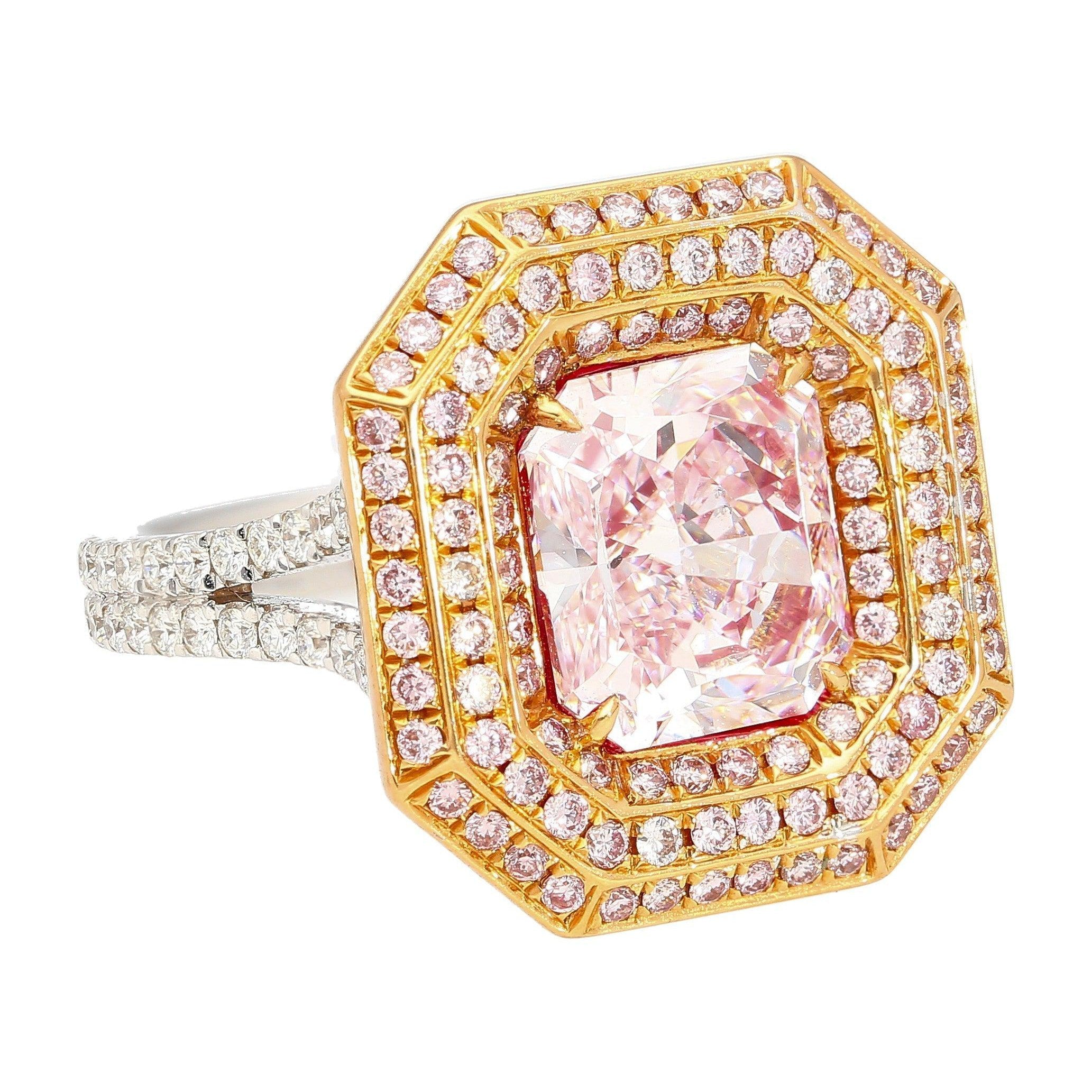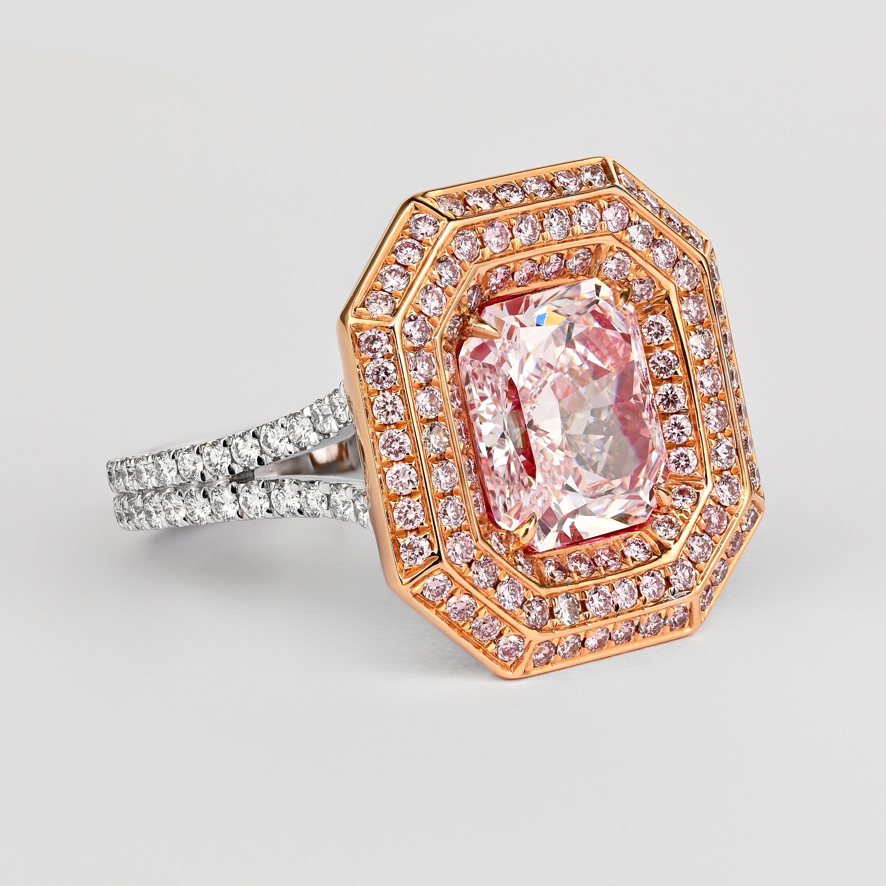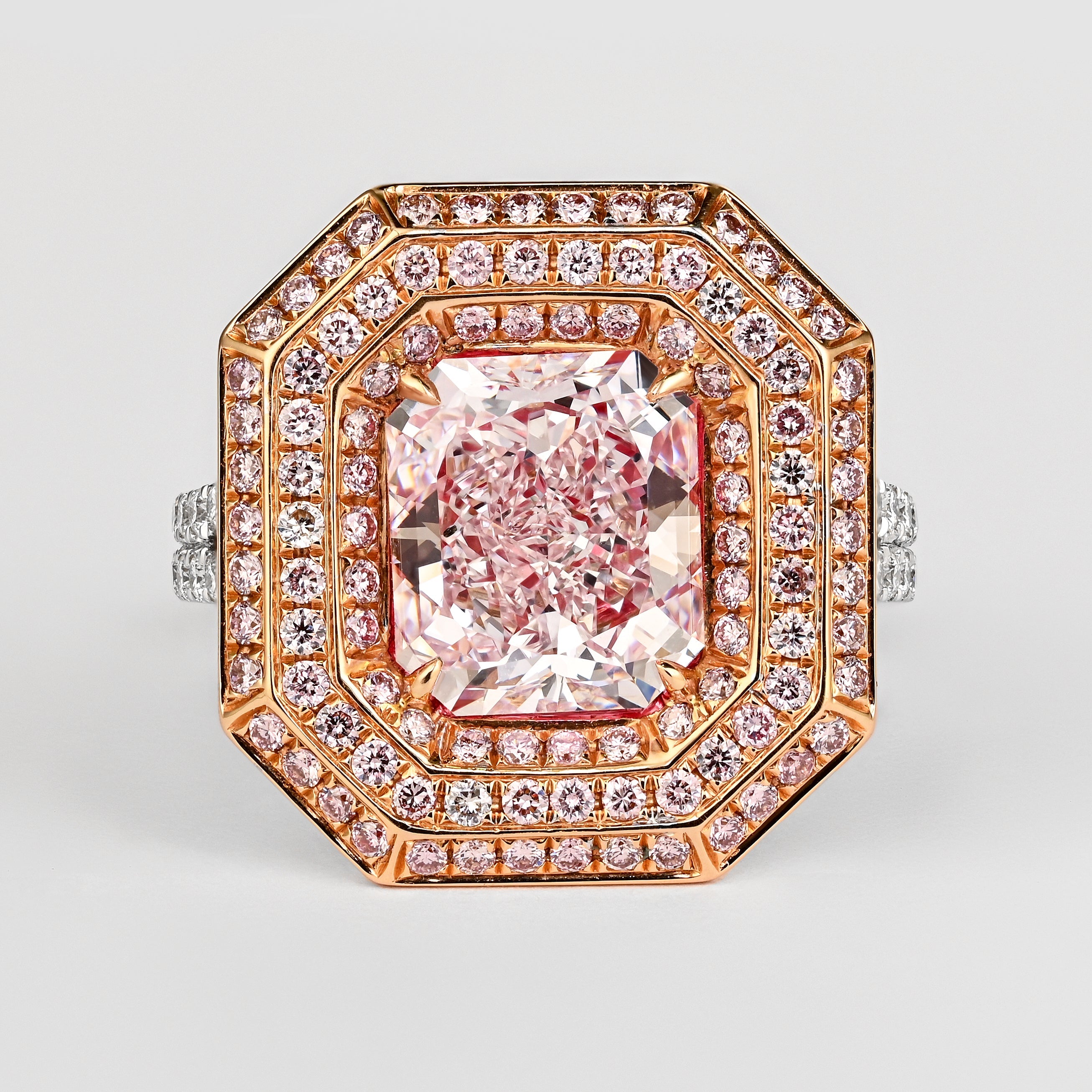 GIA Certified natural 3.48 carat light pink radiant cut SI1 clarity diamond ring. Set in 18k white and rose gold with a triple halo of round brilliant-cut pink diamonds. Wide frame with a cathedral and split shank of pave set white diamonds.