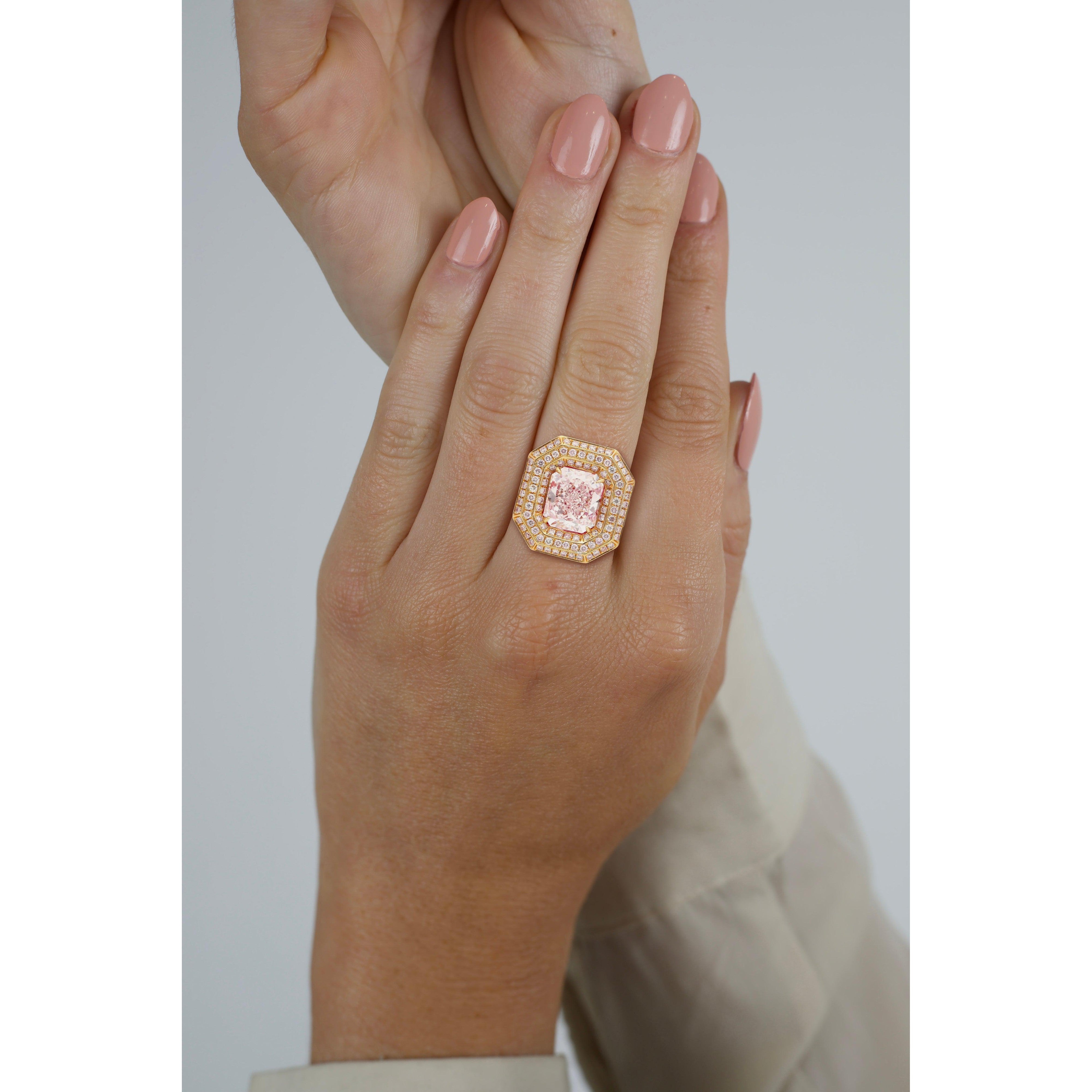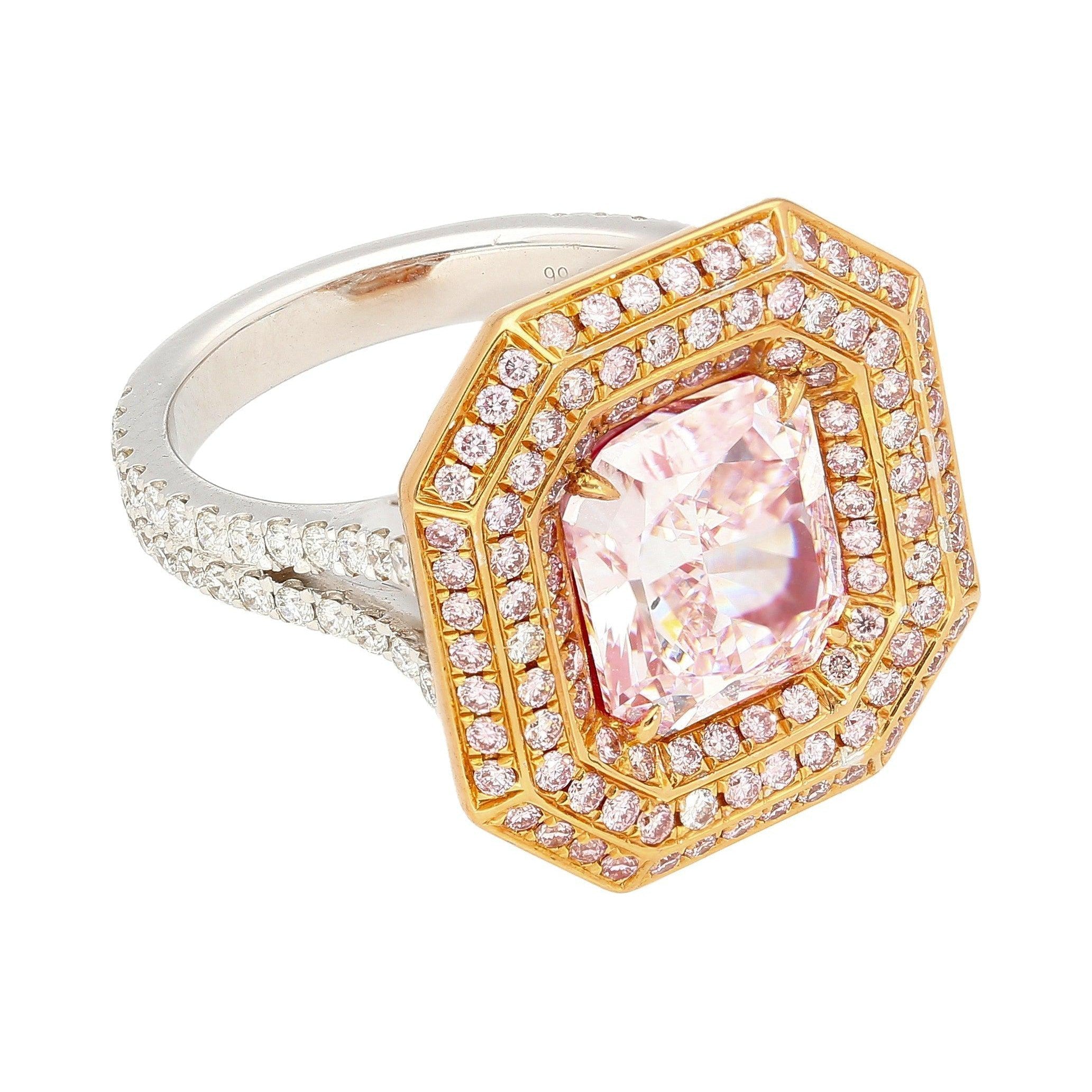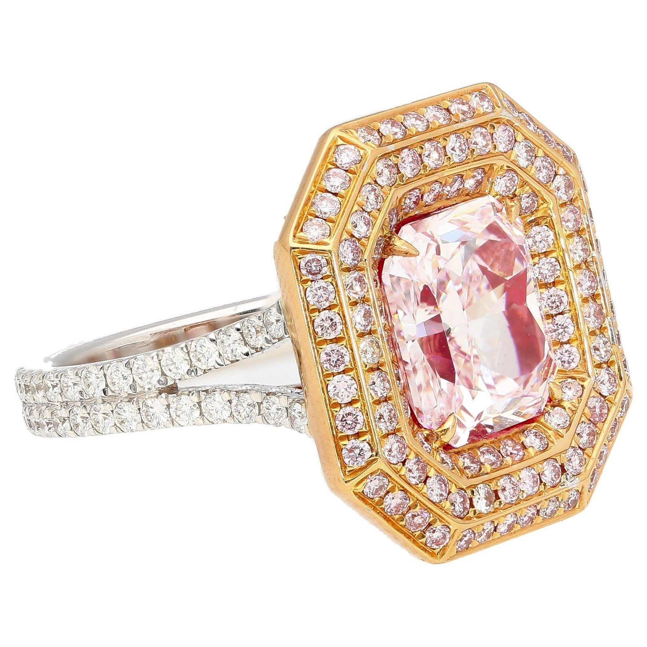 GIA Certified natural 3.48 carat light pink radiant cut SI1 clarity diamond ring. Set in 18k white and rose gold with a triple halo of round brilliant-cut pink diamonds. Wide frame with a cathedral and split shank of pave set white diamonds.